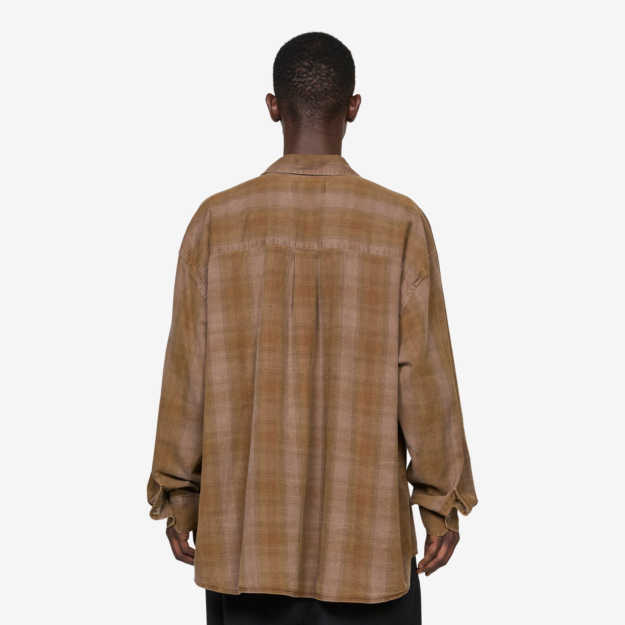 Borrowed Shirt in Dakota Flannel Check from Our Legacy. Oversized fit shirt with a spread collar, curved hem, mother of pearl button closure and mitered cuffs. Crafted from a pigment coated cotton twill in a flannel check pattern. Finished with a single patch pocket at the chest.