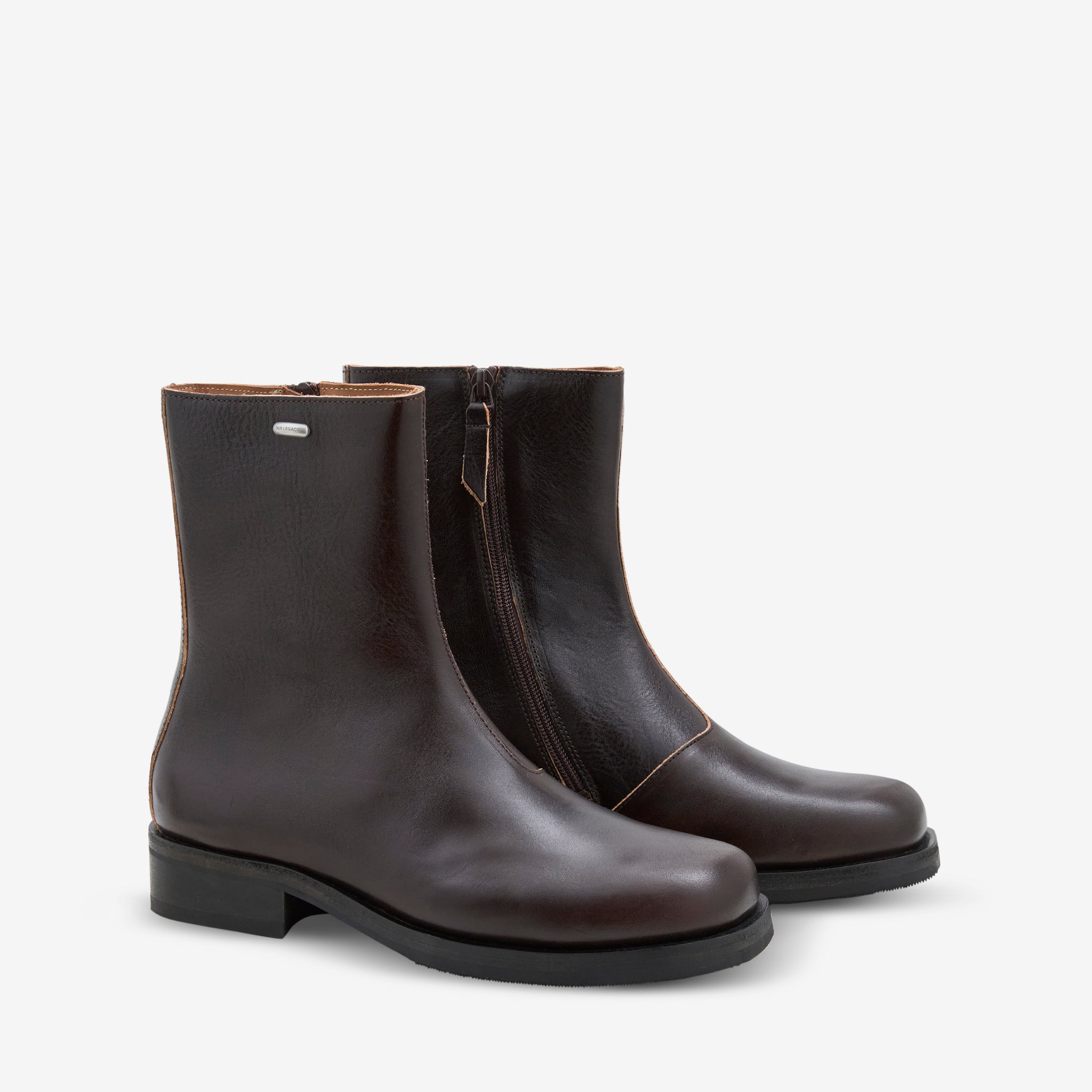 Unisex Camion Boot in Deep Americano Leather from Our Legacy. Timeless boots with side-zip pull tab closure, leather lining and a square toe silhouette. Crafted from an Italian calf leather and constructed with a tonal Vibram outsole and leather German made Kilger midsole. Finished with signature metal Our Legacy rivet at the collar.