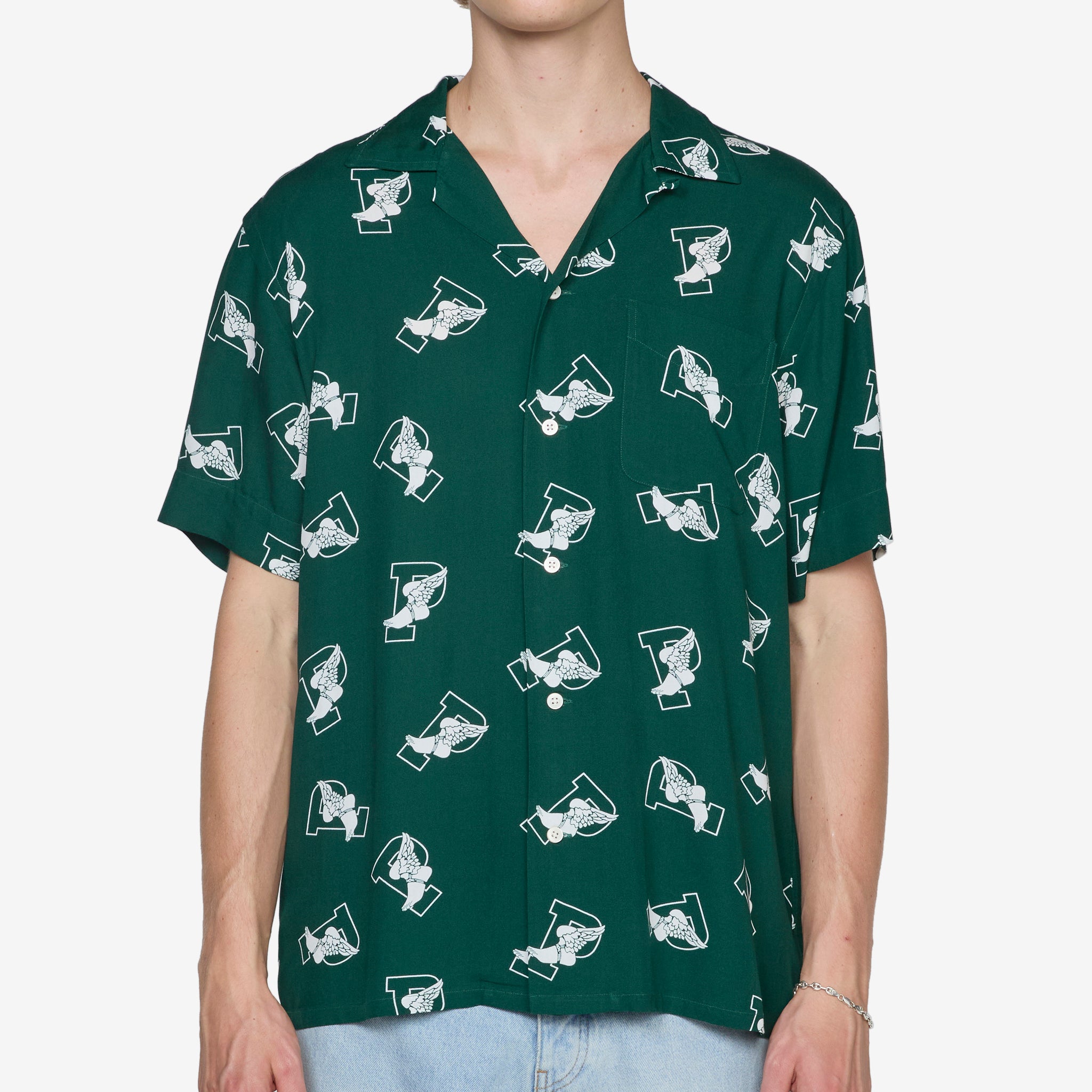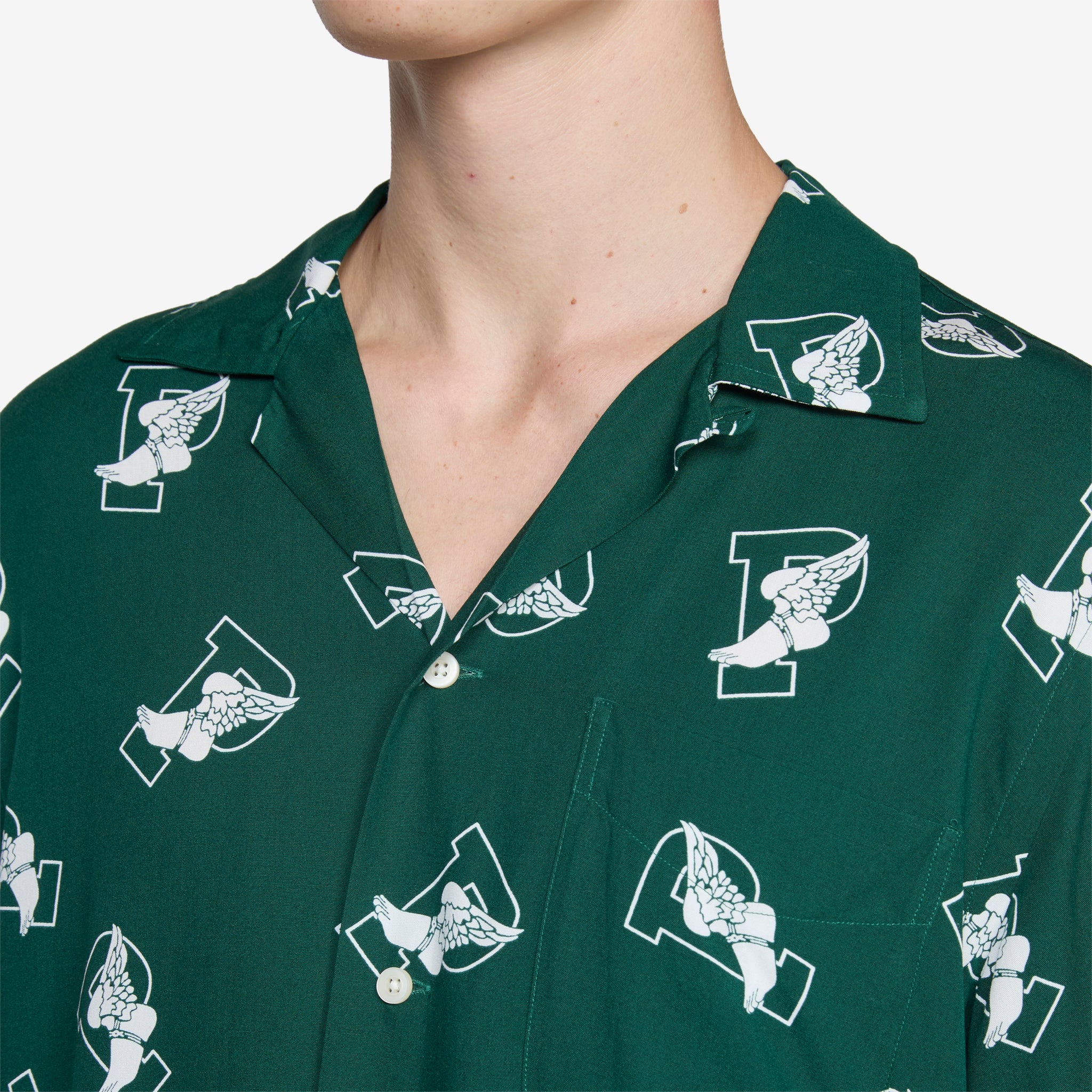 Classic Fit P-Wing Camp Shirt in 6388 P Wing Toss from Polo Ralph Lauren. Classic fit shirt with a camp collar, full button closure and a pleated back yoke. Crafted from a lightweight viscose in an all-over P-wing logo print from Ralph Lauren's 1992 Stadium collection. Finished with a single patch pocket at the chest.