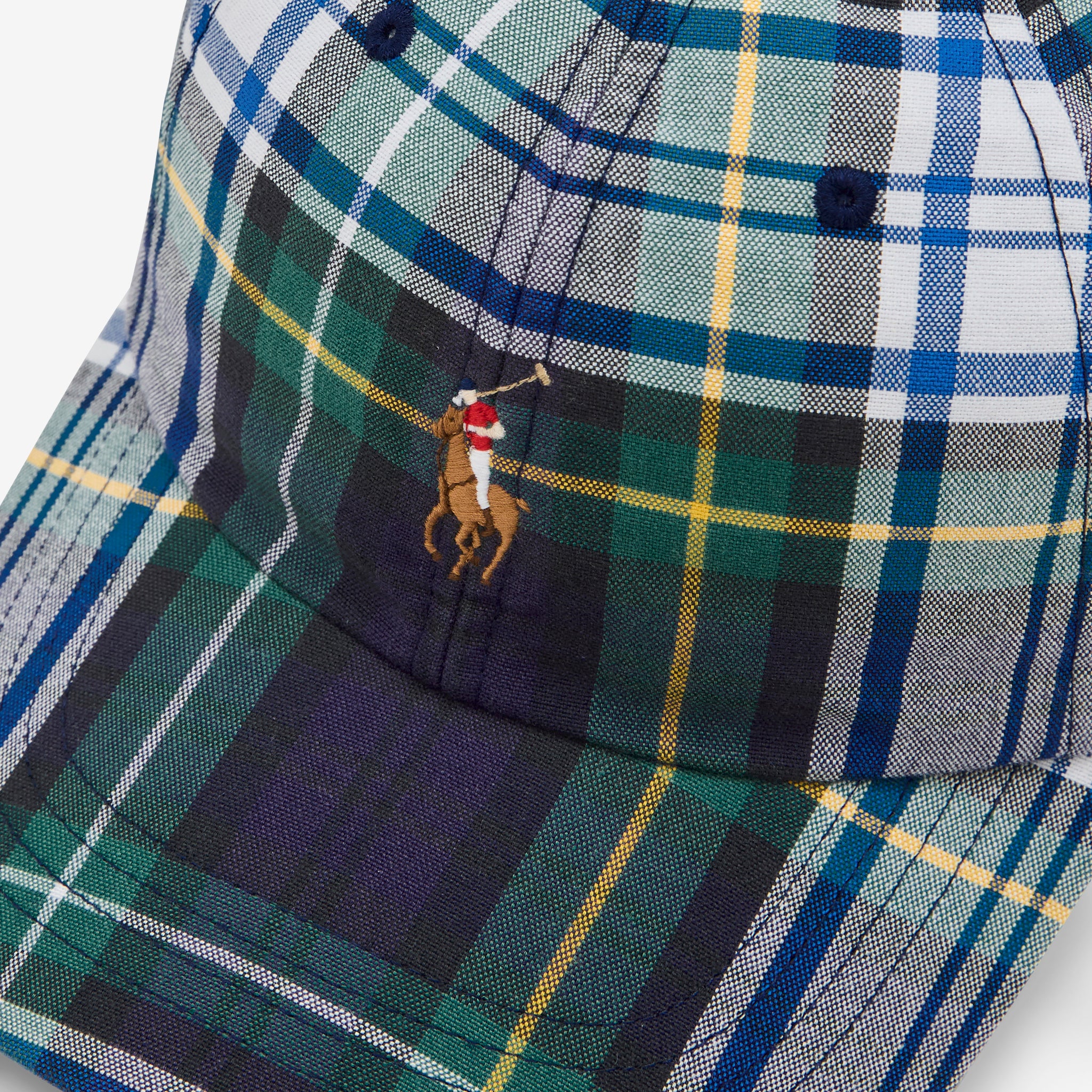 Plaid Oxford Ball Cap in White | Green from Polo Ralph Lauren. 6-panel cap with embroidered ventilating eyelets and an adjustable leather back strap. Crafted from a plaid oxford cotton and finished with branded embroidery on the front and back.