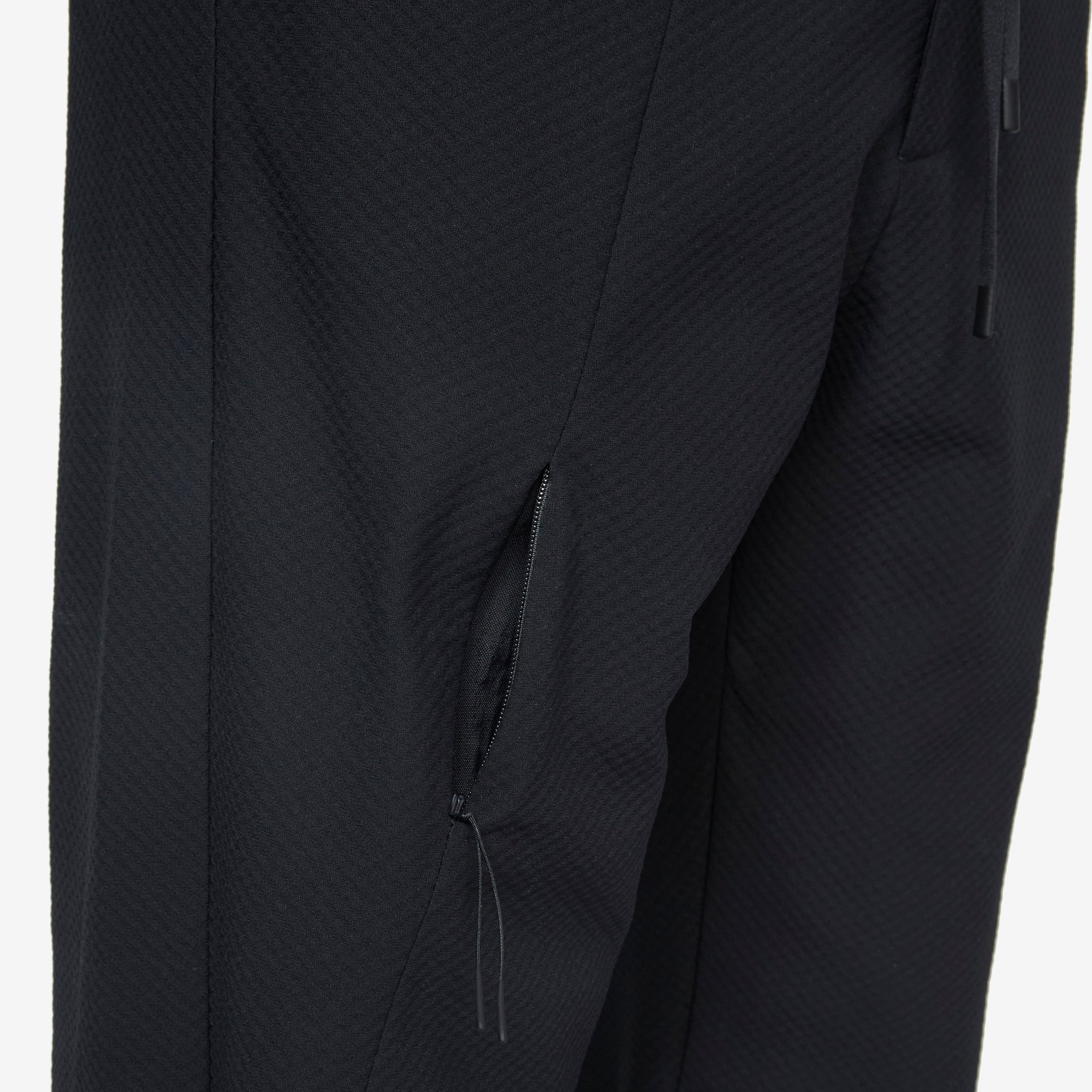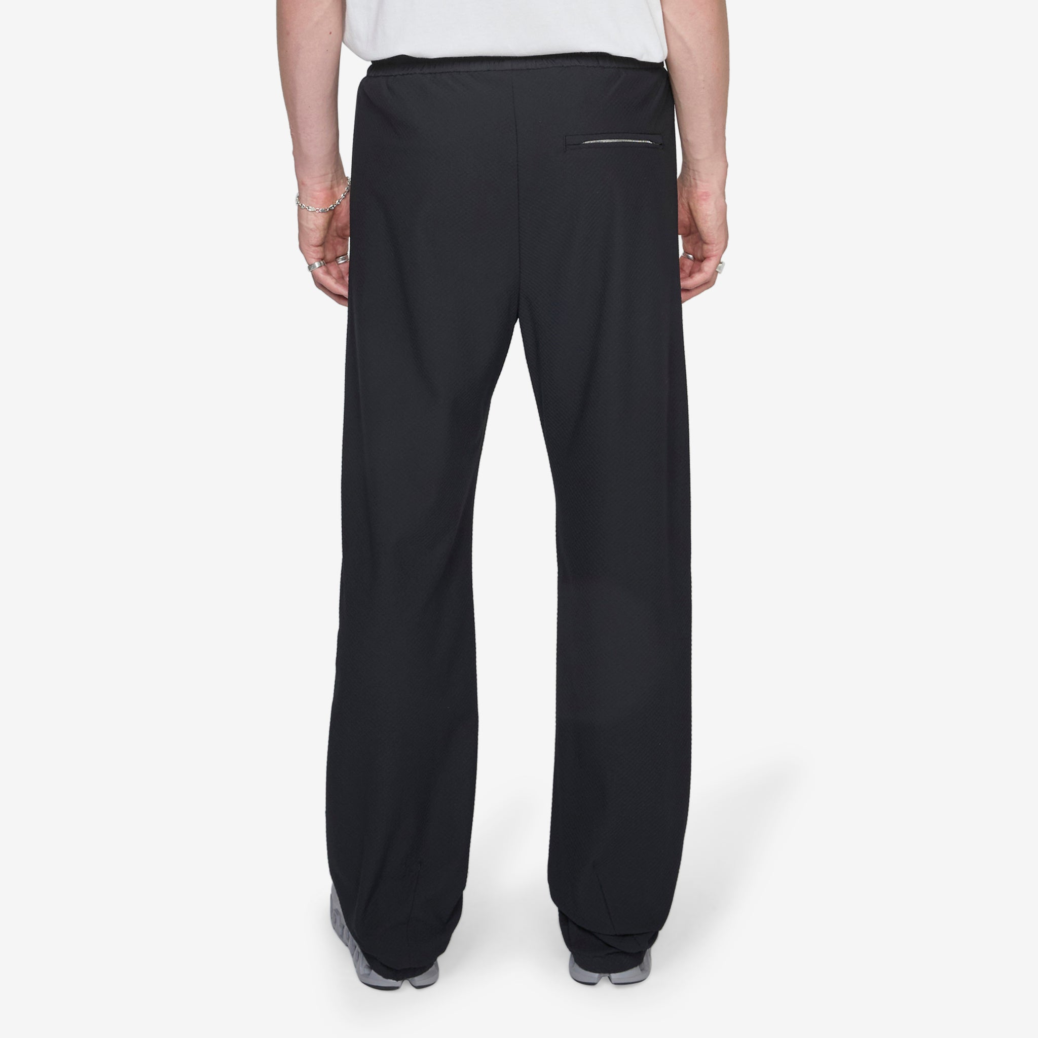 8.0 Track Pants Right in Black from Post Archive Faction (PAF). Straight-fit pants with an elasticated drawstring waistband and zip-closure back pocket. Crafted from a lightweight woven Japanese polyester in a bias check TEXBRID yarn. Finished with a distinct seamline and hidden YKK CONCEAL® zip-closure pocket at the right thigh.