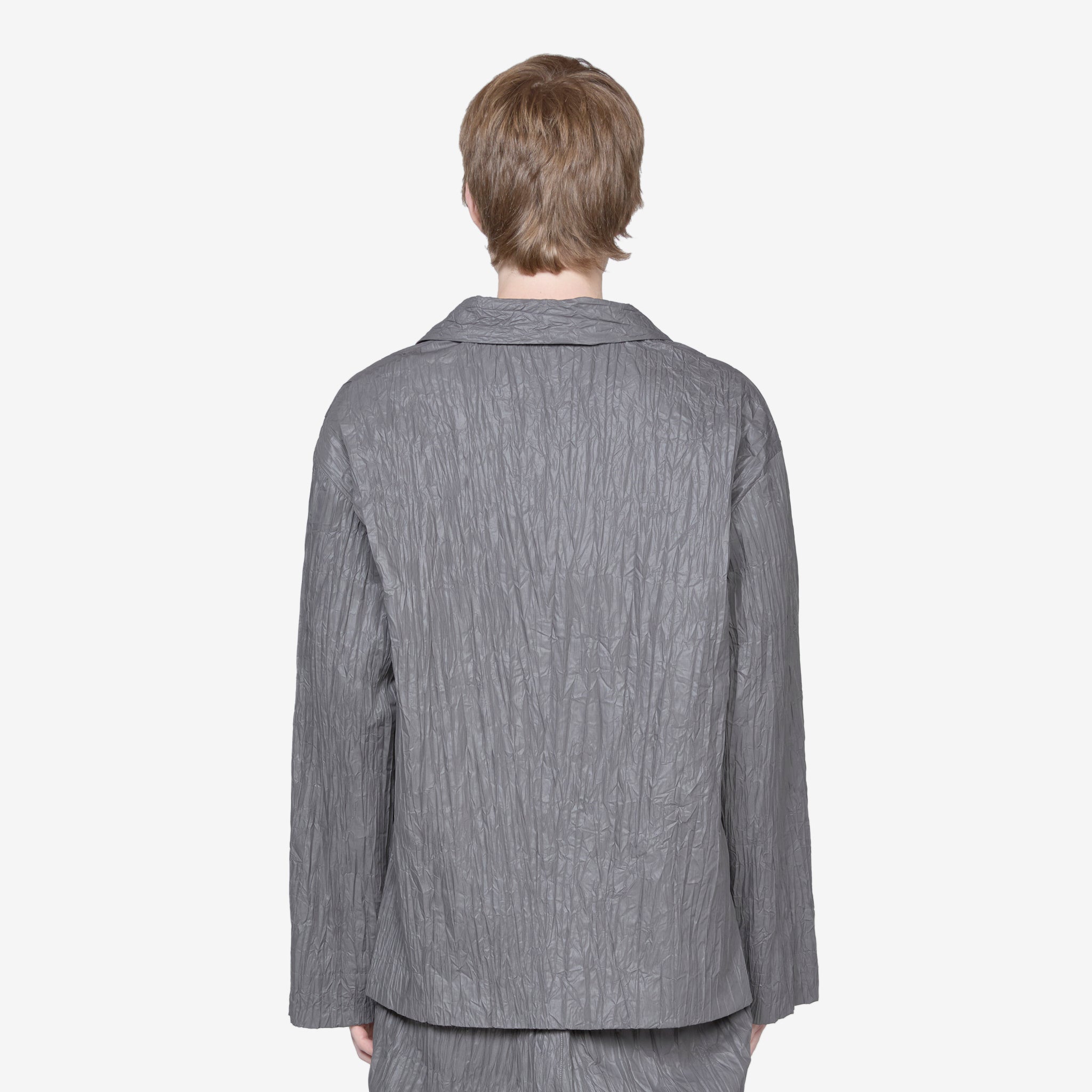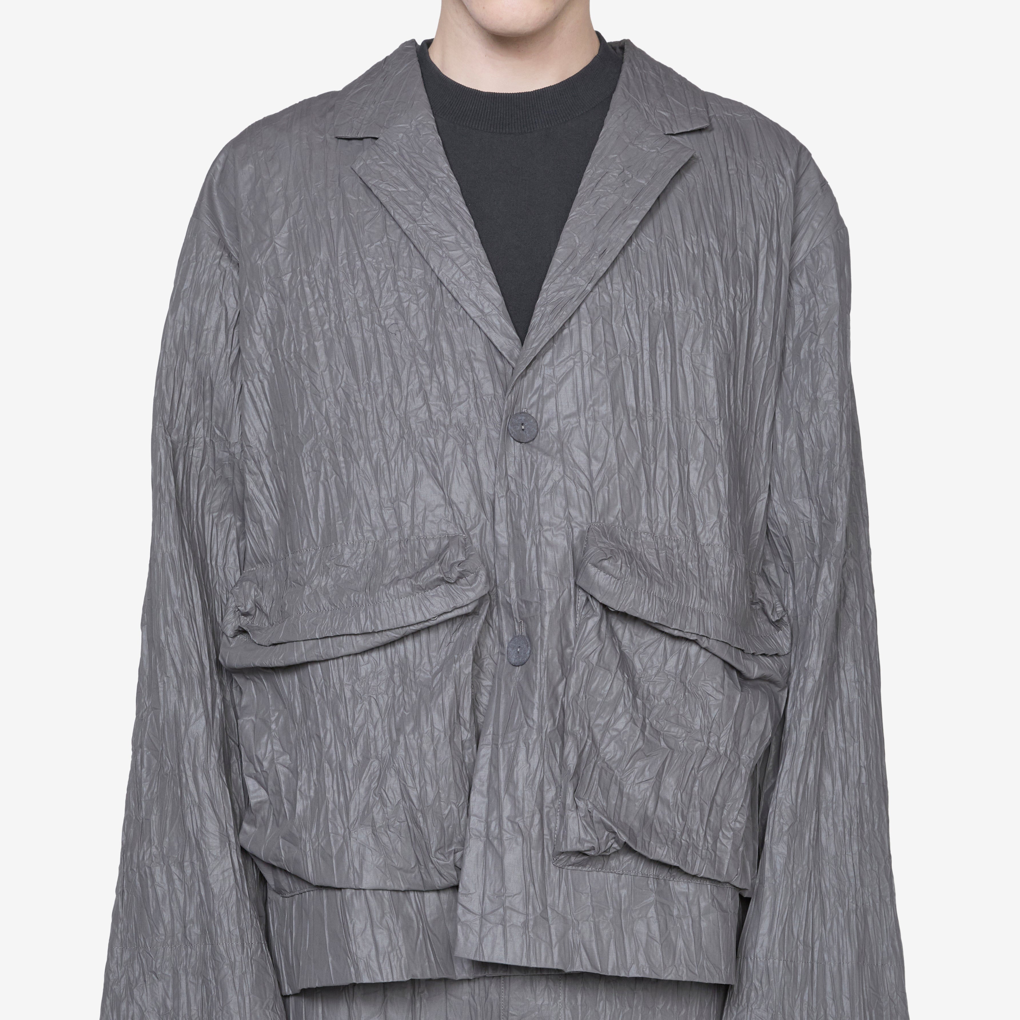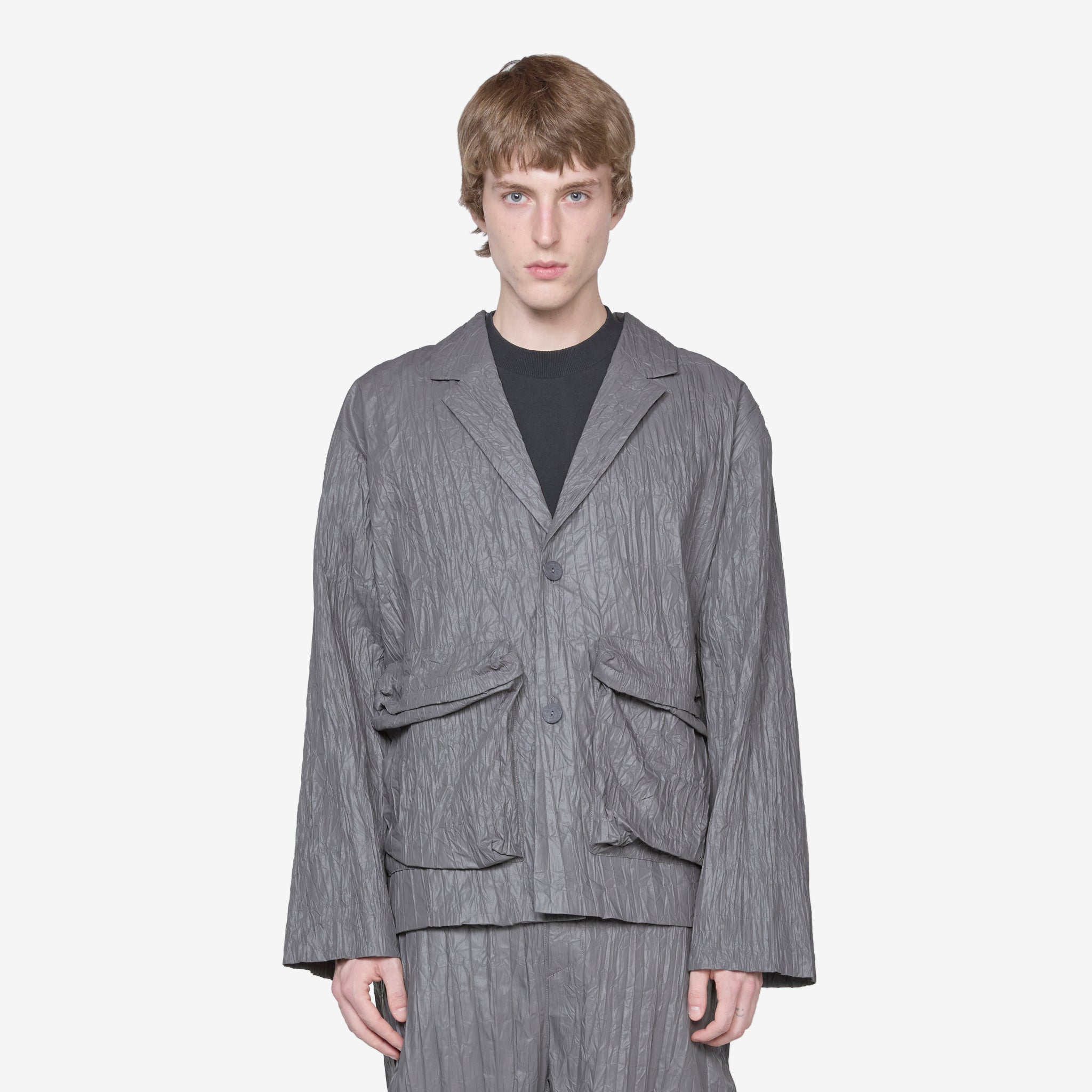 Men's Crinkle Blazer in Graphite from Satta. Regular fit, casual utility blazer with a spread collar and two-button placket. Crafted from a crinkle effect fabric woven in Japan from recycled polyester. Features two large gusseted cargo pockets with zip closure at the hip.