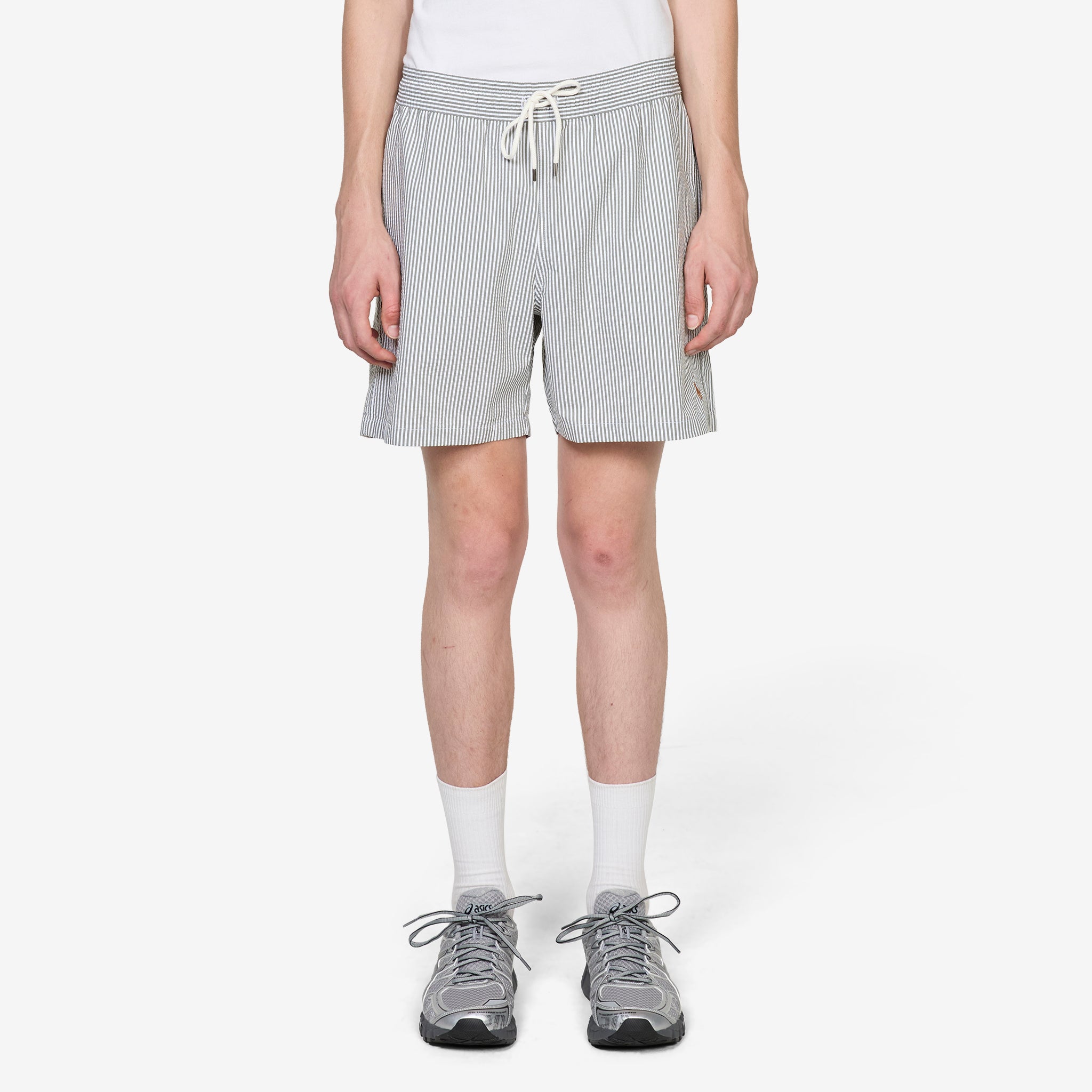 5.75-Inch Traveler Classic Swim Trunk in New Olive Seersucker from Polo Ralph Lauren. Classic fit swim trunks with an elasticated drawstring waist, side seam pockets and a button closure rear pocket. Crafted from a seersucker cotton blend in an all-over pinstripe print. Ffinished with a signature embroidered pony on the left thigh and and brand patch on the rear pocket.
