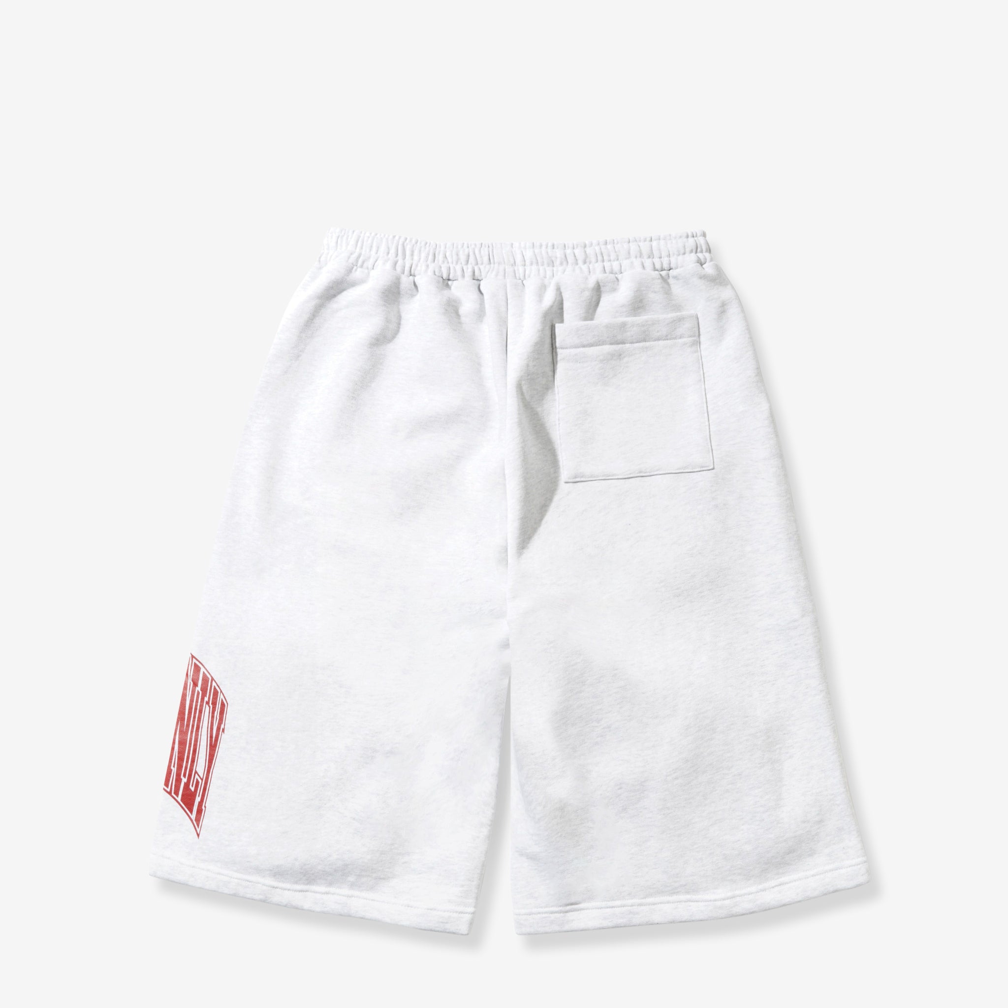 Bench Fleece Shorts in Ash from Cash Only. Relaxed fit shorts in a below the knee silhouette with an elasticated drawstring waistband, side pockets and a rear patch pocket. Crafted from heavweight 380gsm fleece and finished with printed graphics across the thigh.