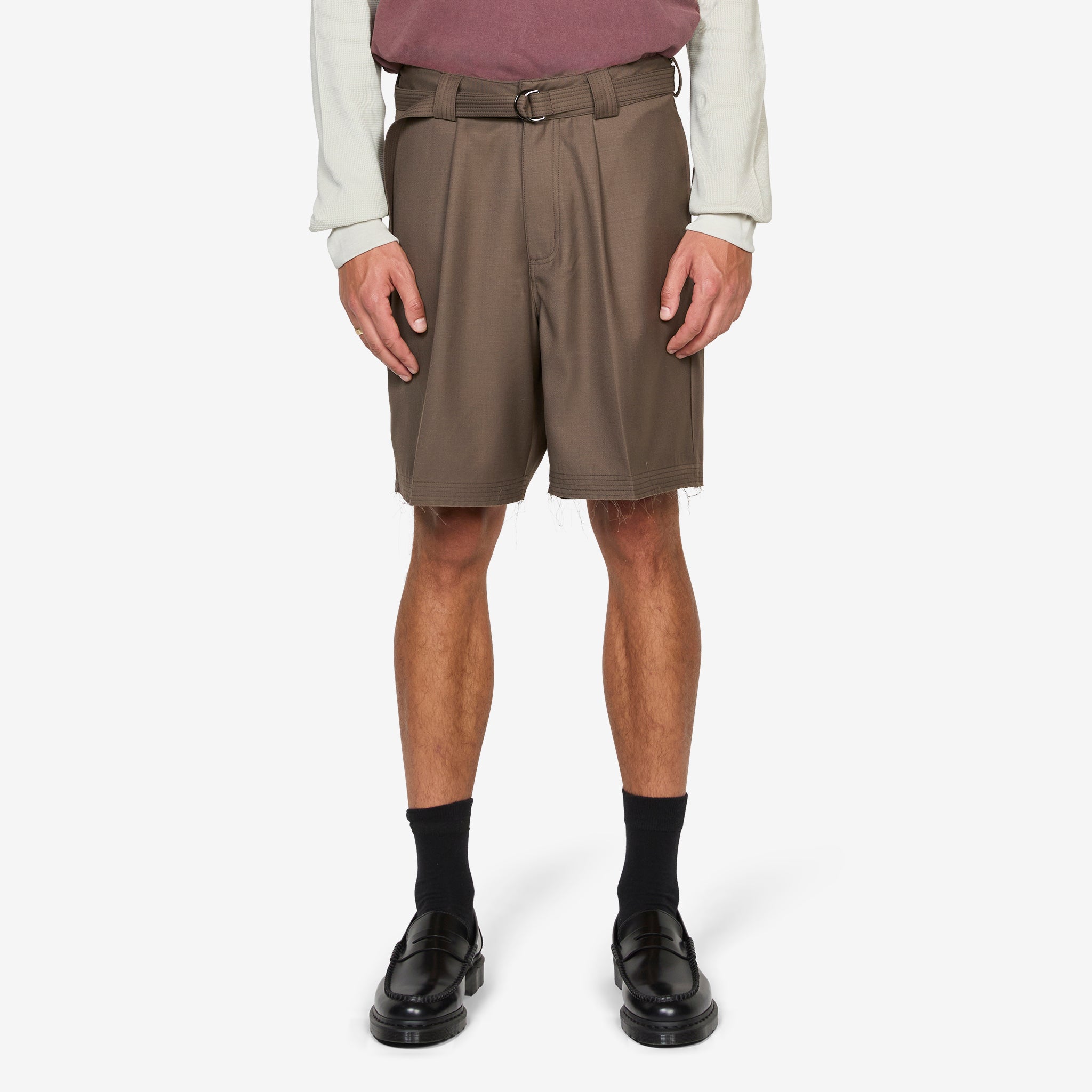 Cut Short in Taupe from Beach Brains. Relaxed fit shorts featuring a belt loop waistband with a removable self-material cinch belt, 4-pocket construction and front pleat details. Crafted from soft suiting fabric and finished with raw hem detailing.