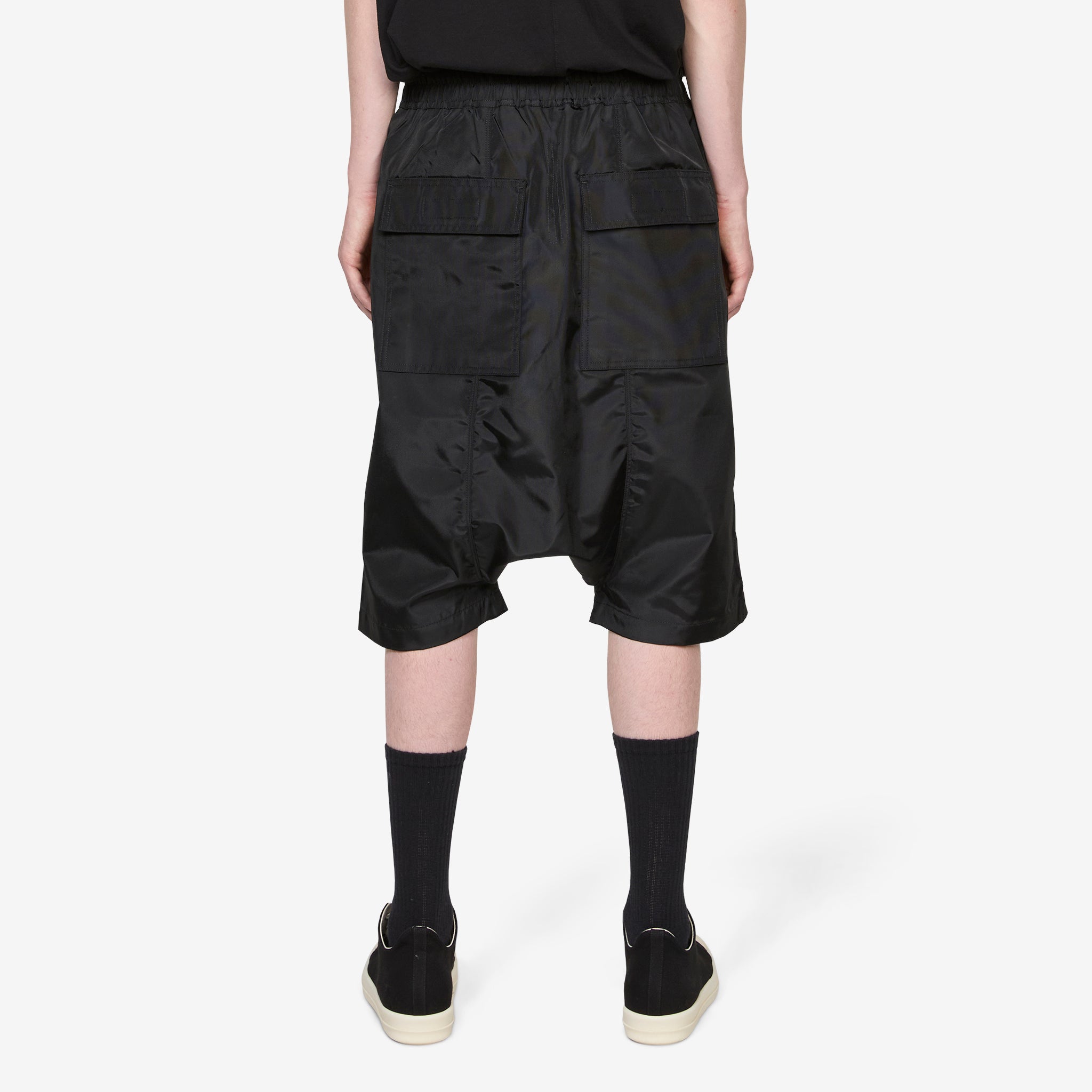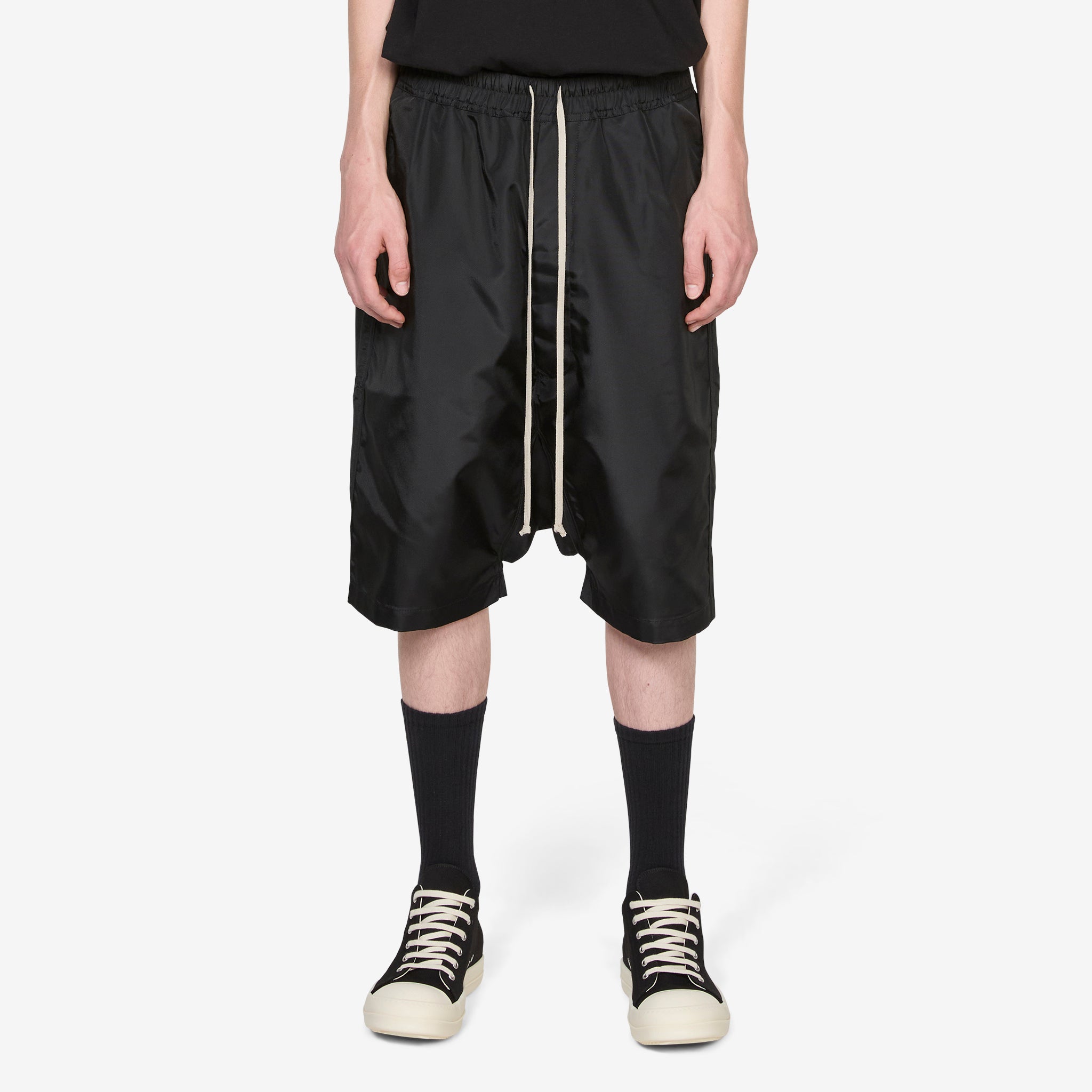 Drawstring Pods in Black Nylon Canvas from Rick Owens DRKSHDW. Relaxed fit shorts cut in a below knee length silhouette with an elasticated signature elongated drawstring waistband, stitched fly and side pockets. Crafted in a dropped crotch shape from a medium weight, compact nylon canvas with a soft and technical hand feel. Finished with flap closure back pockets with topstitching details.