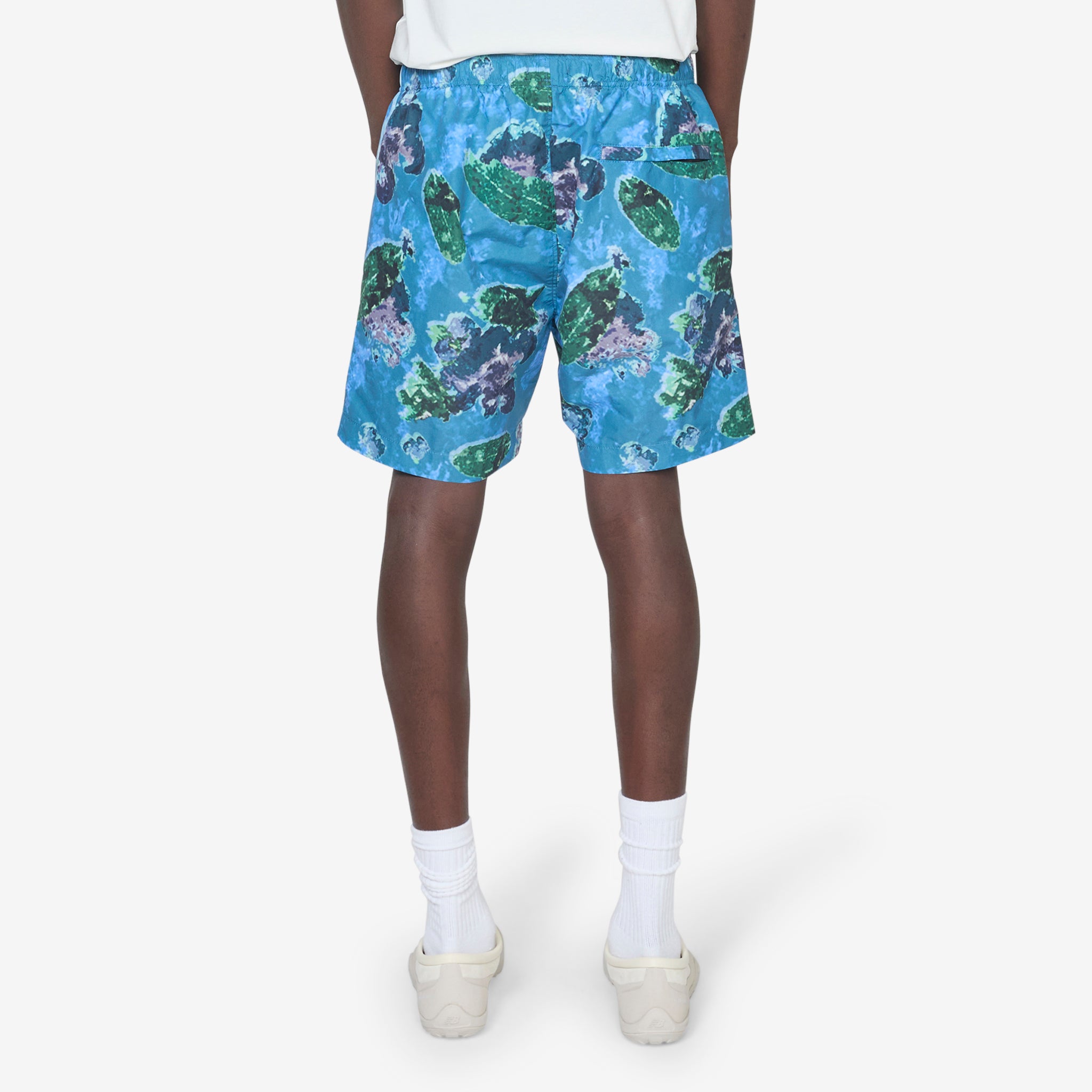 Flatt Nylon Flower Printed Swim Shorts in Surf Blue from C.P. Company. Regular fit shorts with an adjustable drawstring waistband, side pockets and a back welt zip pocket. Crafted from Flatt Nylon, an emerized opaque nylon in an all-over floral pattern lined with a comfortable inner mesh. Finished with printed branding at the left thigh.