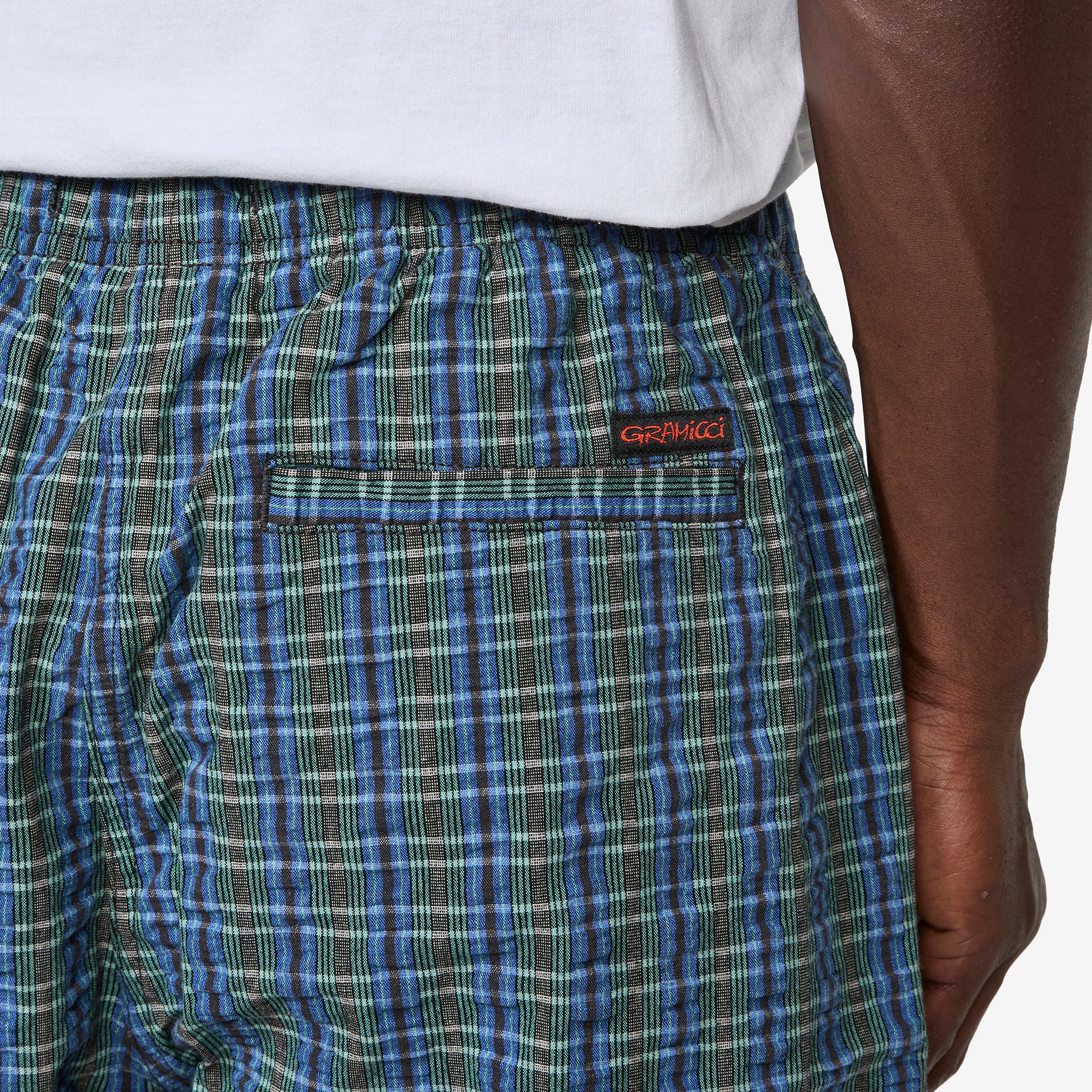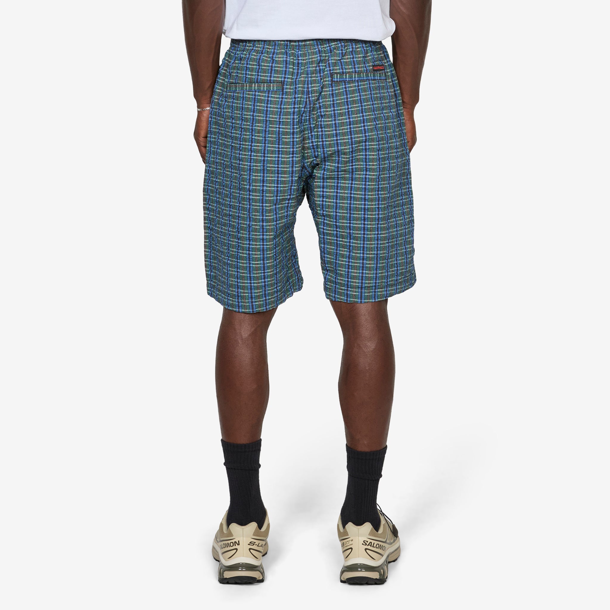 O.G. G-Short Seersucker Plaid in Multi Stripe from Gramicci. Relaxed-fit shorts with diamond shaped gusset crotch for ease of movement and an integrated nylon cinch belt. Crafted from textured seersucker plaid cotton with four pocket styling and finished with tag logo at back pocket.