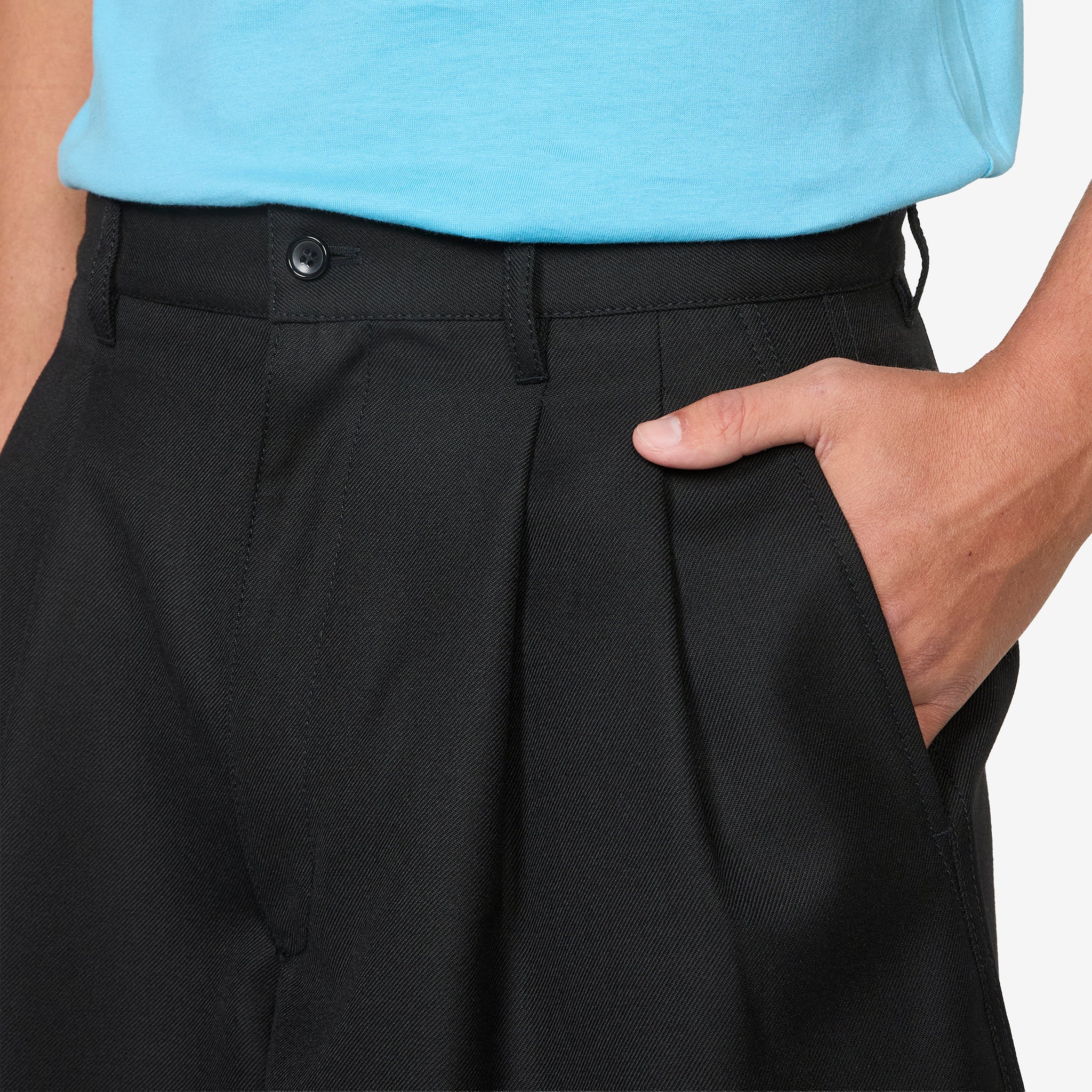 Pleated Shorts in Black from Comme des Garçons SHIRT. Relaxed fit shorts with a belt loop waistband, side seam pockets and asymmetrical rear pockets. Crafted from a wool blend in a high waisted, wide-leg silhouette. Finished with pleated front details.