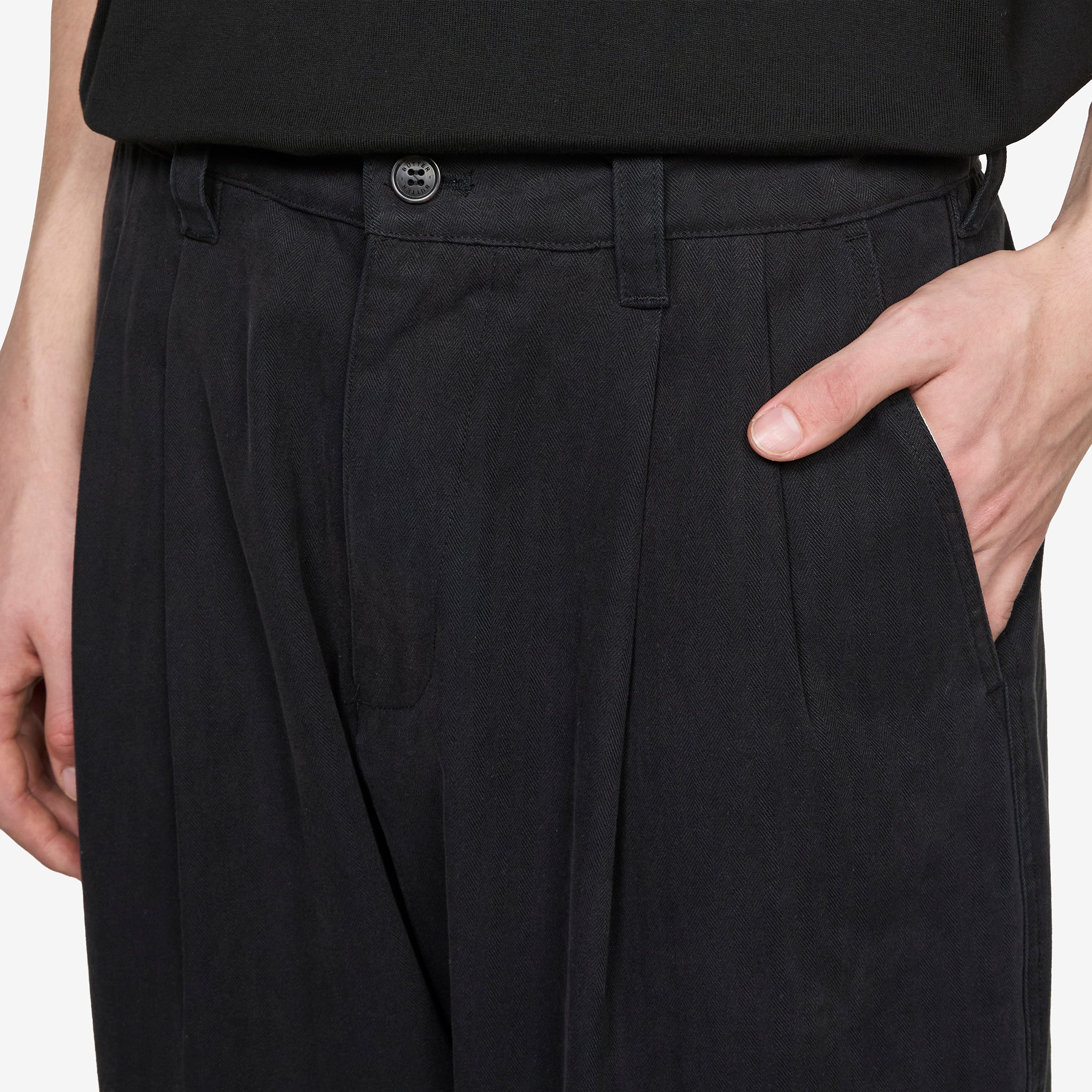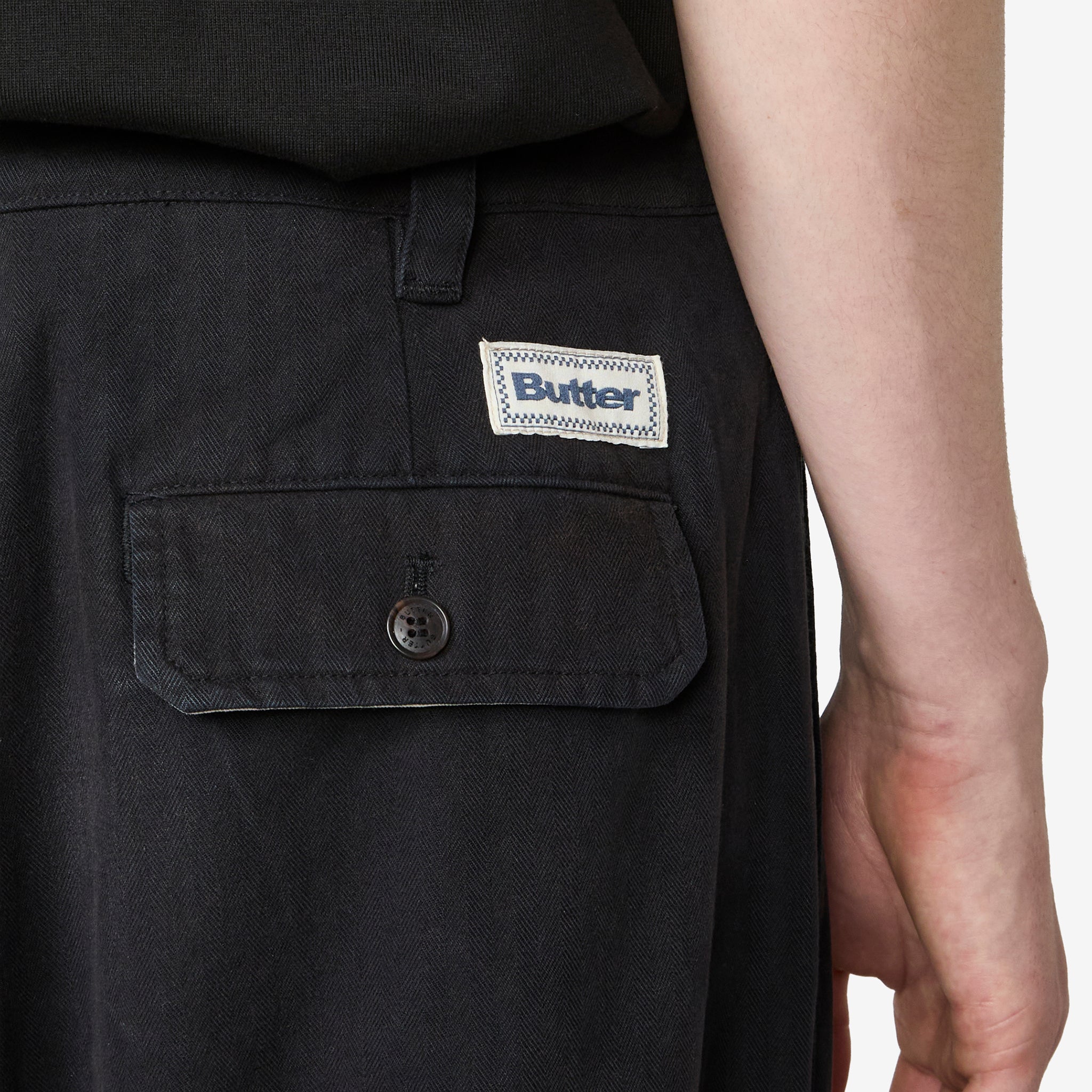Pleated Shorts in Washed Black from Butter Goods. Baggy-fit shorts with front double pleats, flap closure rear welt pockets, side pockets and an adjustable waistband with an internal drawcord. Crafted from cotton herringbone twill in a relaxed below-the-knee silhouette. Finished with a woven label above the back pocket.