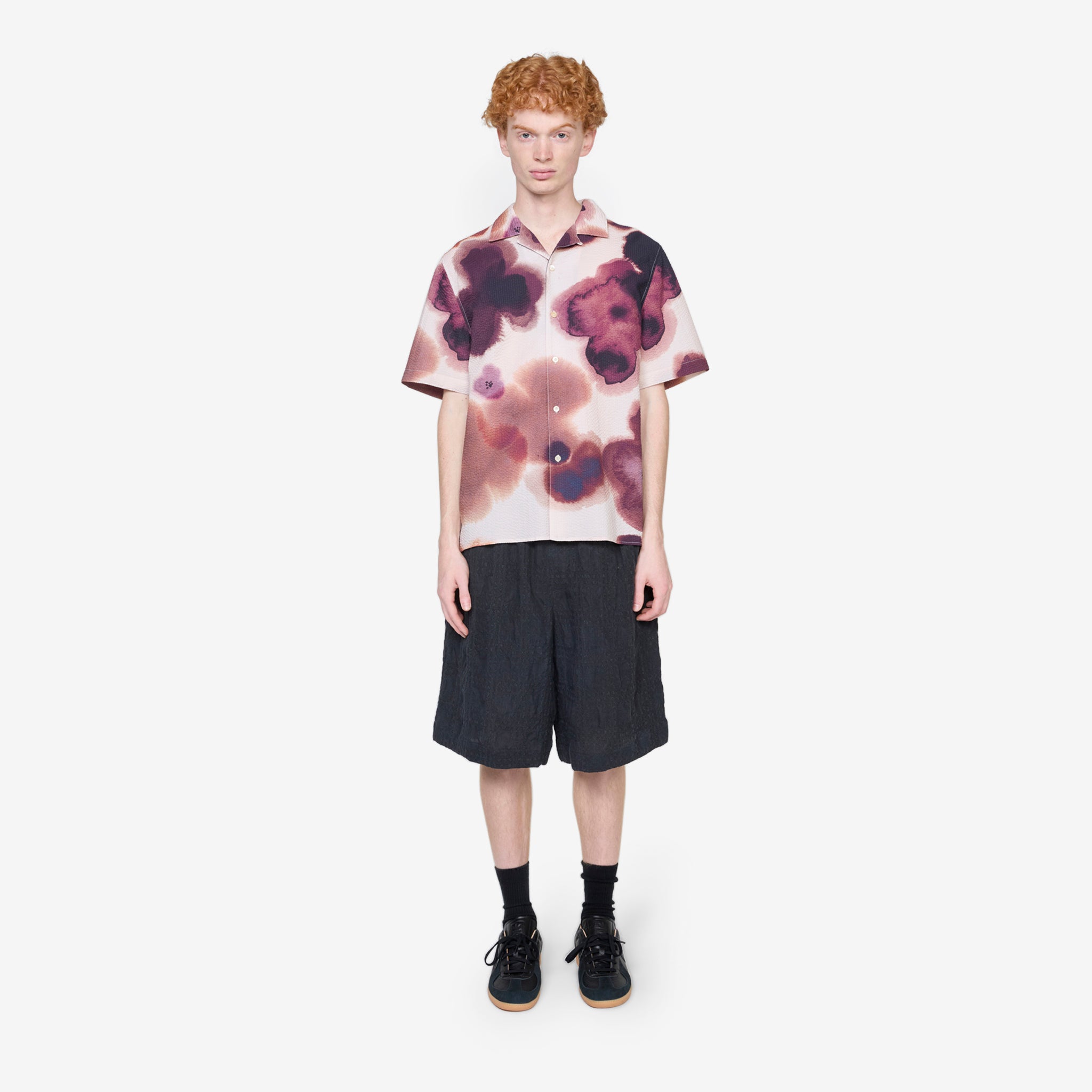 Saleh Shorts in Camel Pinstripe from A Kind Of Guise. Seersucker check shorts that are constructed with a wide leg fit and elastic waistband. Delave linen-lyocell blend for a check pattern through the seersucker weave. Two side pockets, a patch pocket at the back.
