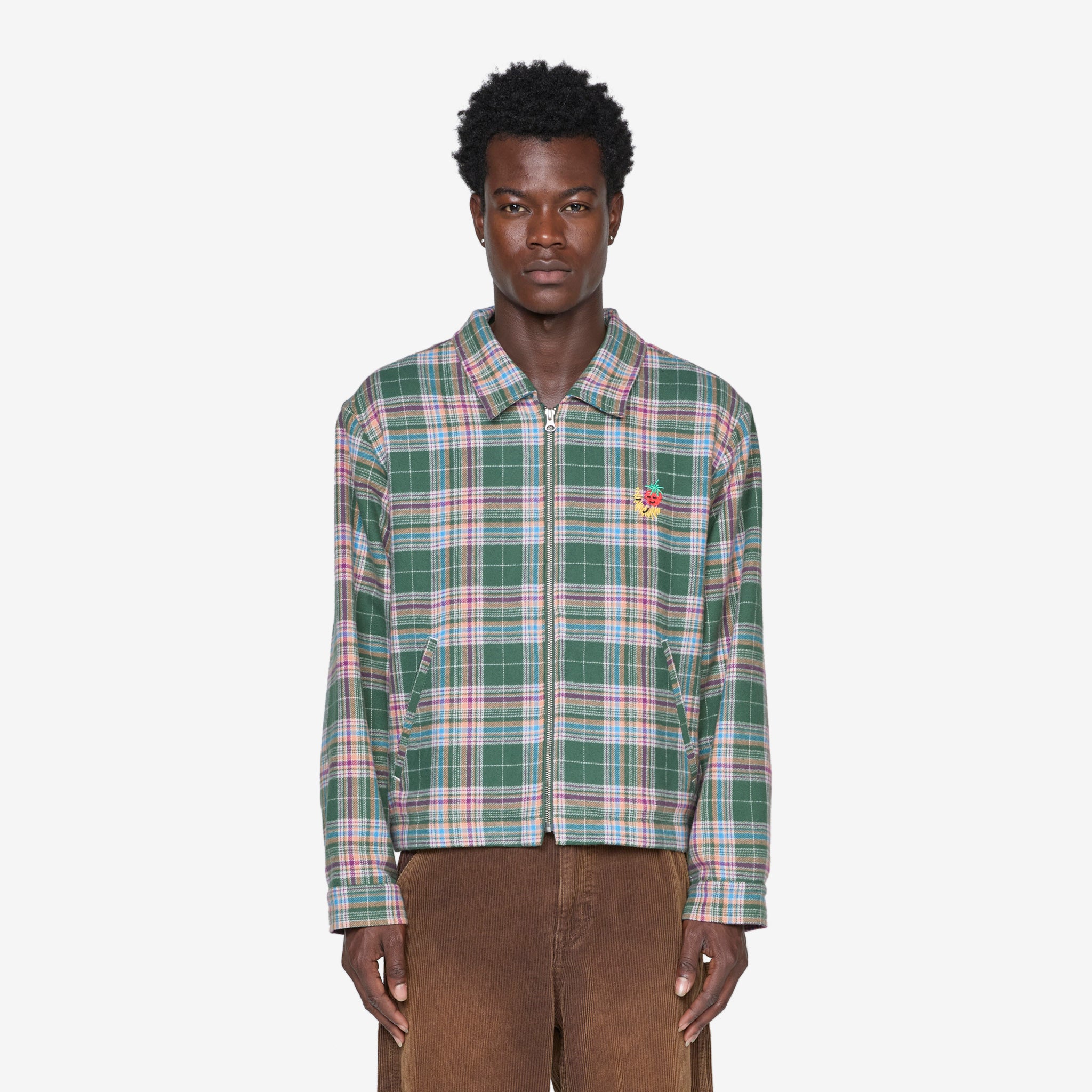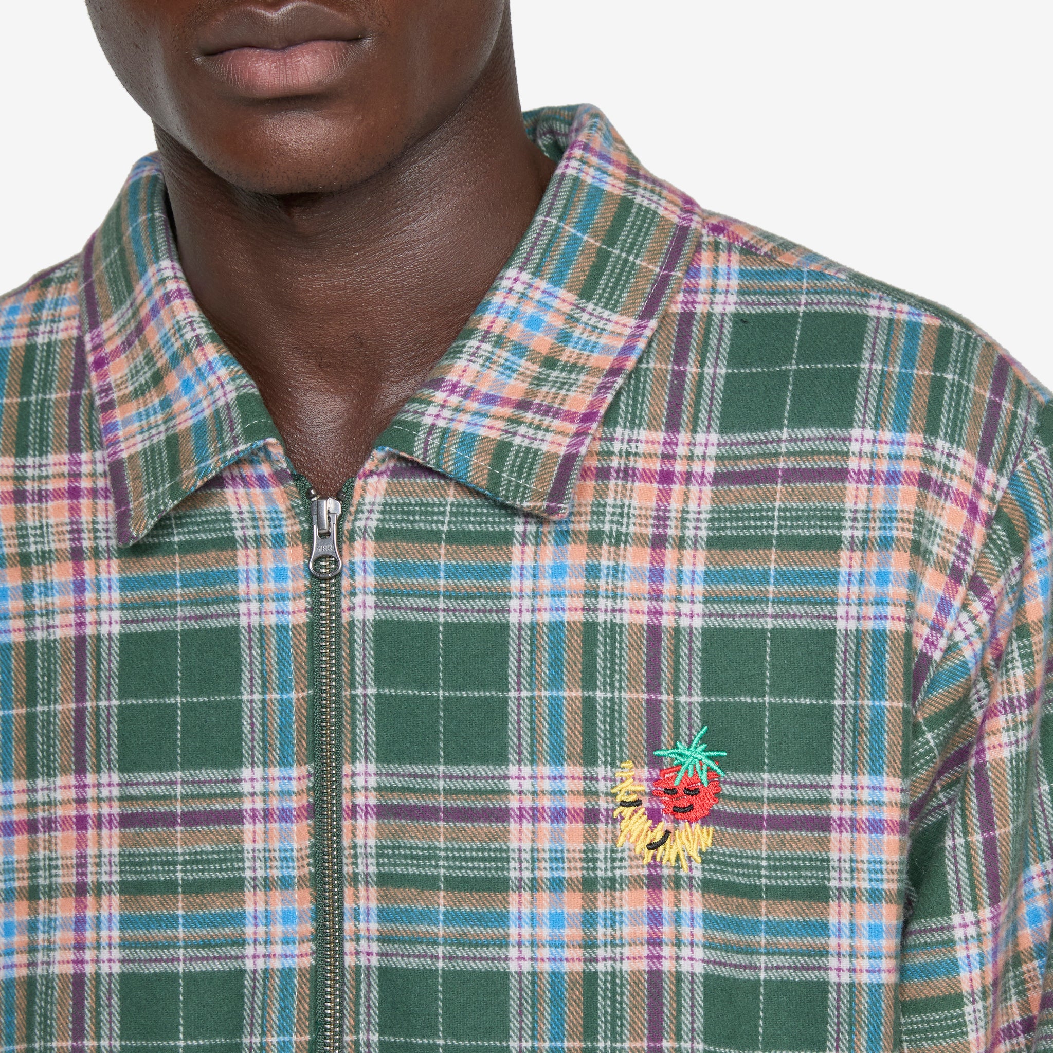 Flannel Gas Station Jacket in Green from Sky High Farm Workwear. Relaxed fit jacket with a classic collar, full-zip closure, roomy side pockets and buttoned cuffs. Crafted from durable plaid cotton and finished with embroidered branding at the chest.