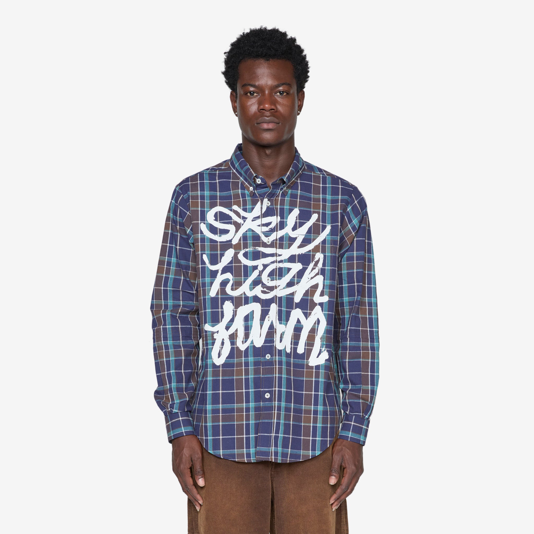 Hybrid Button Down Shirt in Blue from Sky High Farm Workwear. Oversized fit shirt with a classic button-down collar, buttoned cuffs, single chest pocket and curved hem. Crafted from lightweight cotton and linen blend in a blue check. Finished with handwritten screen printed branding by Eri Wakiyama across the front..