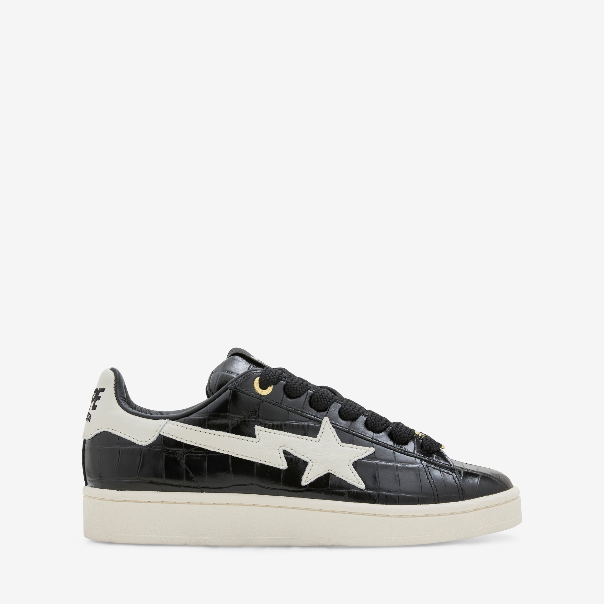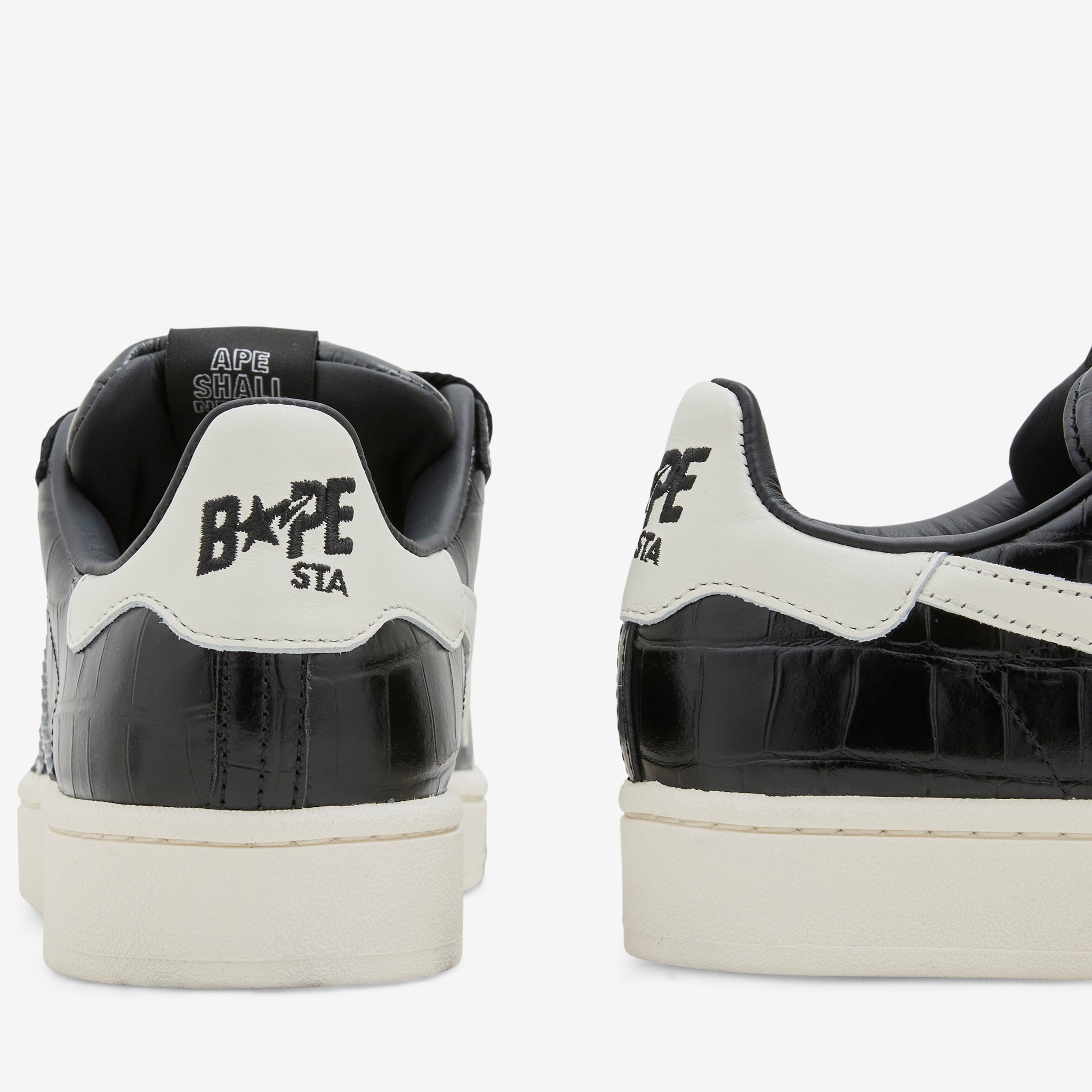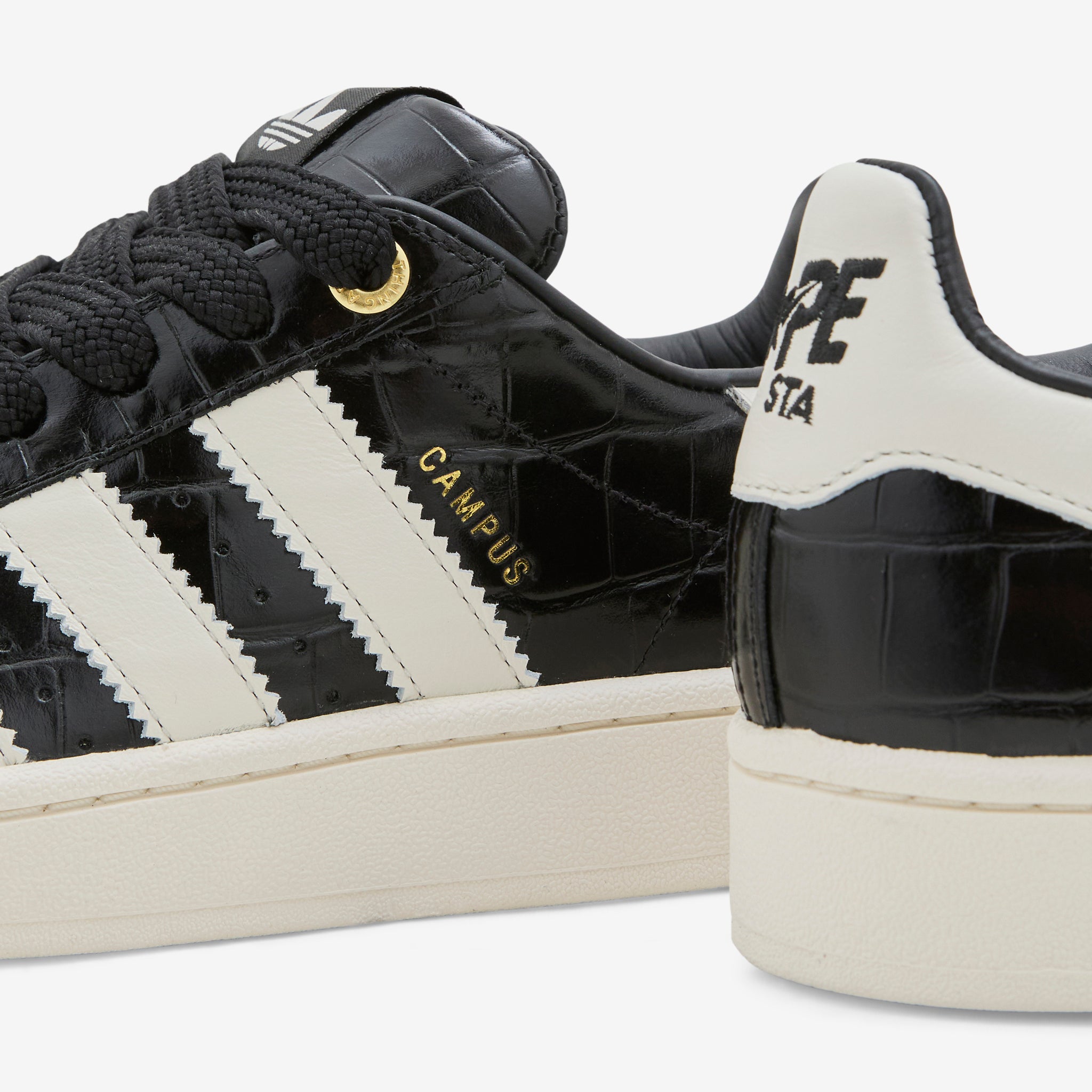 BAPE collaborates with adidas Originals on the Campus 00s in Core Black, Off White and Gold Metallic. Premium croc-embossed leather upper with asymmetric asymmetric BAPE and 3-Stripes overlays. Rubber outsole provides traction and support. Finished with gold collaborative aglets at the laces and collaborative branding throughout.