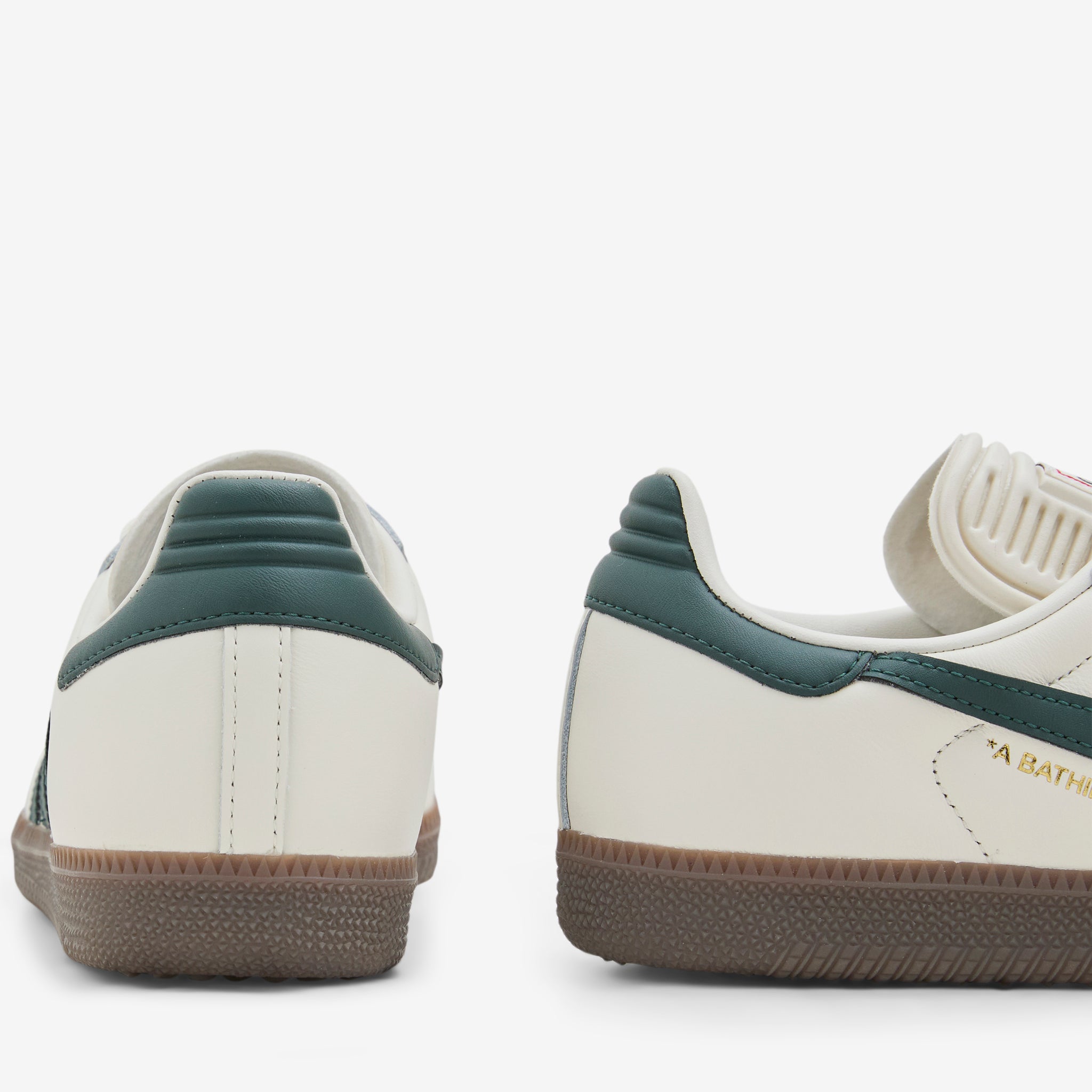 BAPE collaborates with adidas Originals on the Samba in Off White, Shadow Green and Gum. Leather upper with a protective embossed toebox and asymmetric BAPE and 3-Stripes overlays. Leather sockliner and rubber outsole add comfort and support. Finished with gold foil collaborative branding and perforated details.