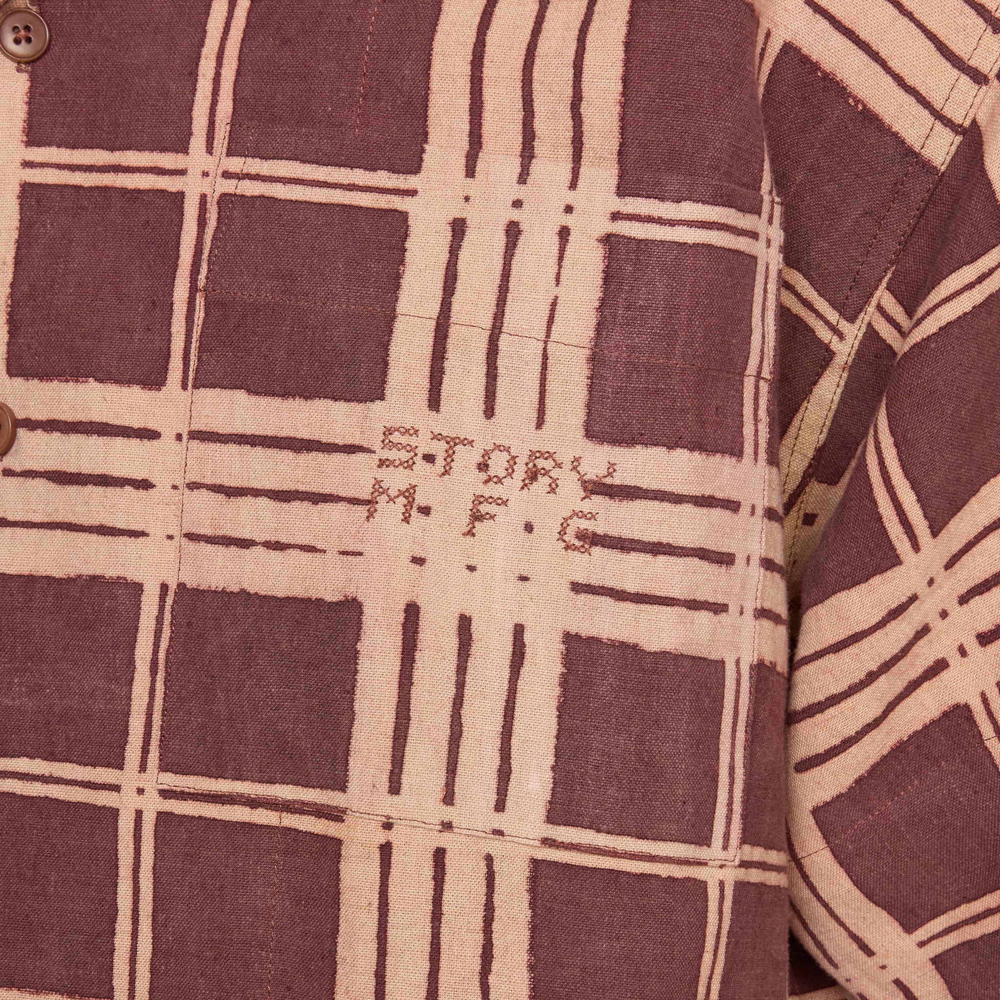 Greetings Shirt in Brown Resist Check from STORY Mfg. Boxy fit shirt with a camp collar, corozo nut button closure and a single chest pocket. Crafted from a resist-dyed linen blend. Finished with tonal embroidered branding on the chest pocket.