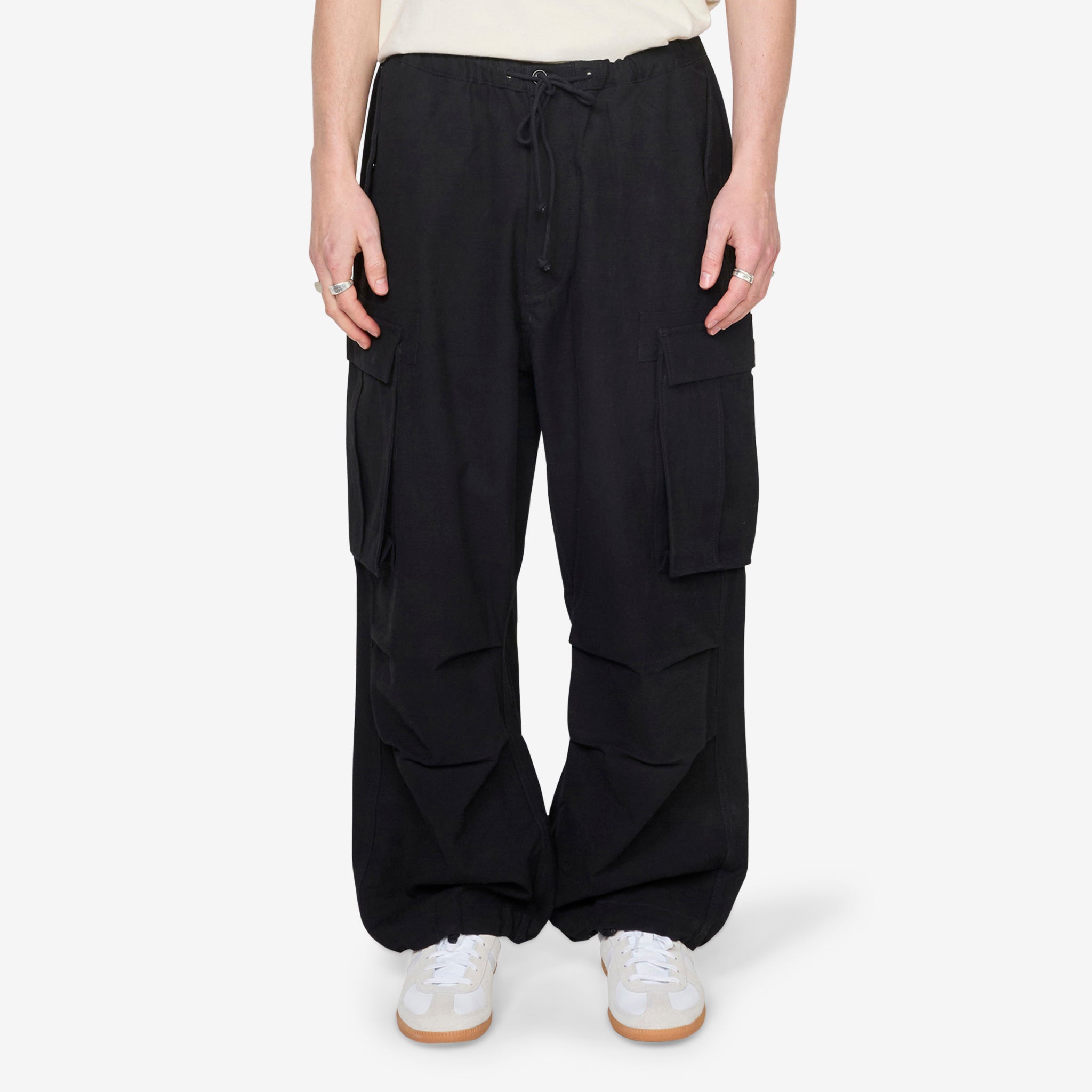 Peace Pants in Black from STORY Mfg. Relaxed fit, wide leg pants with an elasticated drawstring waistband, flap-closure side pockets, cargo pockets at the thigh and drawstring adjustable hems. Crafted from naturally hand-dyed organic cotton and finished with hand-embroidered cross-stitching and articulated knees for ease of movement.