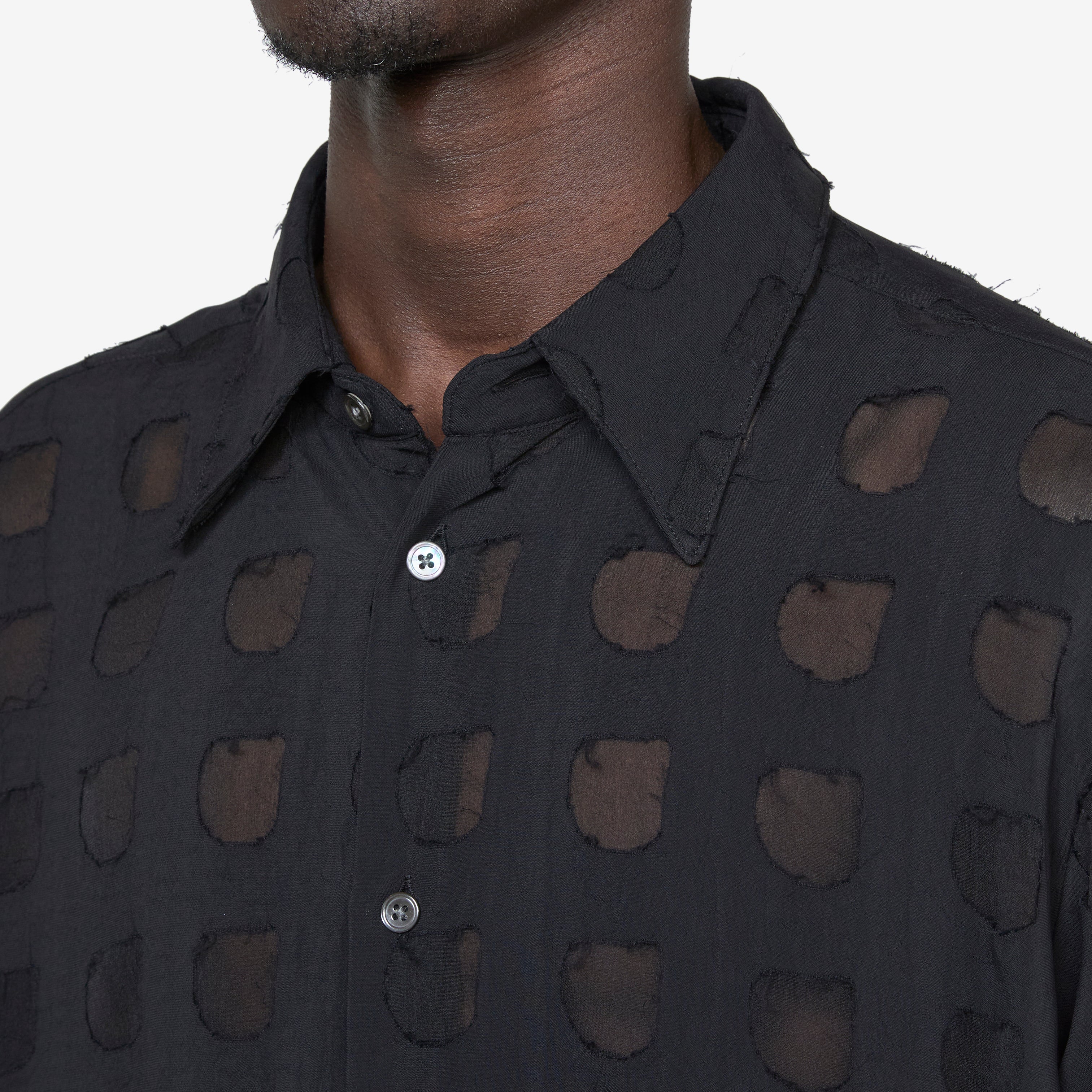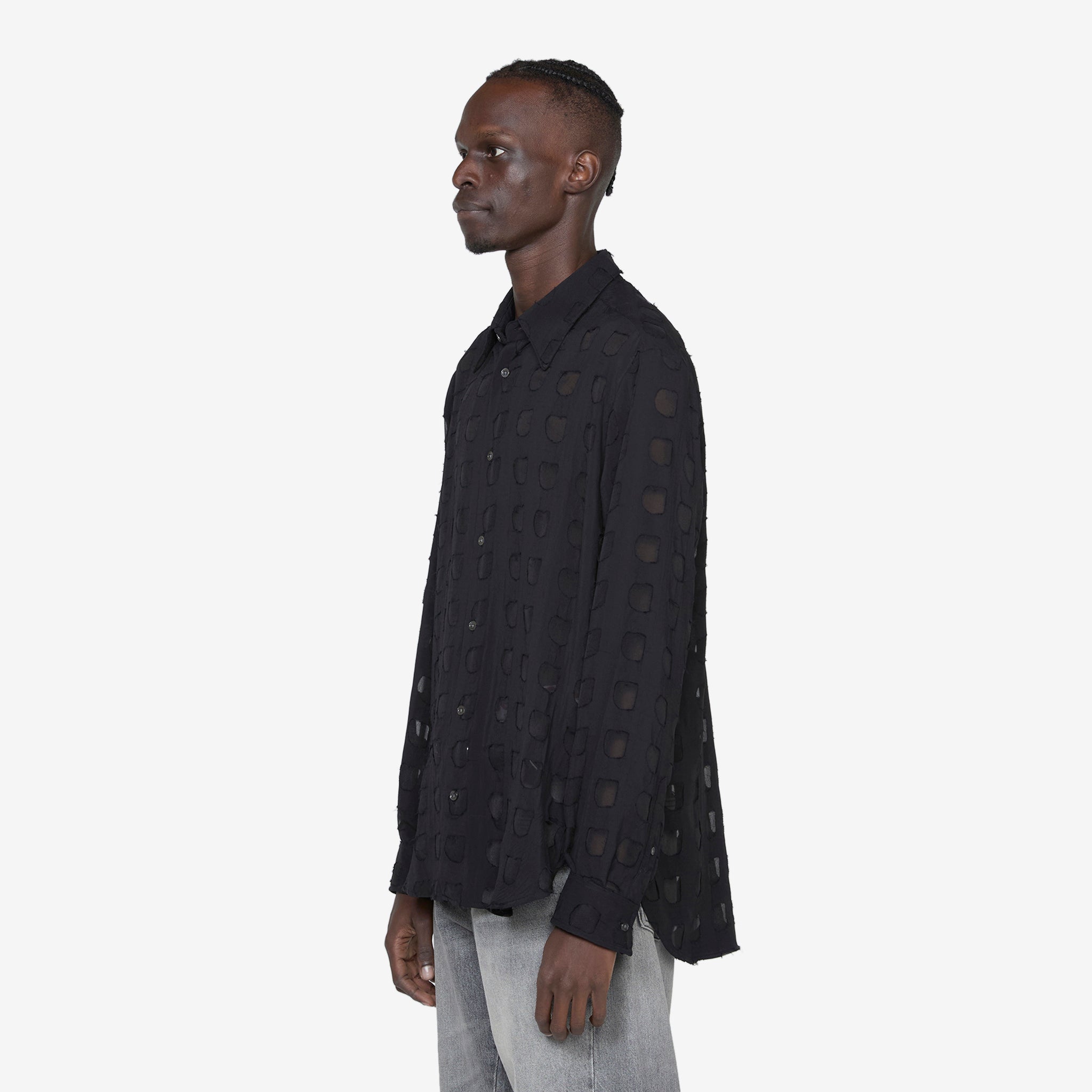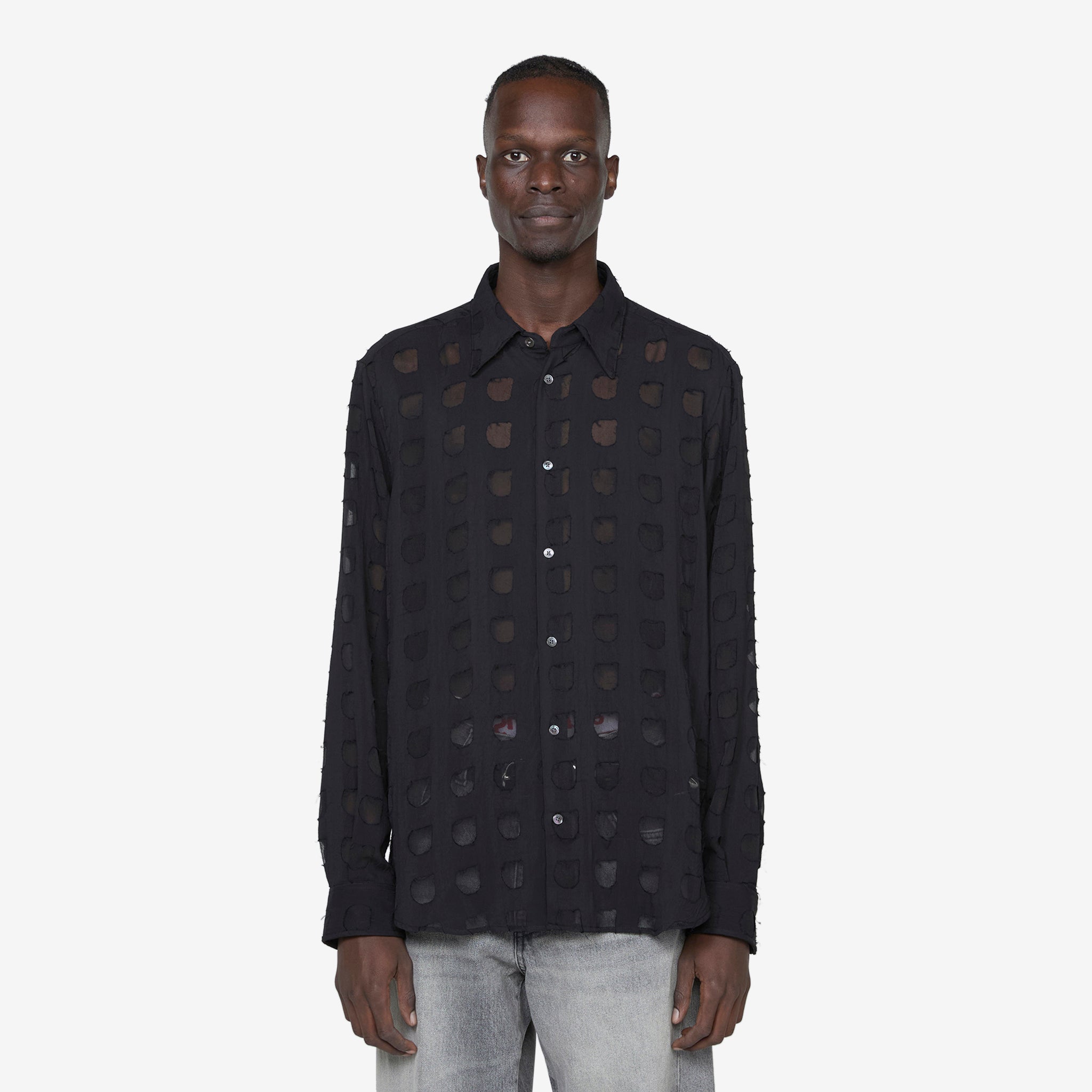 Men's Please Shirt in Black from Sunflower. Relaxed fit longsleeve shirt with an enhanced collar, full button closure and a curved hem. Crafted from Italian sheer cotton.