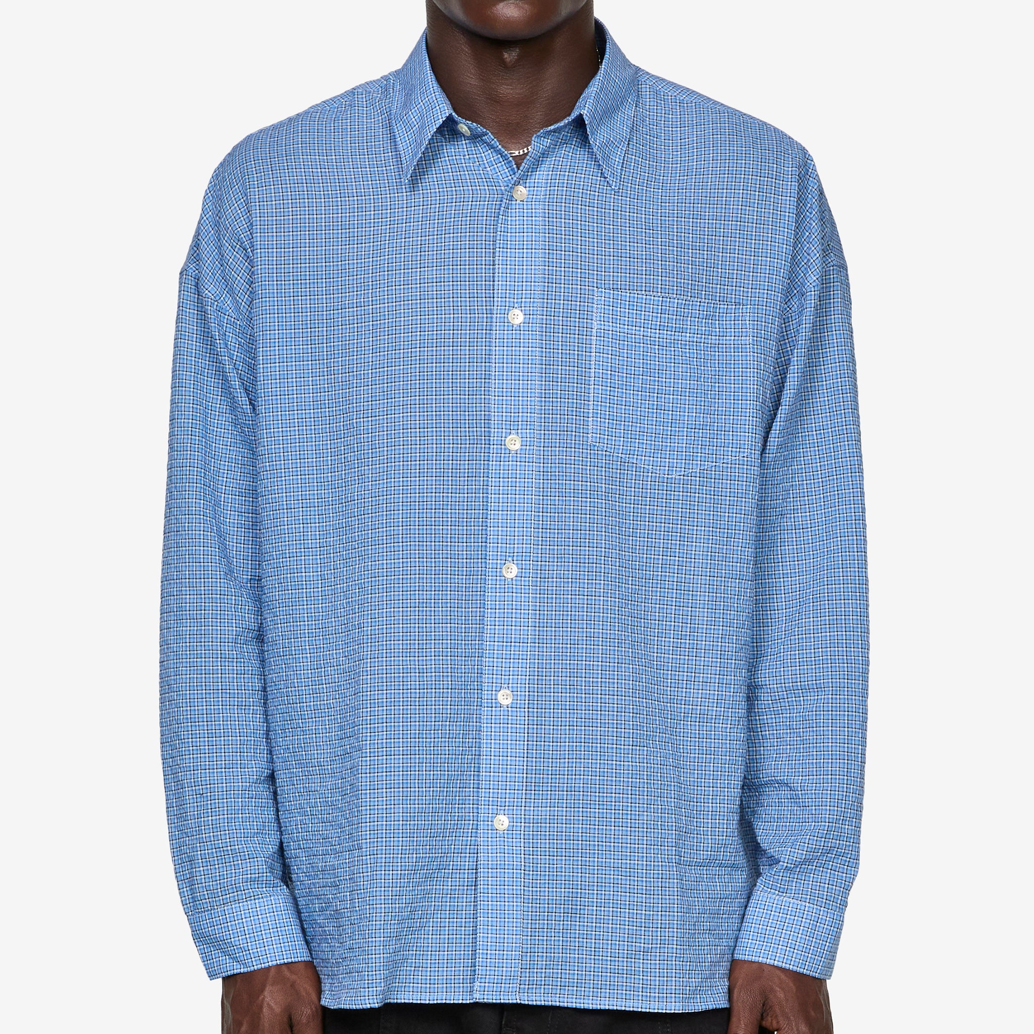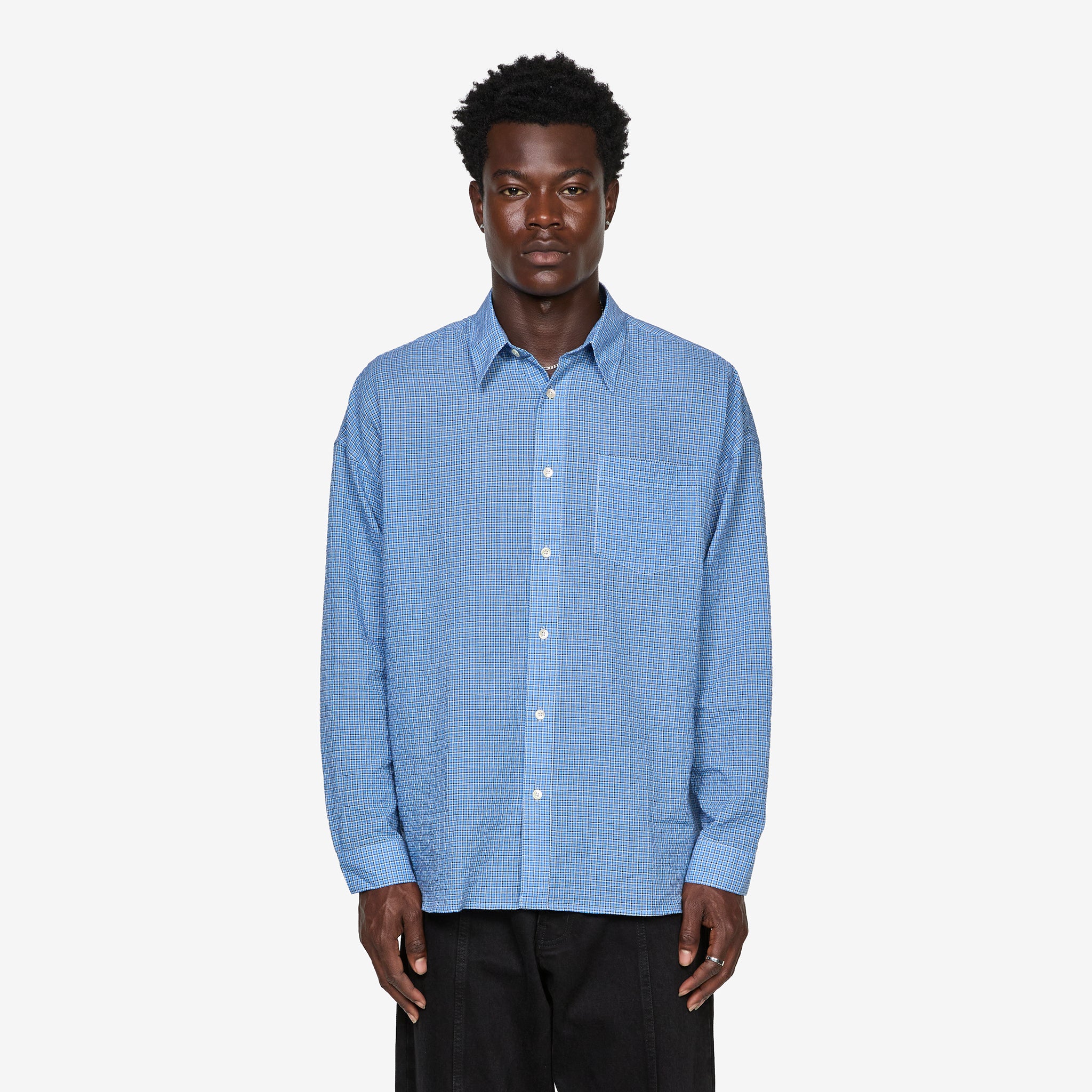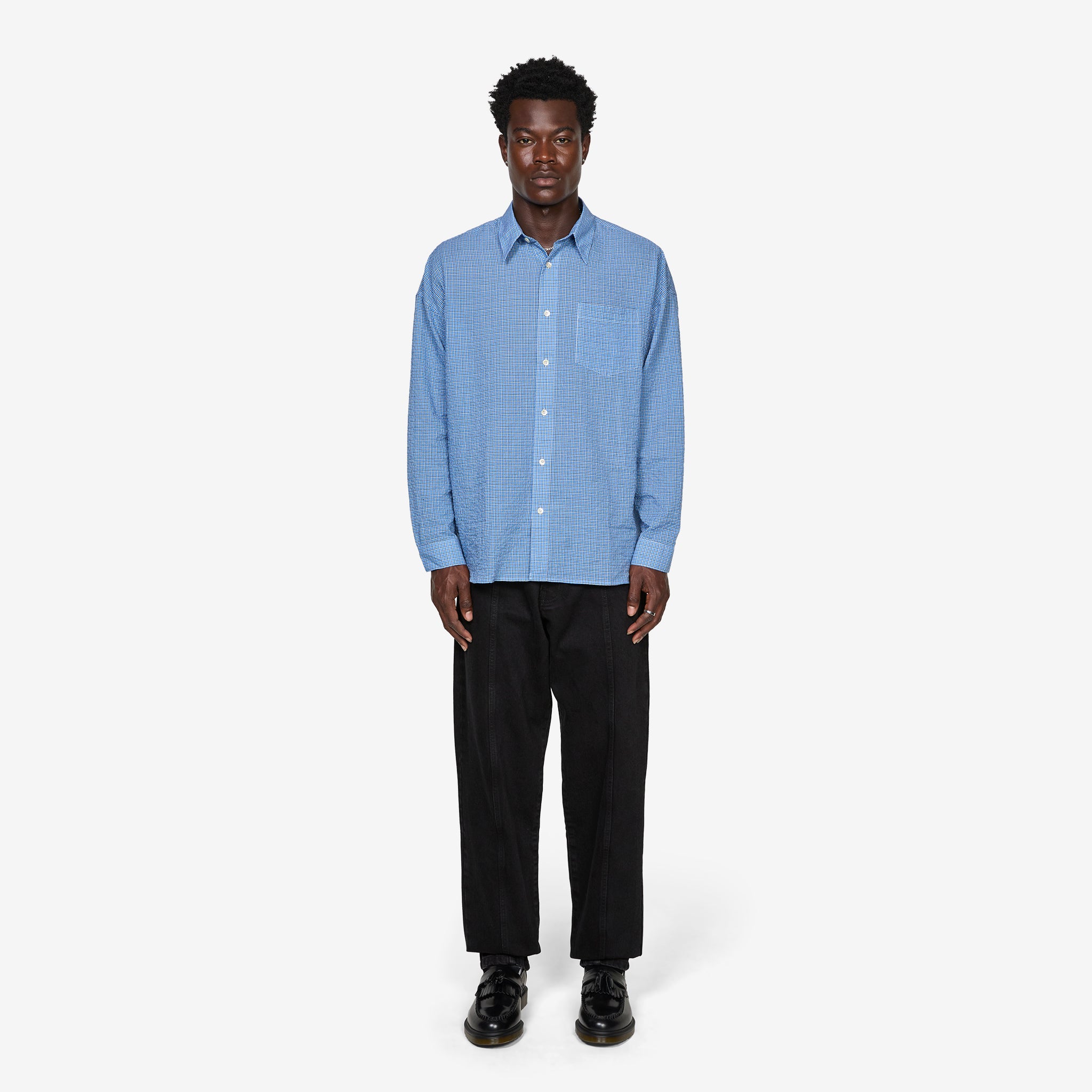 Stable Shirt in Blue from Sunflower. Relaxed fit shirt with a modern split collar, mother of pearl buttons, a curved hem and a single chest pocket. Crafted from Italian light seersucker fabric in a fine micro check and finished with relaxed button cuffs.