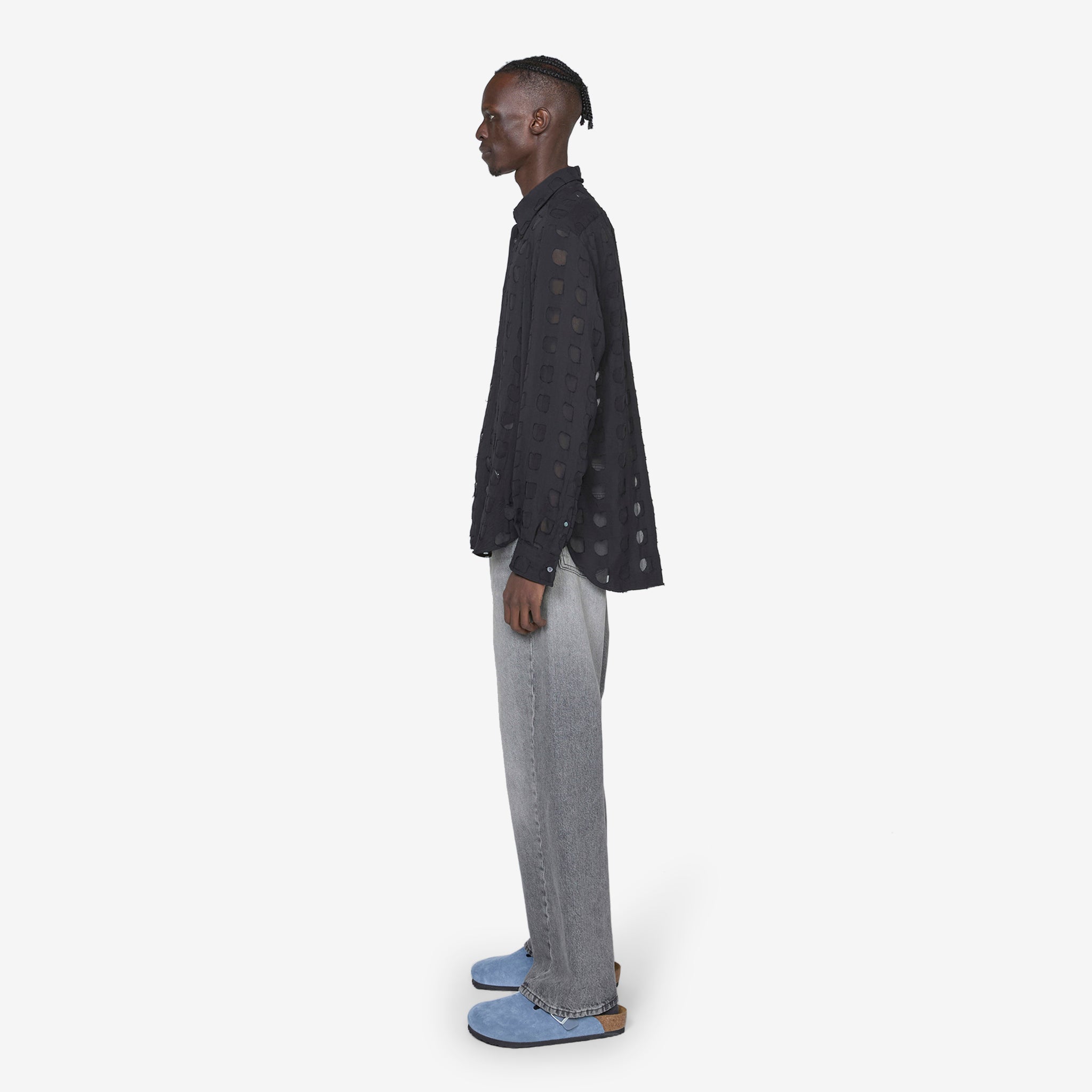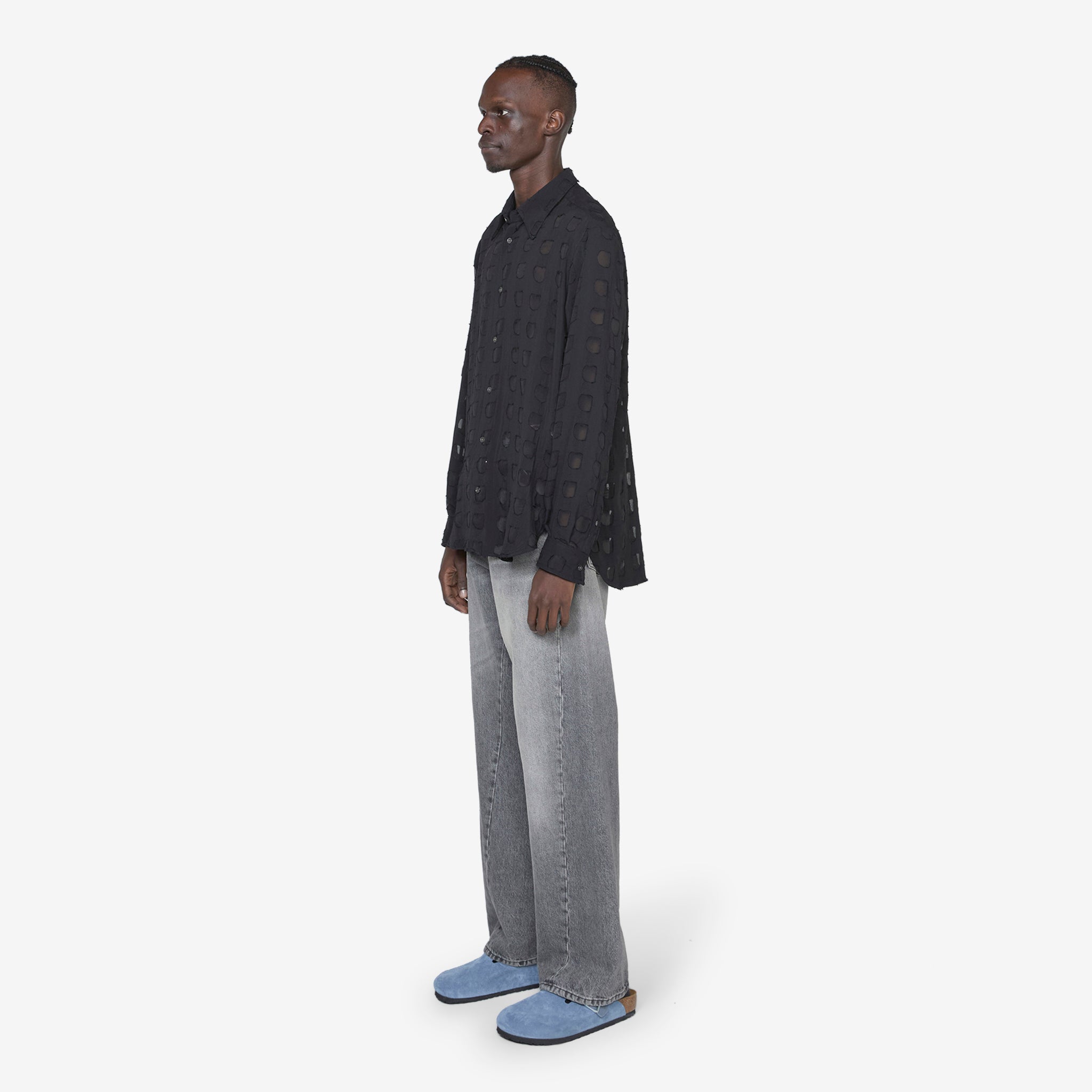 Men's Wide Twist Work Jeans in Black Stone from Sunflower. Wide fit jeans with a twisted seam. Crafted from traditional 3x1 twill fabric which has been stone-washed and hand-distressed for a worn look and feel. 5 pocket styling. Finished with a branded leather jacron on the back waistband and hand-made abrasions on the pockets and seams.