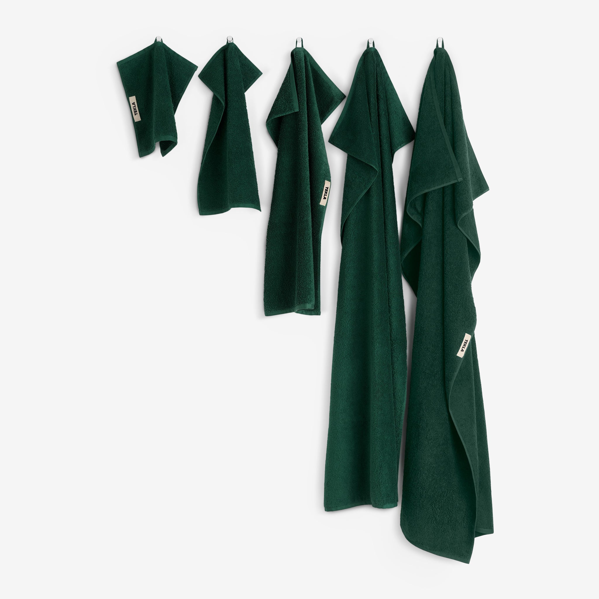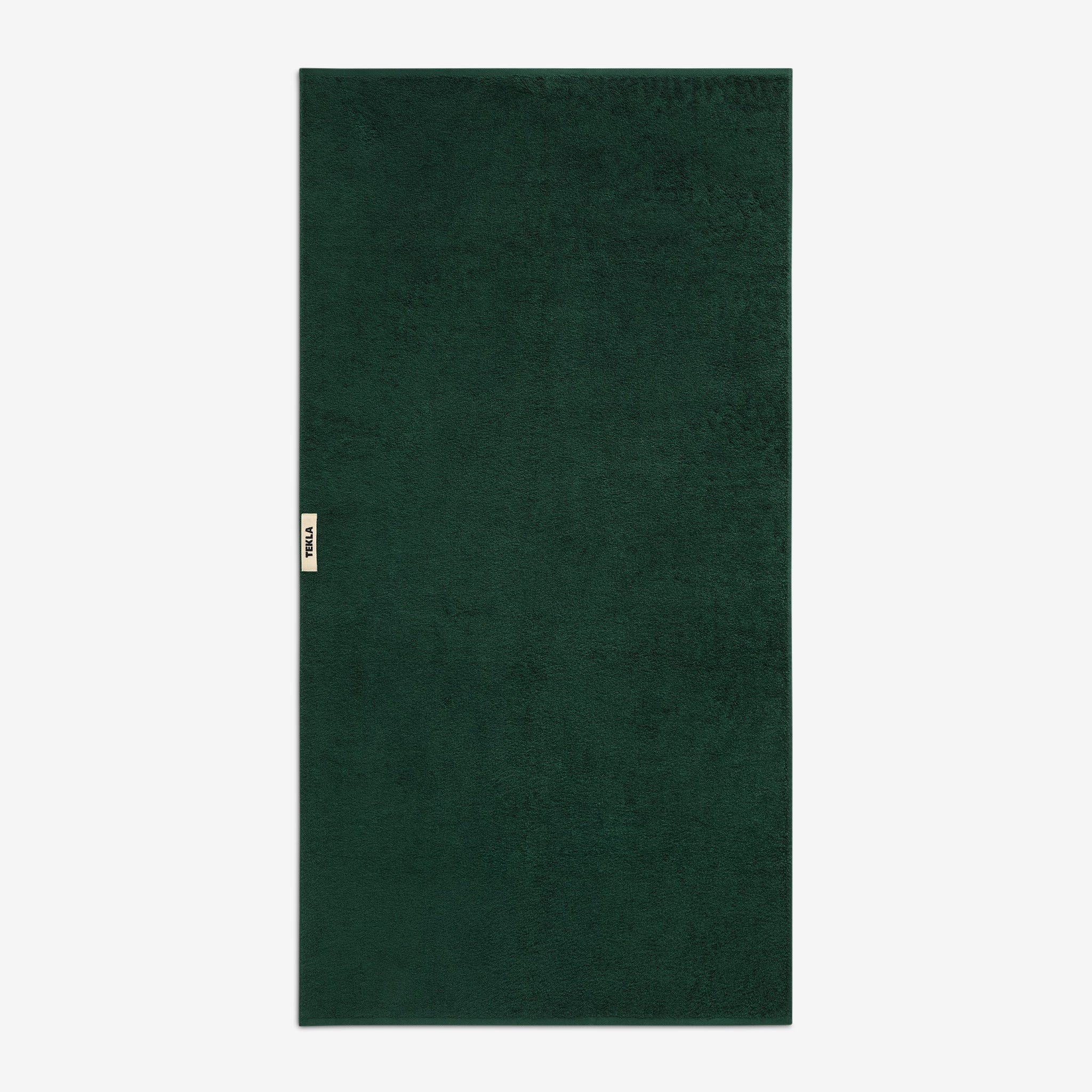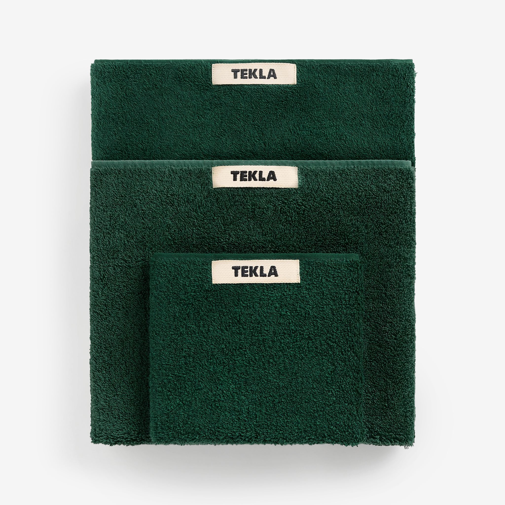 Terry Towel in Forest Green from Tekla. Gentle on the skin and fast to dry, these towels are constructed with extra-long yarns which are extra-combed for a super soft finish. Crafted from a thick, 600 GSM organic cotton terry weave which perfectly balances softness with efficient drying. Finished with closed corner construction and a sturdy hanger loop.