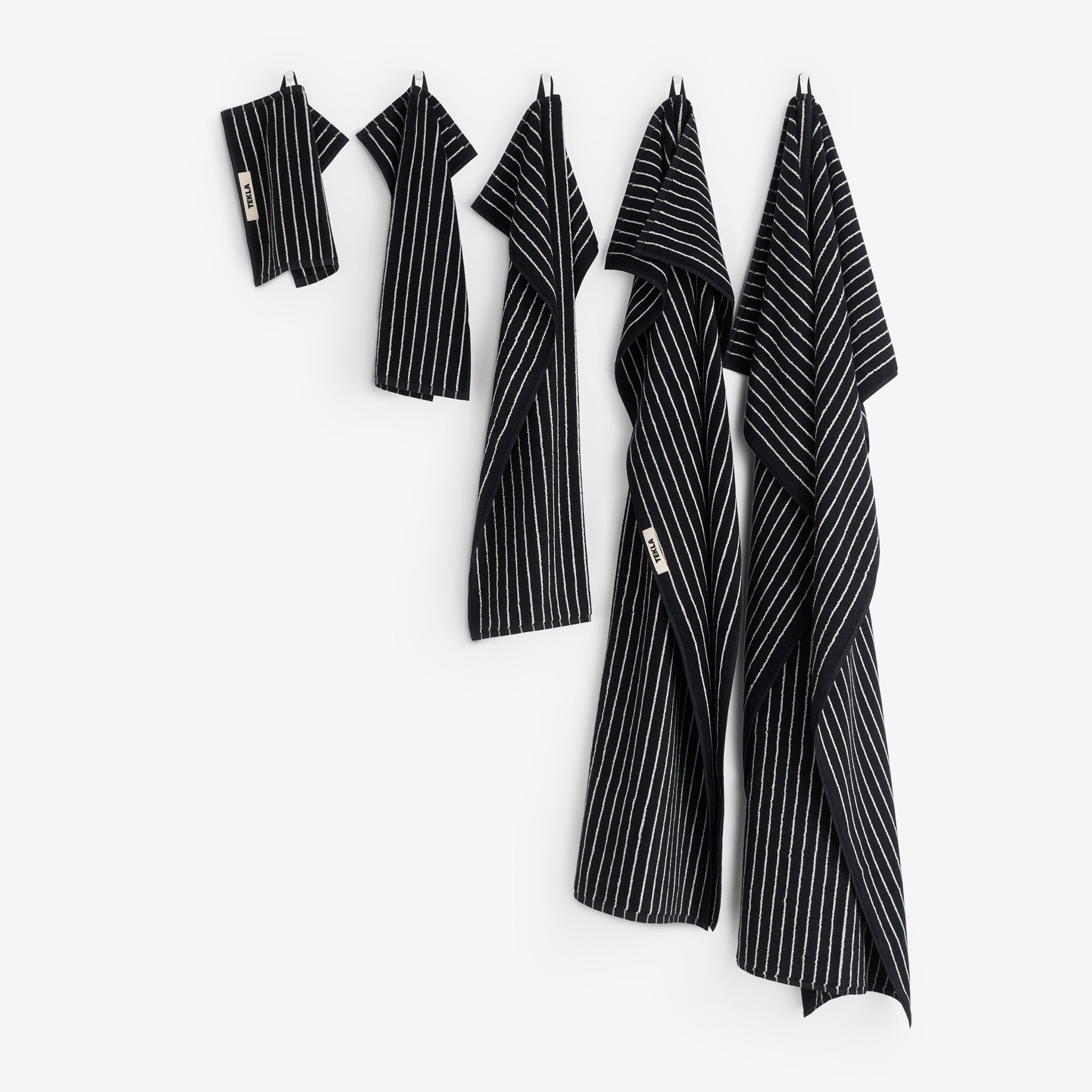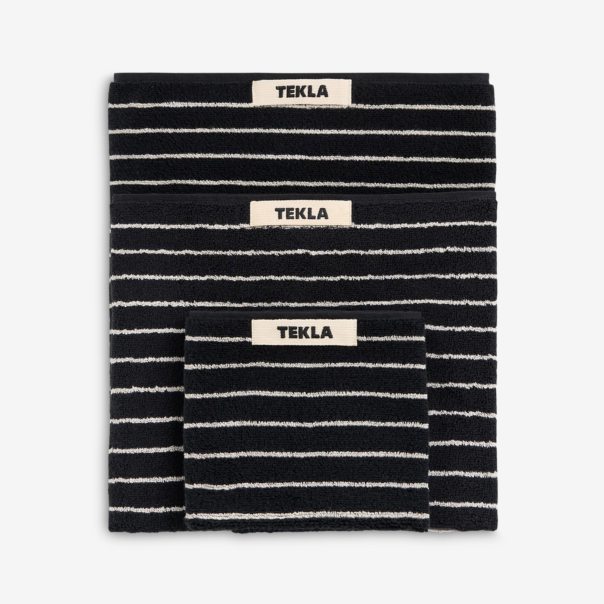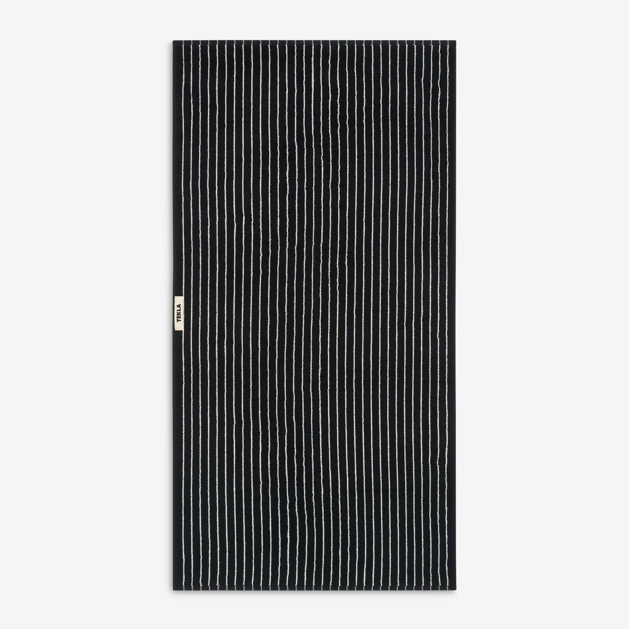 Terry Towel in Black Stripes from Tekla. Gentle on the skin and fast to dry, these towels are constructed with extra-long yarns which are extra-combed for a super soft finish. Crafted from a thick, 600 GSM organic cotton terry weave which perfectly balances softness with efficient drying. Finished with closed corner construction and a sturdy hanger loop.