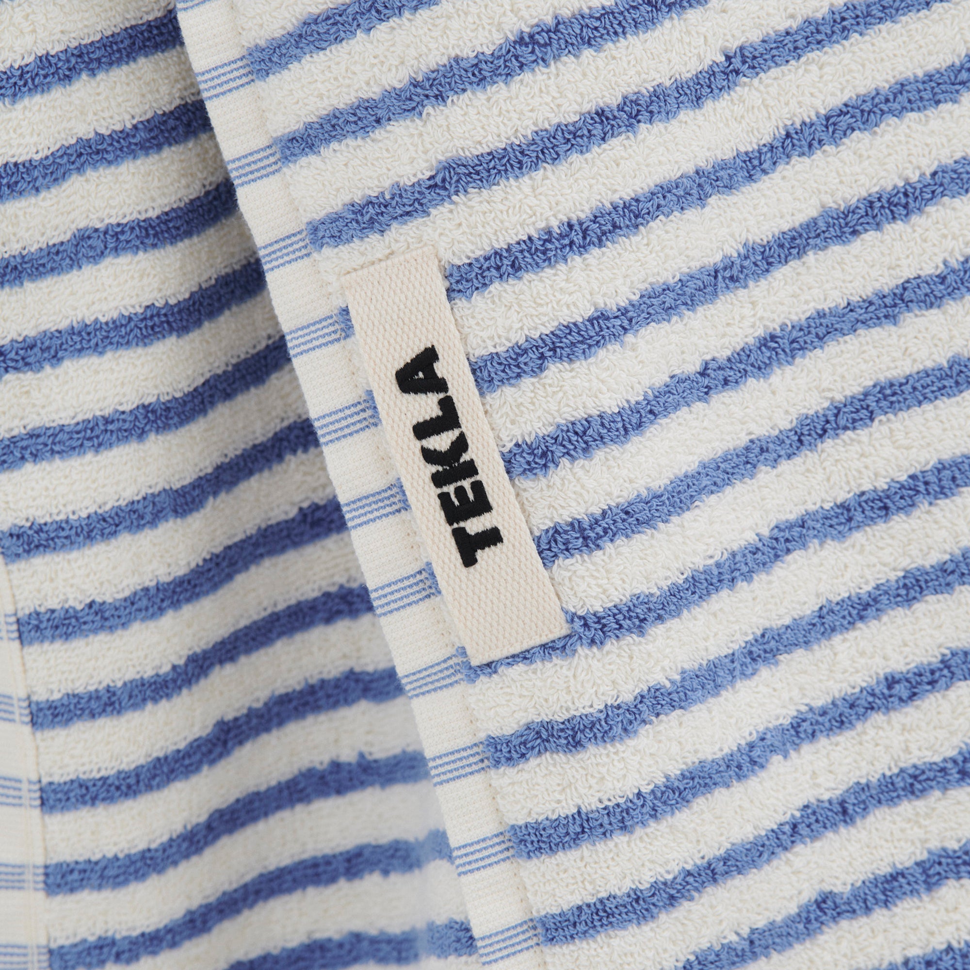 Terry Towel in Coastal Blue Stripes from Tekla. Gentle on the skin and fast to dry, these towels are constructed with extra-long yarns which are extra-combed for a super soft finish. Crafted from a thick, 600 GSM organic cotton terry weave which perfectly balances softness with efficient drying. Finished with closed corner construction and a sturdy hanger loop.