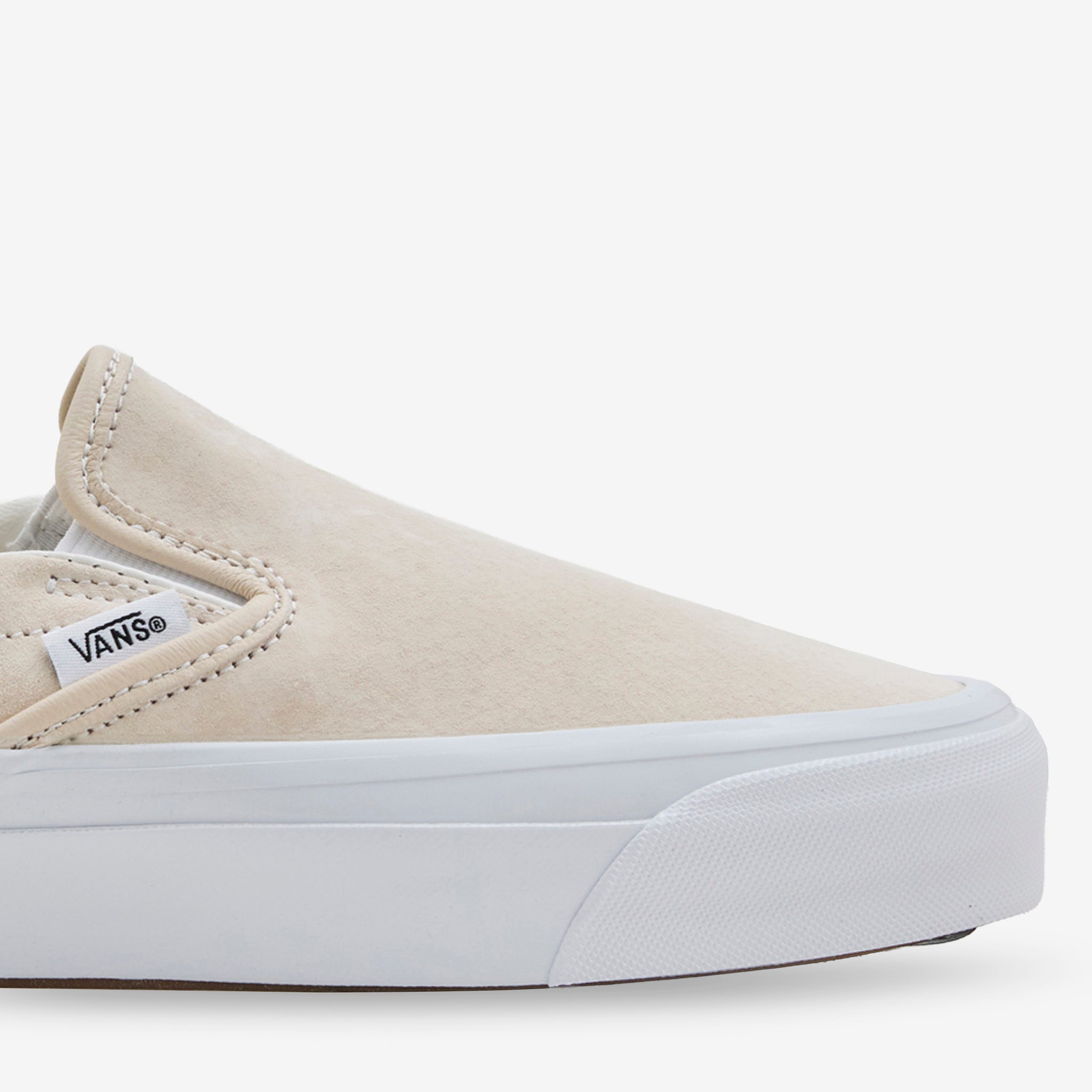 Men's LX Classic Slip-On 98 in Pig Suede Creme Brule from Vans. Slip on upper features cream suede construction with a full grain leather lining at the collar. Sola Foam All-Day-Comfort (ADC) anti-fatigue insole provides all day comfort while the higher gloss-finished sidewall with Osnaburg reinforcement offers structured support. Finished with a rubber outsole for traction.