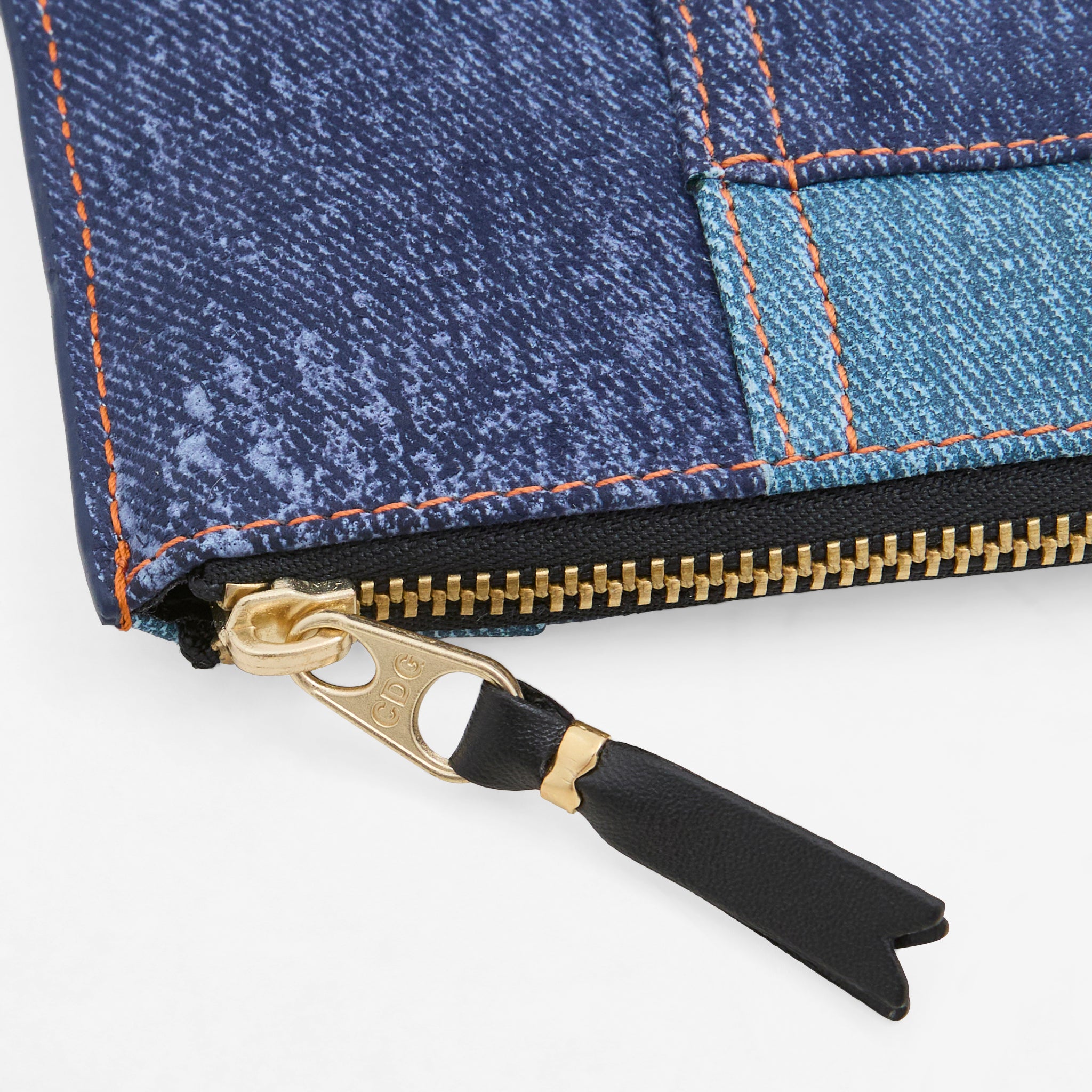 SA3100DP Denim Patchwork Wallet in Blue Denim from COMME des GARÇONS WALLET. Compact corner zip wallet with an internal coin pouch for easy organisation. Crafted from denim print lambskin with a soft leather interior. Finished with gold hardware and gold foil Comme des Garçons branding on the interior.
