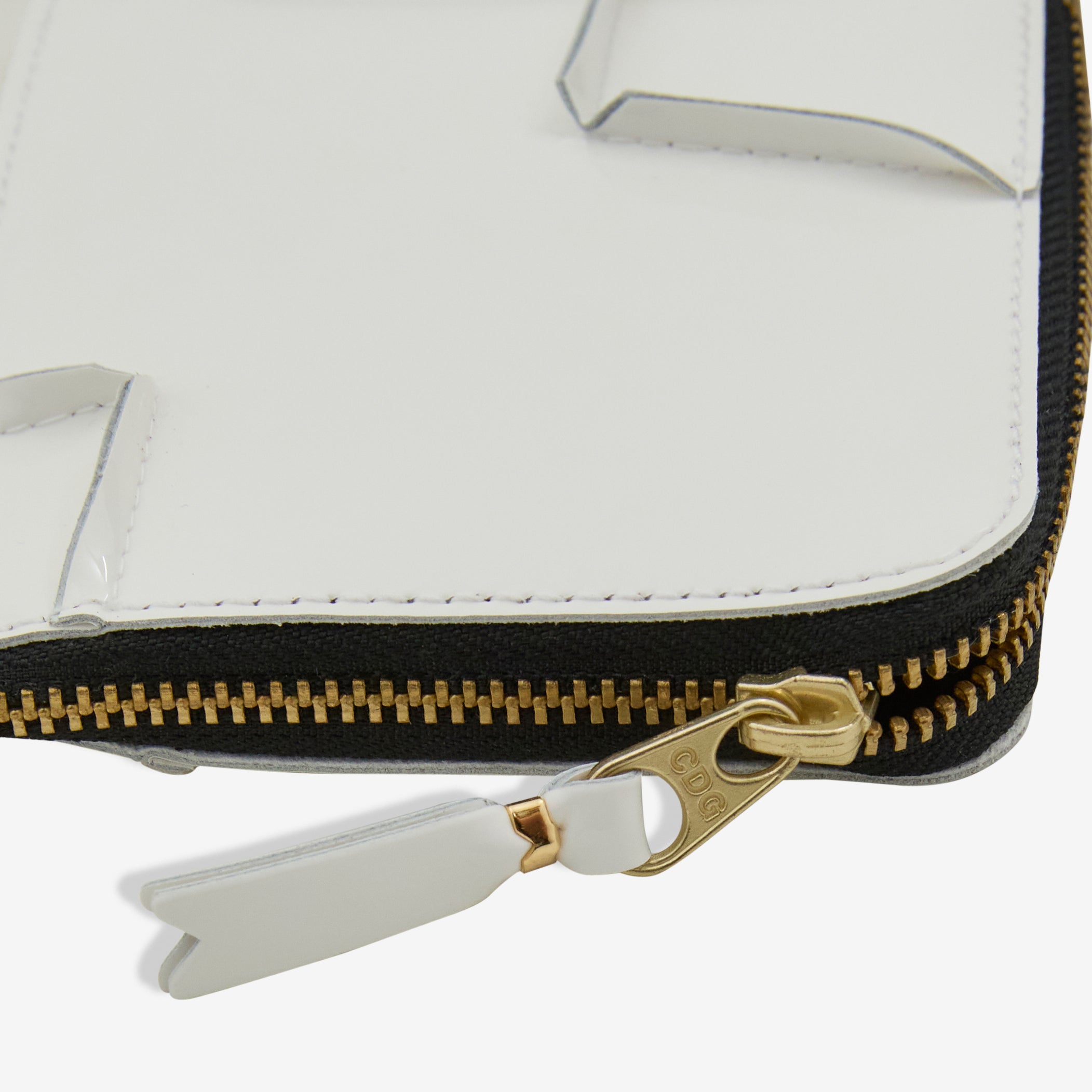 SA3100RH Reversed Hem Wallet in White from COMME des GARÇONS WALLET. Compact corner zip wallet with an internal coin pouch for easy organisation. Crafted from glossed patent leather. Finished with reversed hem detailing on the exterior, gold hardware and debossed Comme des Garçons branding on the interior.