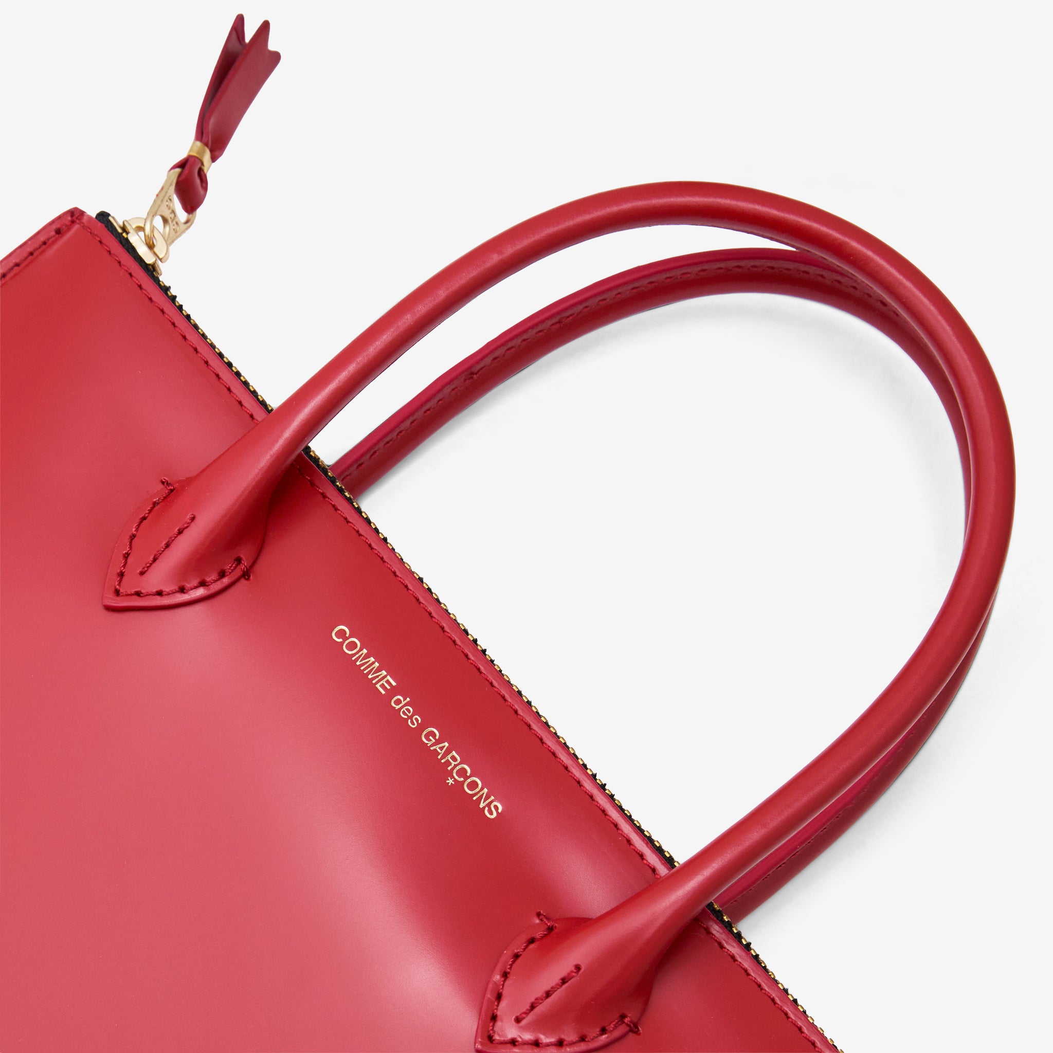 SA5100HA Handles Wallet in Red from from COMME des GARÇONS WALLET. Large-size pouch wallet with zip closure at the top. Crafted from smooth bovine leather with two carry handles. Finished with gold hardware and gold foil Comme des Garçons branding on the exterior.