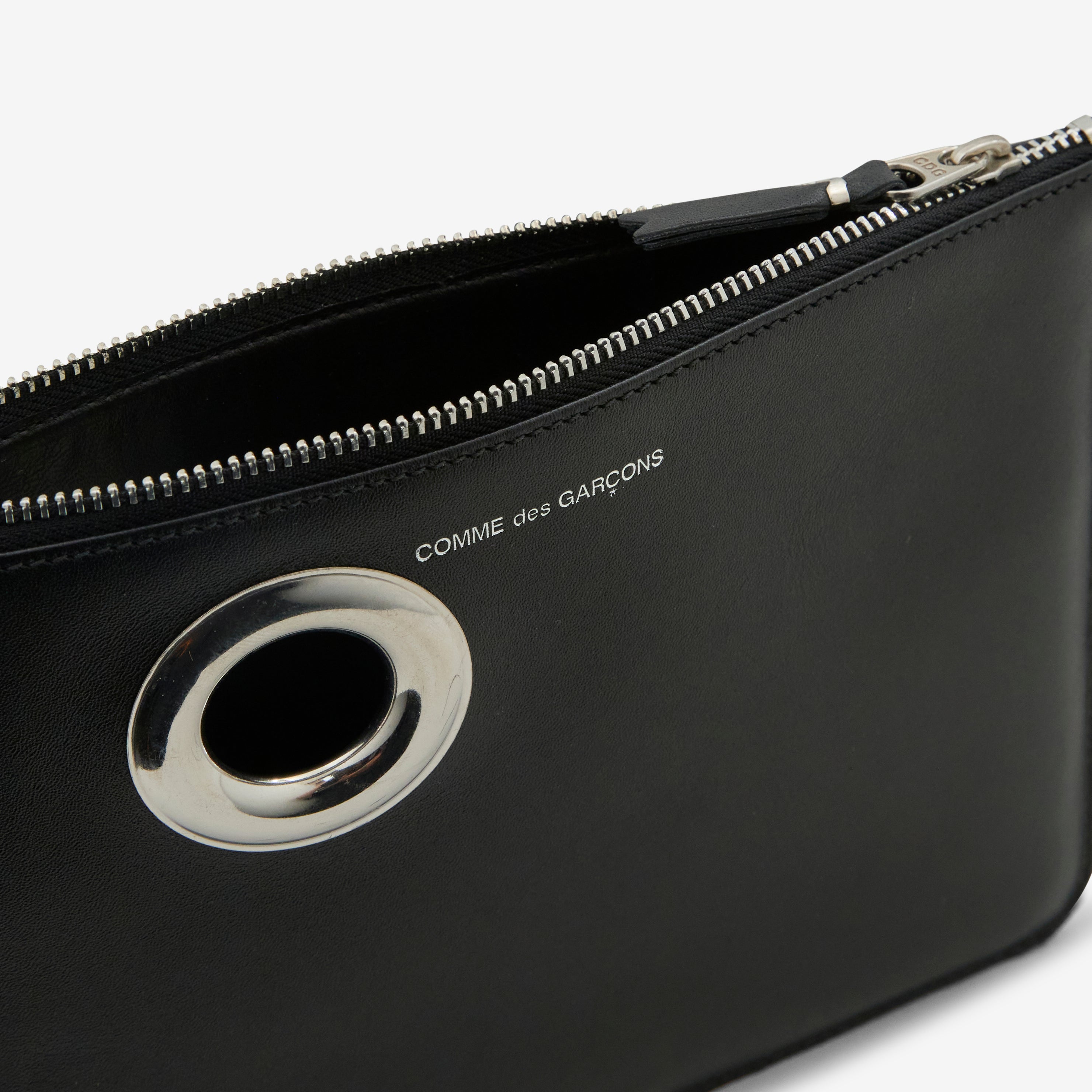 SA5100SE Silver Eyelet Wallet in Black from COMME des GARÇONS WALLET. Large-size pouch wallet with zip closure at the top. Crafted from smooth bovine leather. Finished with a large eyelet on the exterior, silver hardware and silver foil Comme des Garçons branding on the interior.