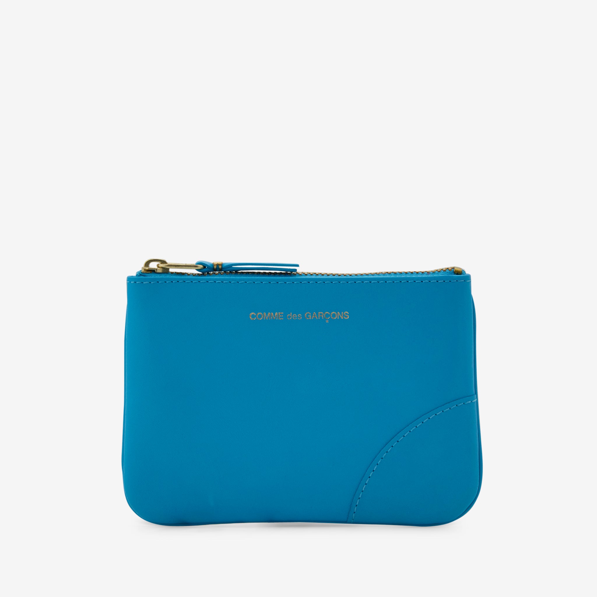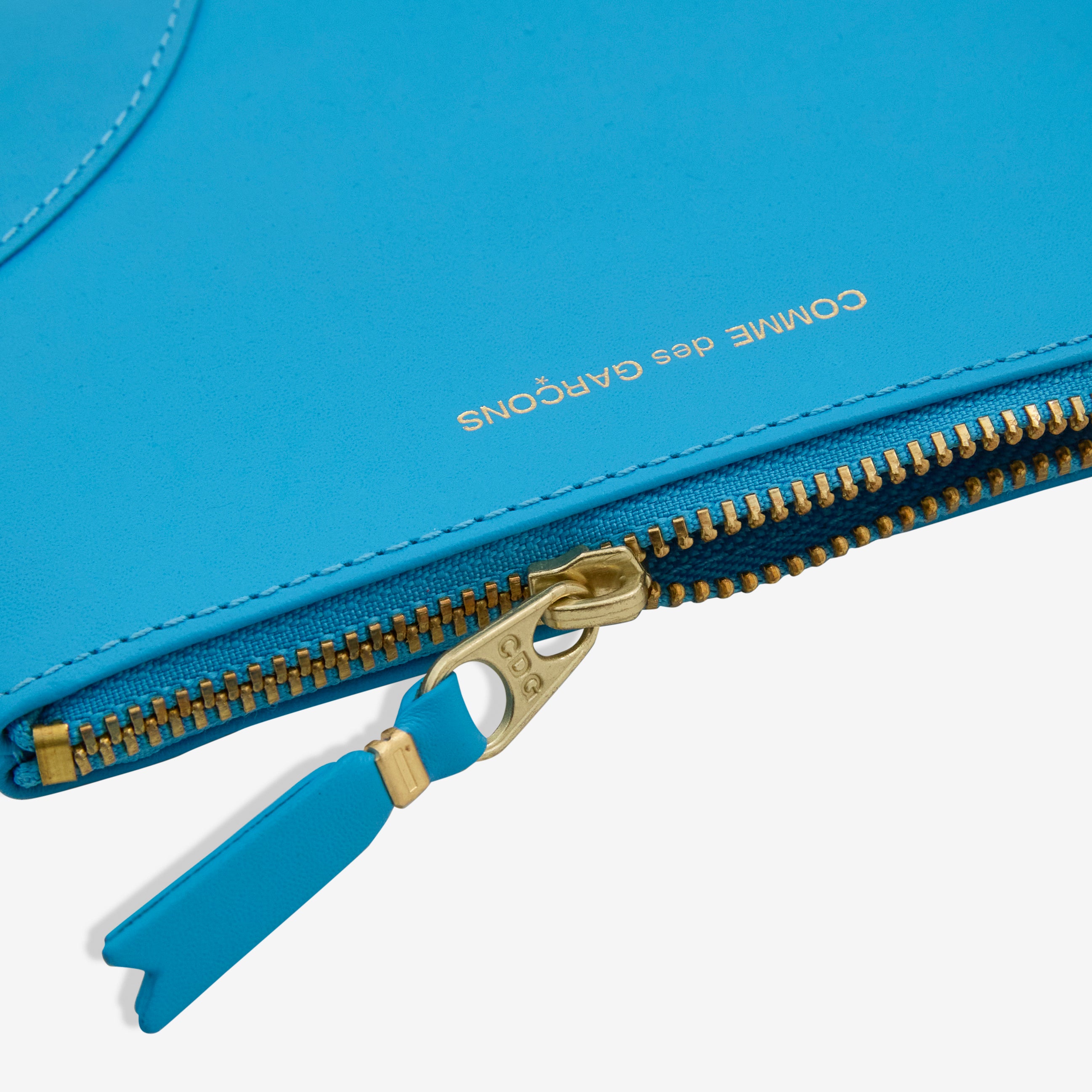 SA8100 Classic Line Wallet in Blue from COMME des GARÇONS WALLET. Small-size pouch wallet with zip closure at the top and a tonal curved patch on bottom right corner. Crafted from smooth bovine leather. Finished with gold hardware and gold foil Comme des Garçons branding on the exterior.