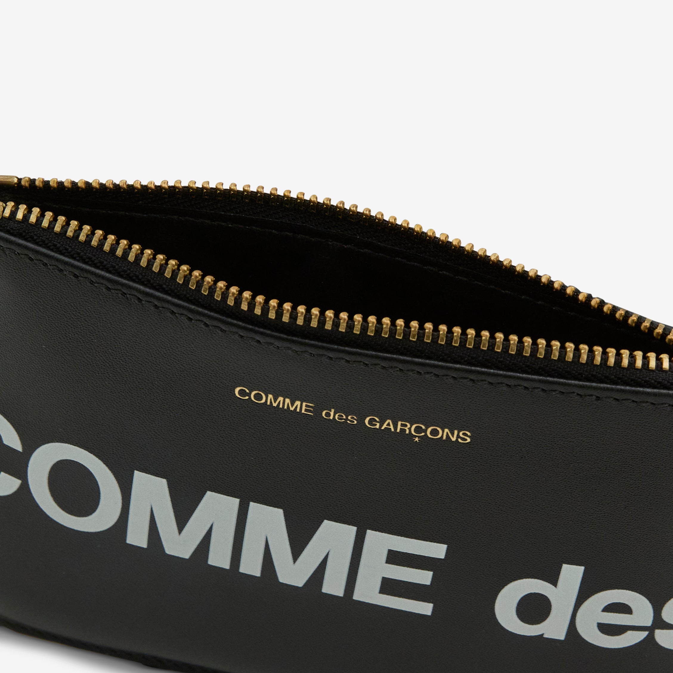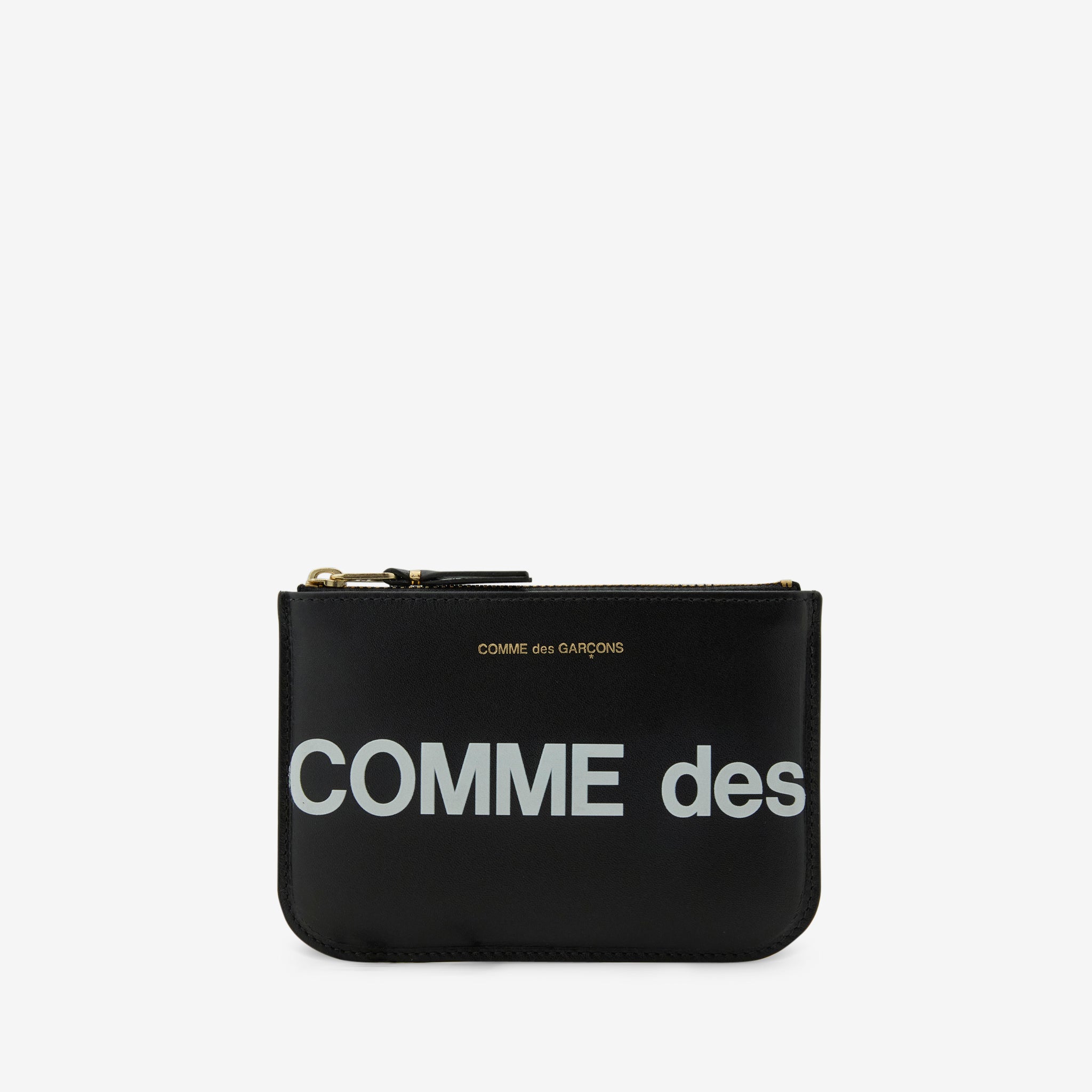 SA8100HL Huge Logo Wallet in Black from COMME des GARÇONS WALLET. Small-size pouch wallet with zip closure at the top. Crafted from smooth bovine leather with an oversized logo print. Finished with gold hardware and gold foil Comme des Garçons branding on the exterior.