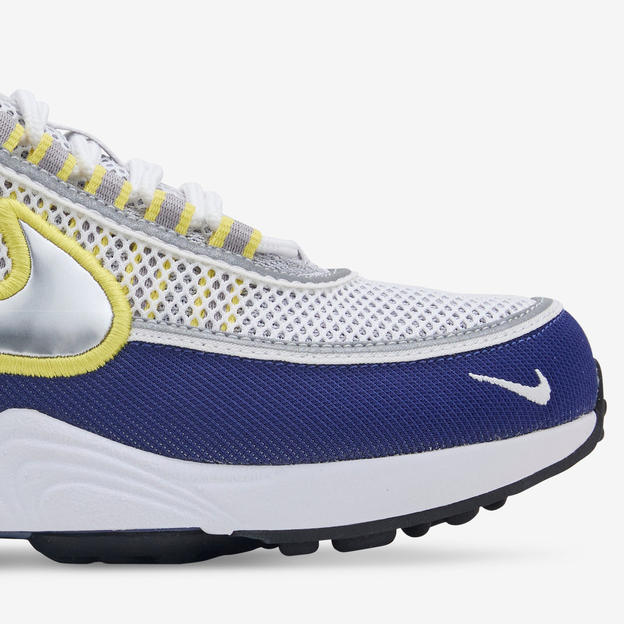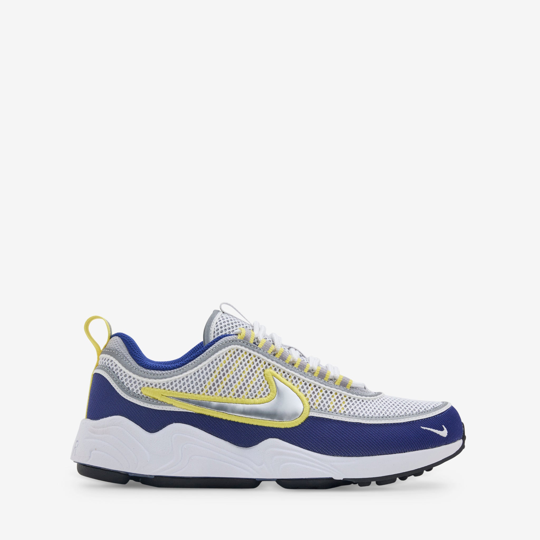 Men's Air Zoom Spiridon SP in White, Metallic Silver and Deep Royal Blue from Nike. Originally released in 1997, the Air Zoom Spiridon returns with a breathable upper constructed with mesh and textile for a layered, lightweight look. Zoom Air cushioned midsole offers bouncy everyday comfort whilst the sculpted rubber outsole provides classic traction. Finished with contrast yellow trims throughout.