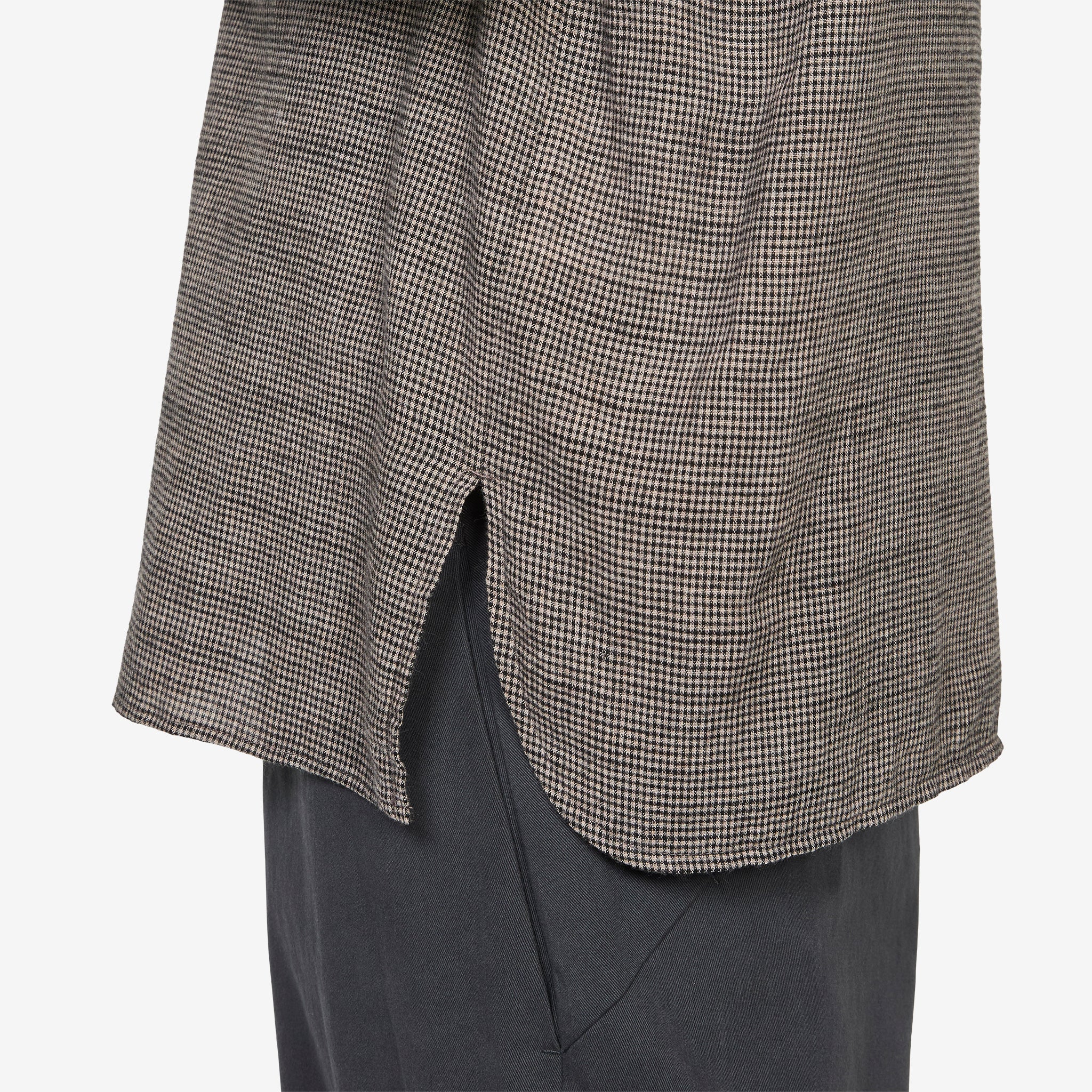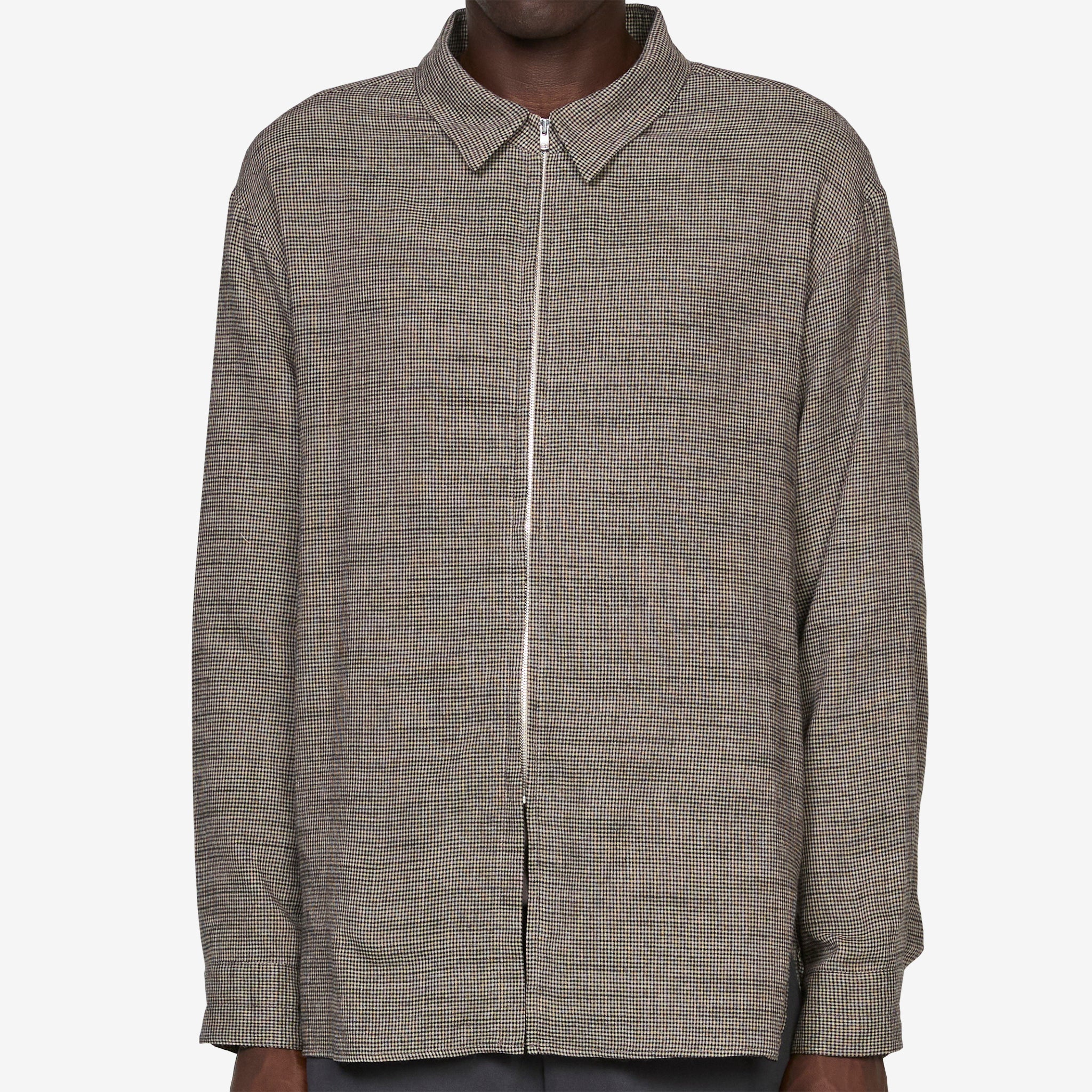 Archive Zip Shirt in Dusk from Post Archive Faction (PAF). Relaxed fit shirt with a straight collar and hidden YKK EXCELLA® zip closure. Crafted from a soft, lightweight cotton blend in an a micro-check pattern. Finished with curved slits at the hem and button closure cuffs.