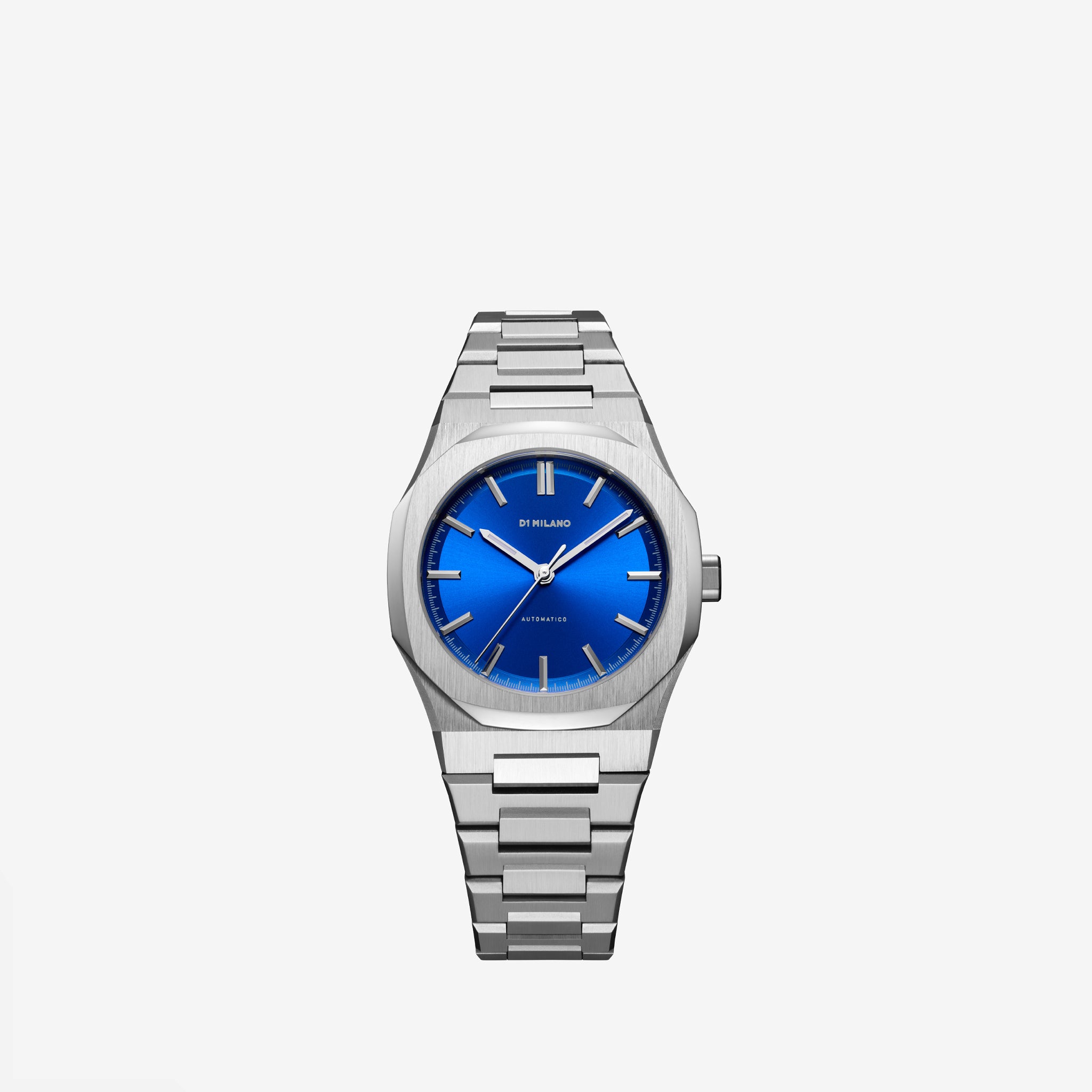 Automatico 36mm Watch in Navy Code from D1 Milano. Miyota 9039 movement watch with a 36mm, 316L stainless steel case and strap with hidden butterfly clasp closure. Minimalist green sunray dial with external azurage and silver brass hands and indexes. Sapphire glass with blue anti-reflective coating.
