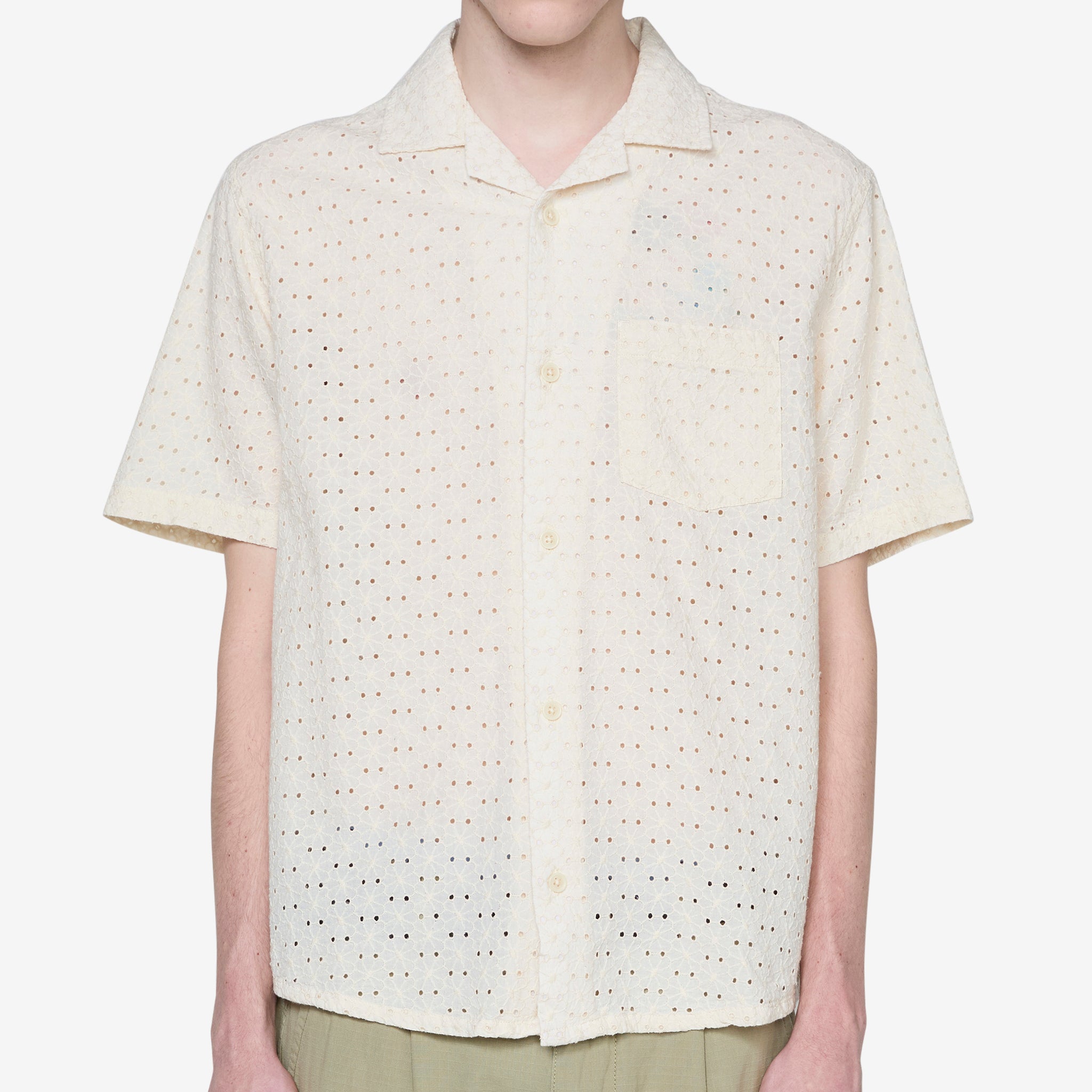 Men's Floral Eyelet Short Sleeve Shirt in Natural from Corridor NYC. Regular fit short sleeve shirt with a camp collar, full button closure and a straight hem. Crafted from cotton with an all-over floral texture with eyelets for a light feel. Finished with a patch pocket on the chest.