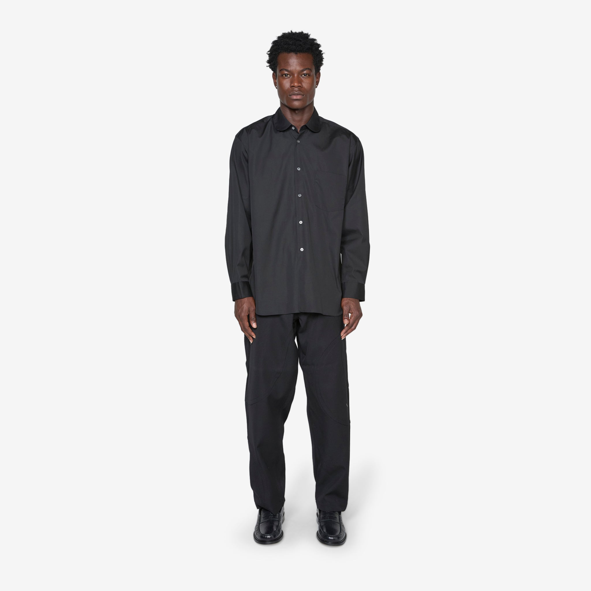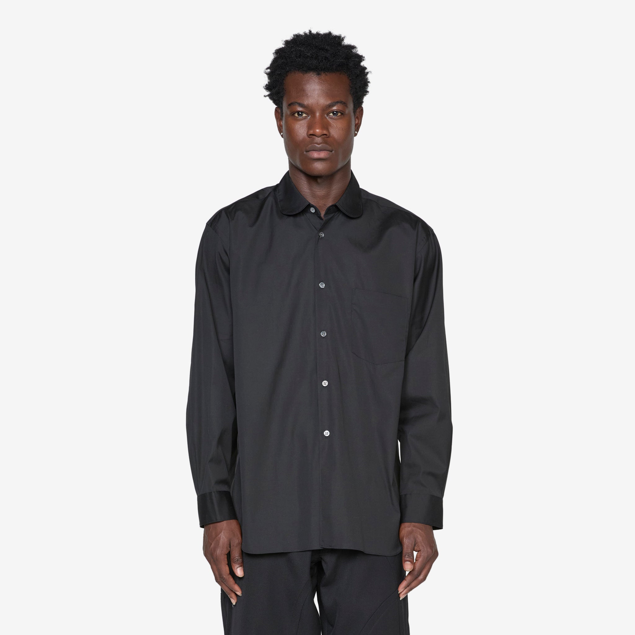 Forever Rounded Collar Shirt in Black from Comme des Garçons SHIRT. Relaxed fit longsleeve shirt with a rounded collar, full button closure and curved hem. Crafted from premium cotton and finished with a single patch pocket at the chest.