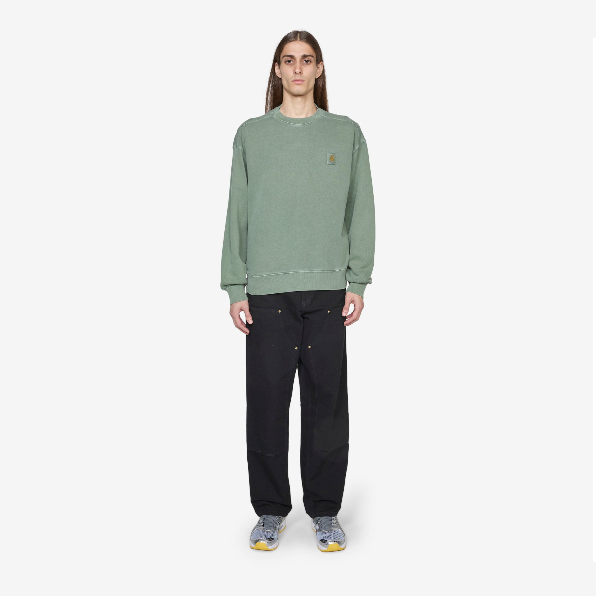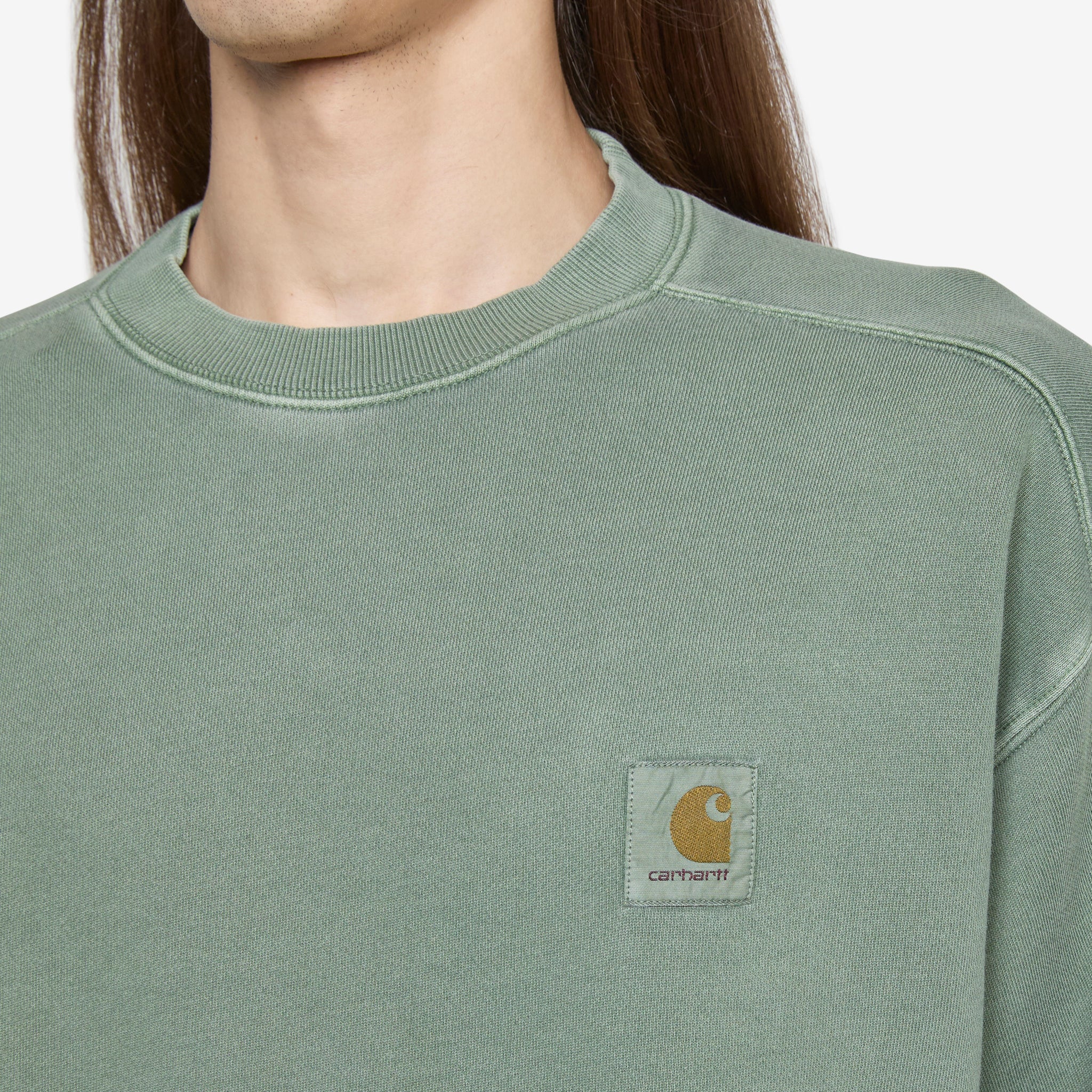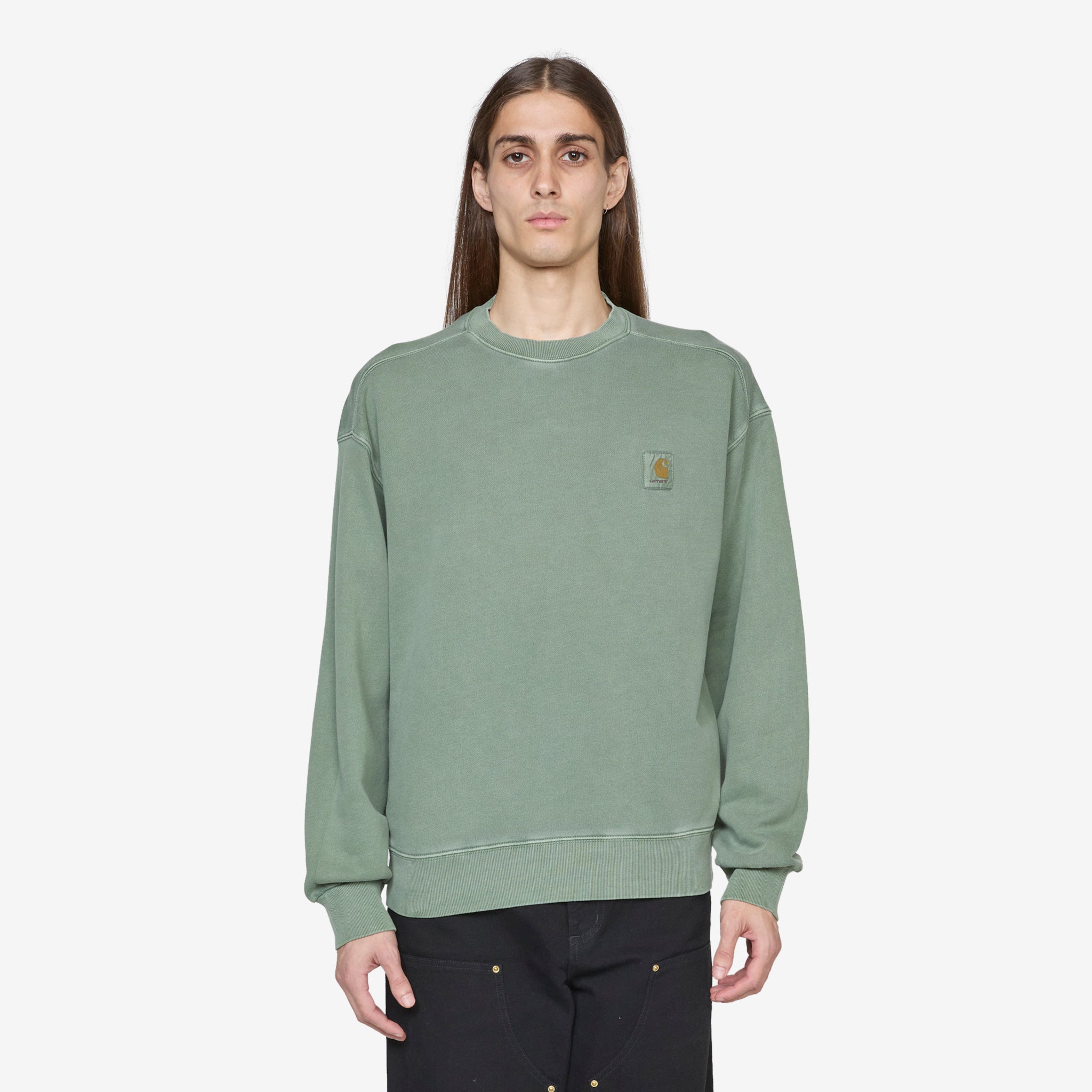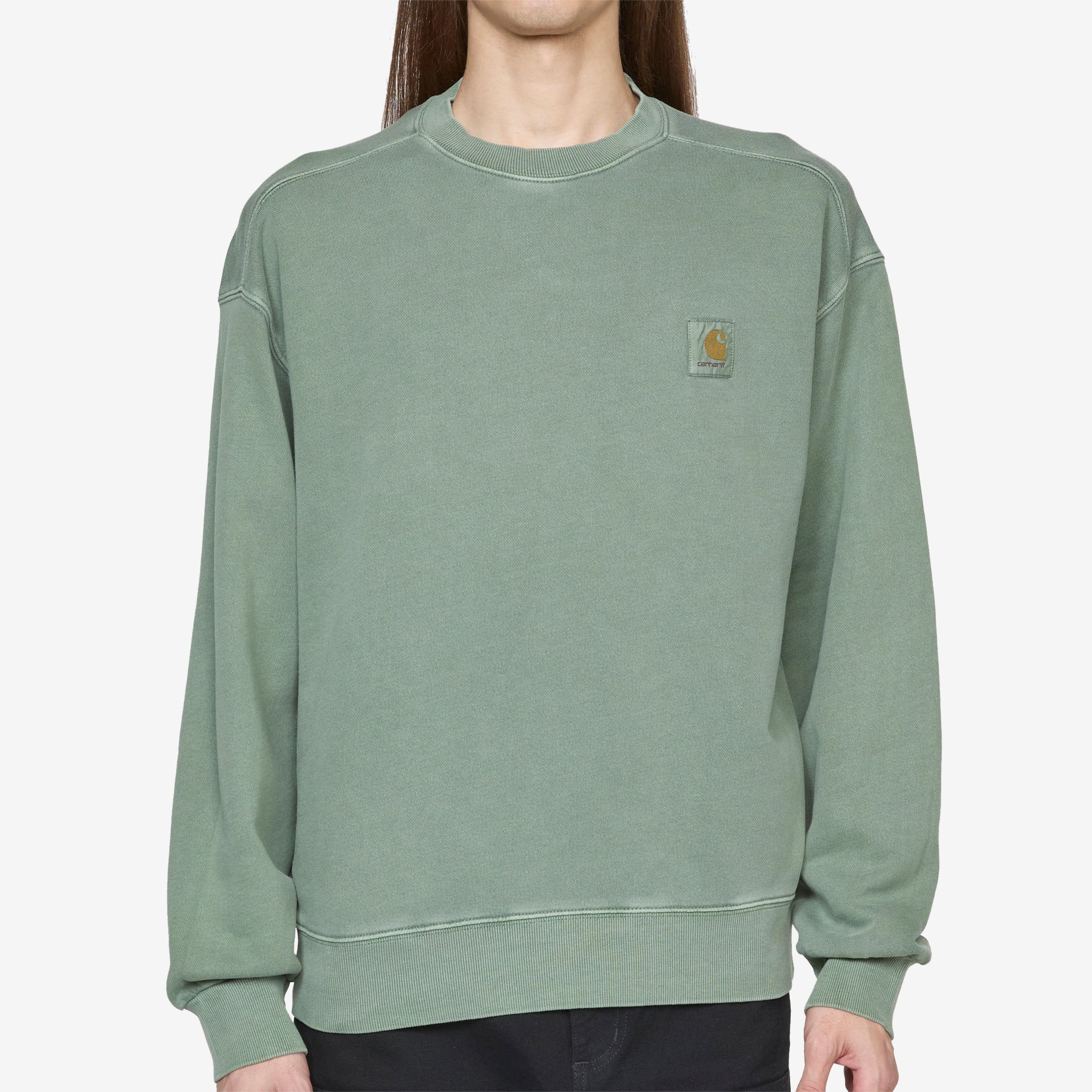 Men's Nelson Sweat in Park from Carhartt WIP. Relaxed fit, pullover sweatshirt with ribbed trims. Crafted from 10.9oz unbrushed cotton fleece, which has been pigment dyed for a worn look. Finished with a woven brand patch on the chest.