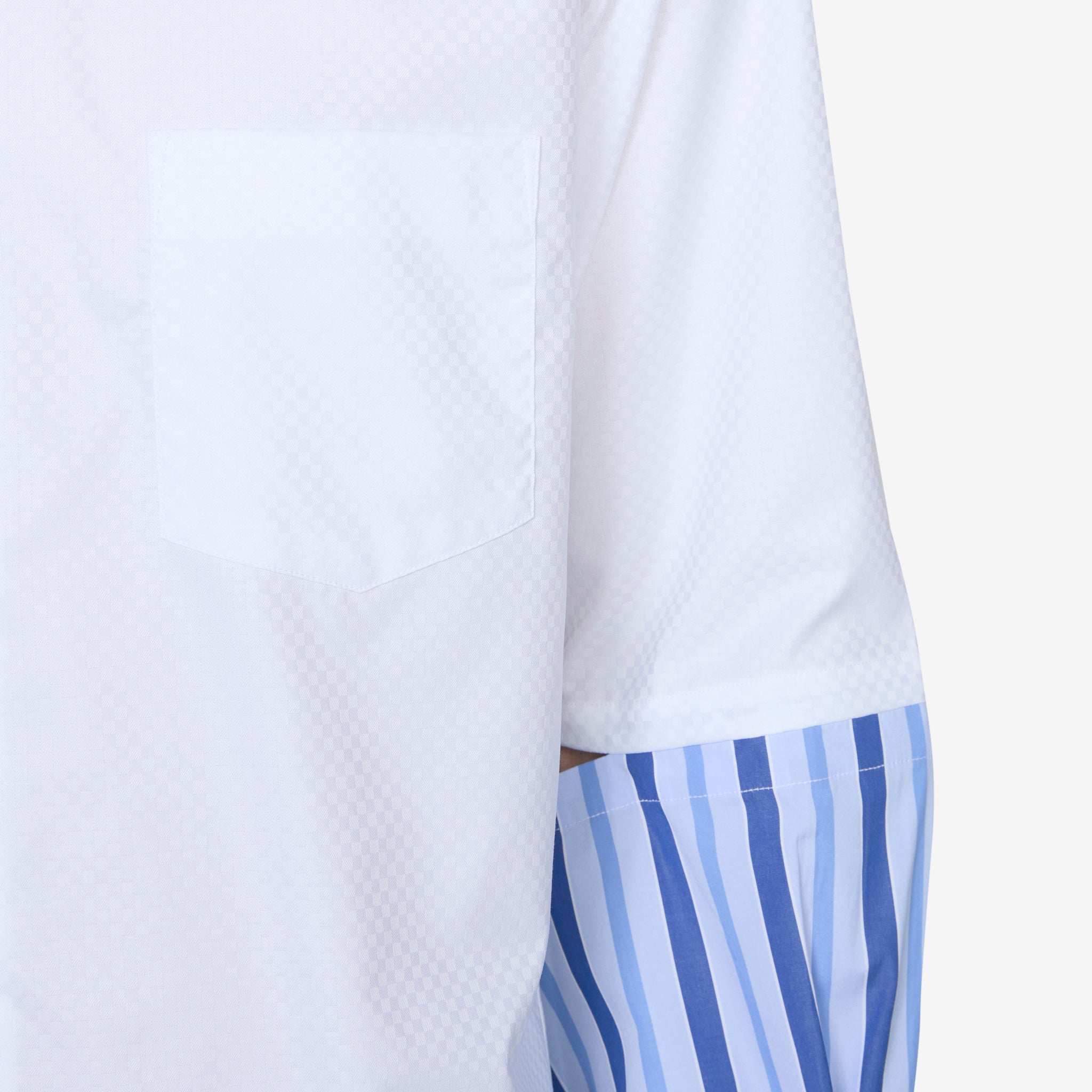 Men's Shirt in White and Stripe from Comme des Garçons SHIRT. Relaxed fit longsleeve shirt with a classic collar, full button closure, a curved hem and cut-outs on the sleeves. Crafted from cotton in an all-over tonal checkered print with contrast sleeves. Finished with a single patch pocket on the chest.