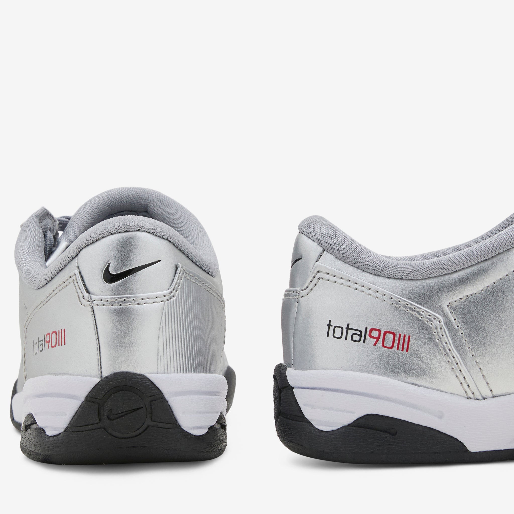Total 90 SP in Metallic Silver, Black and University Red from Nike. A reimagined football boot silhouette featuring a synthetic quilted leather upper with asymmetrical lacing. Plush padded collar provides daily comfort while the flat gum rubber outsole offers durable traction. Finished with iconic Total 90 legacy graphics and detailing throughout.