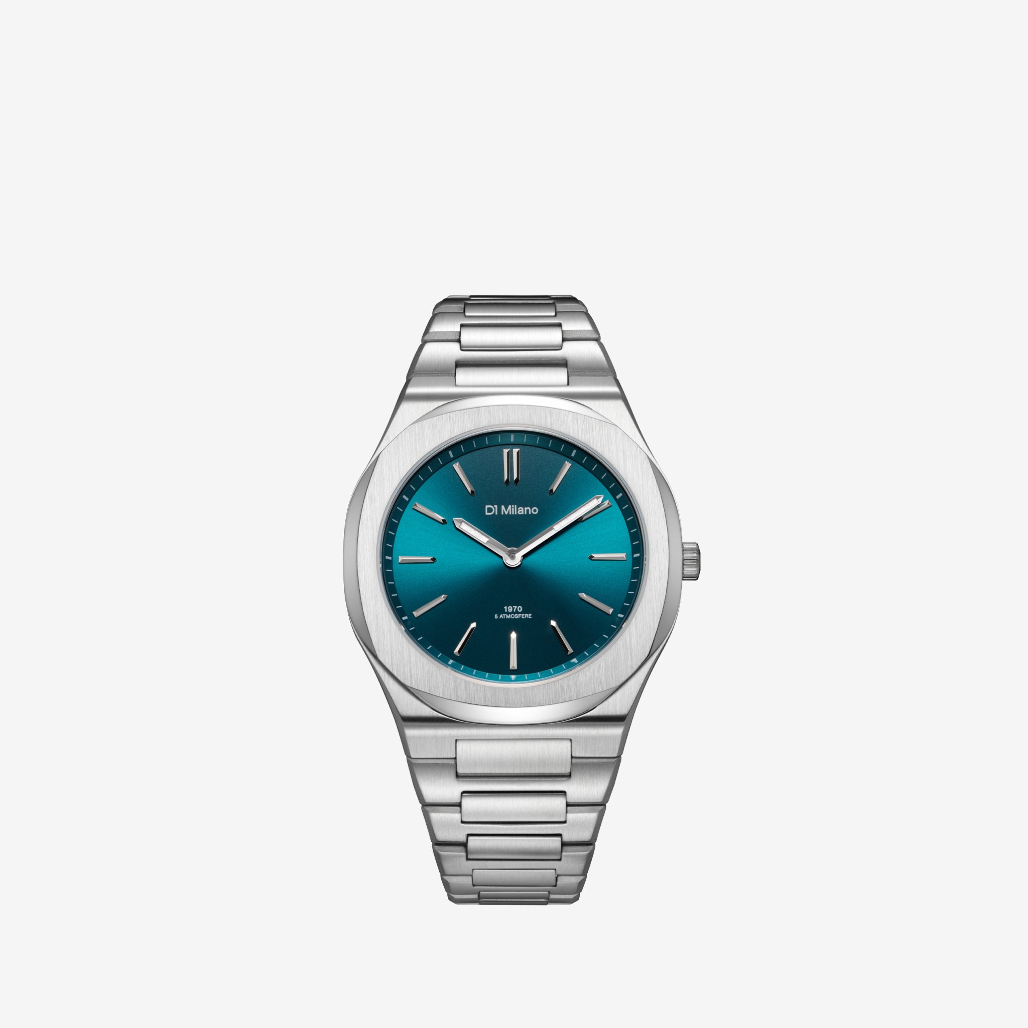 Ultra Thin Bracelet 39mm Watch in Groovy Green from D1 Milano. Quartz movement watch with a 39mm, rounded silver stainless steel case and strap in a brushed and polished finish with hidden butterfly clasp closure. Contrast Soleil Petrol Green dial with silver brass hands and indexes. Sapphire glass with anti-reflective coating.