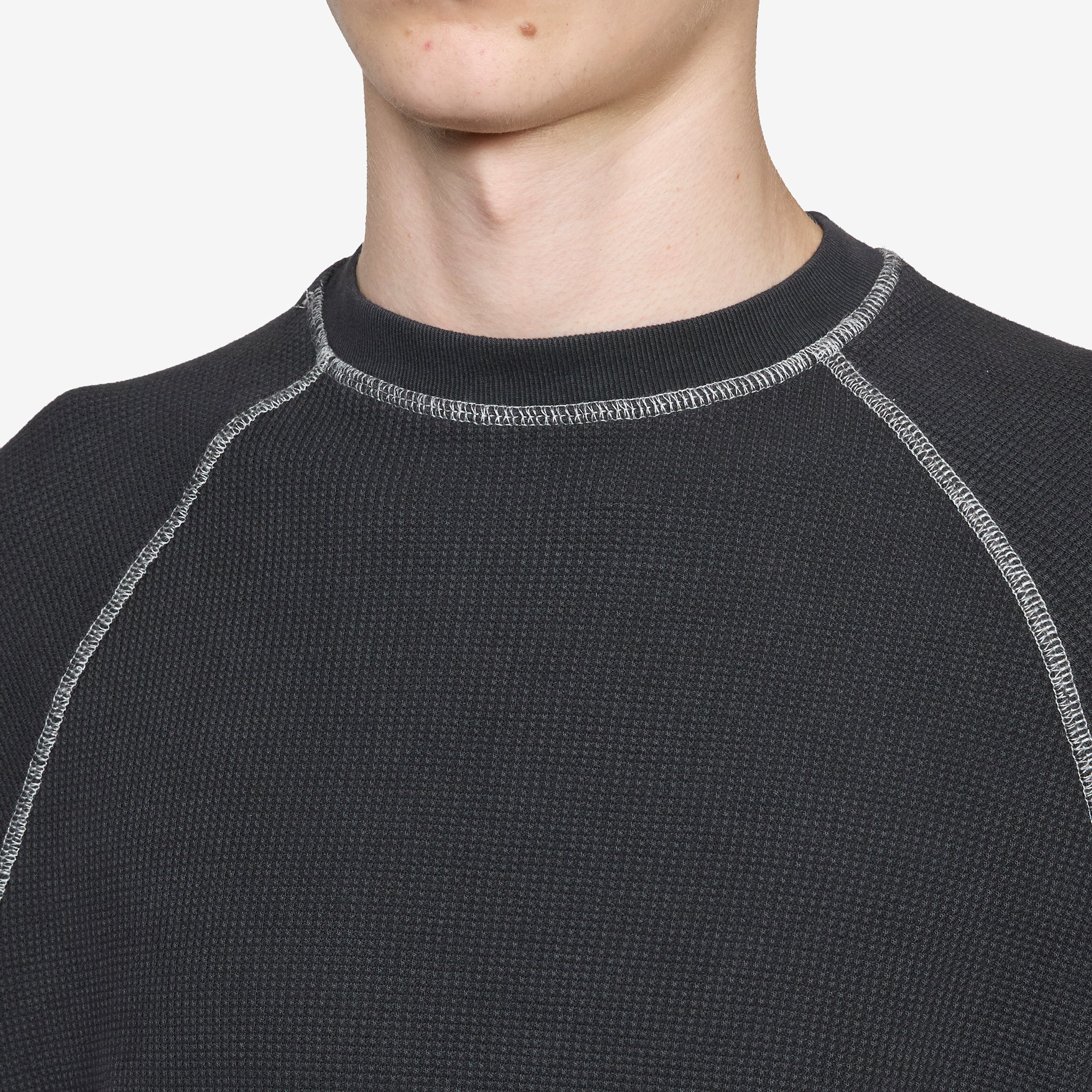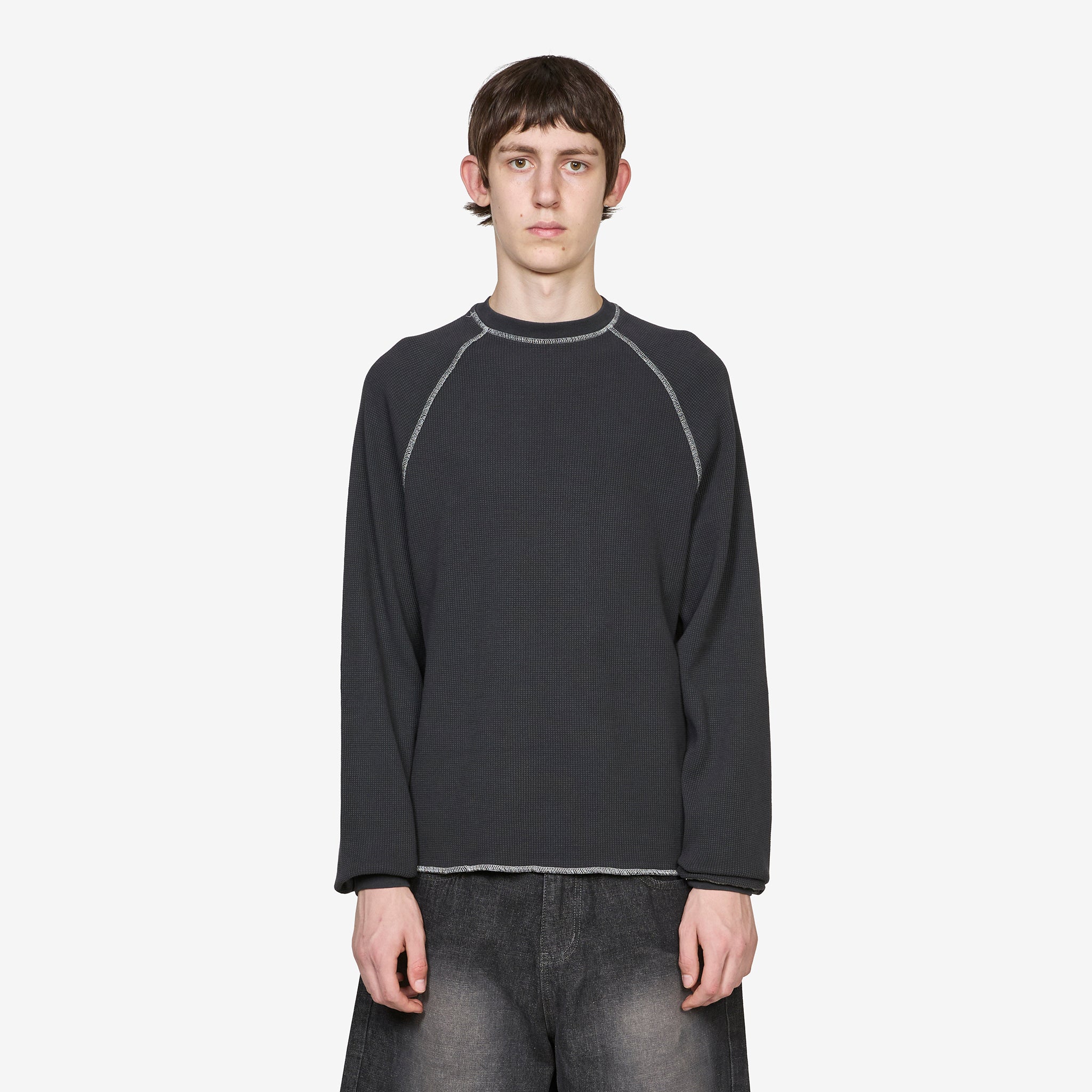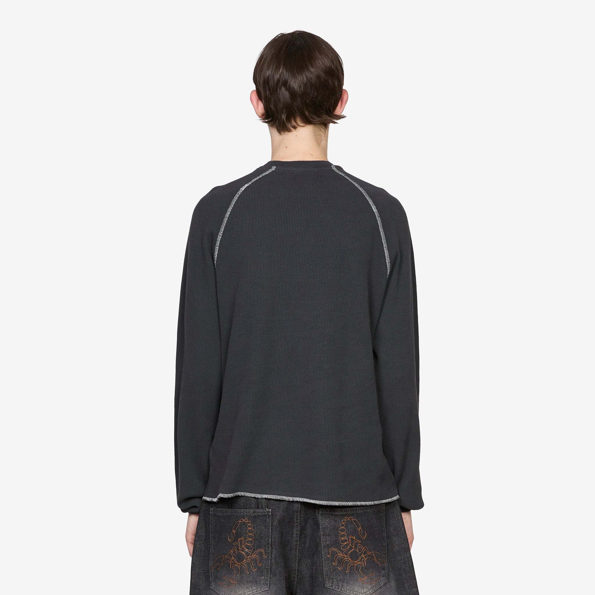 Waffle Longsleeve Top in Washed Black from Butter Goods. Relaxed fit long sleeve top with a straight loose hem, raglan sleeve construction and ribbed crew neckline and cuffs. Crafted from midweight cotton waffle jersey for breathability and comfort. Finished with contrast stitching and woven label detail at the hem.