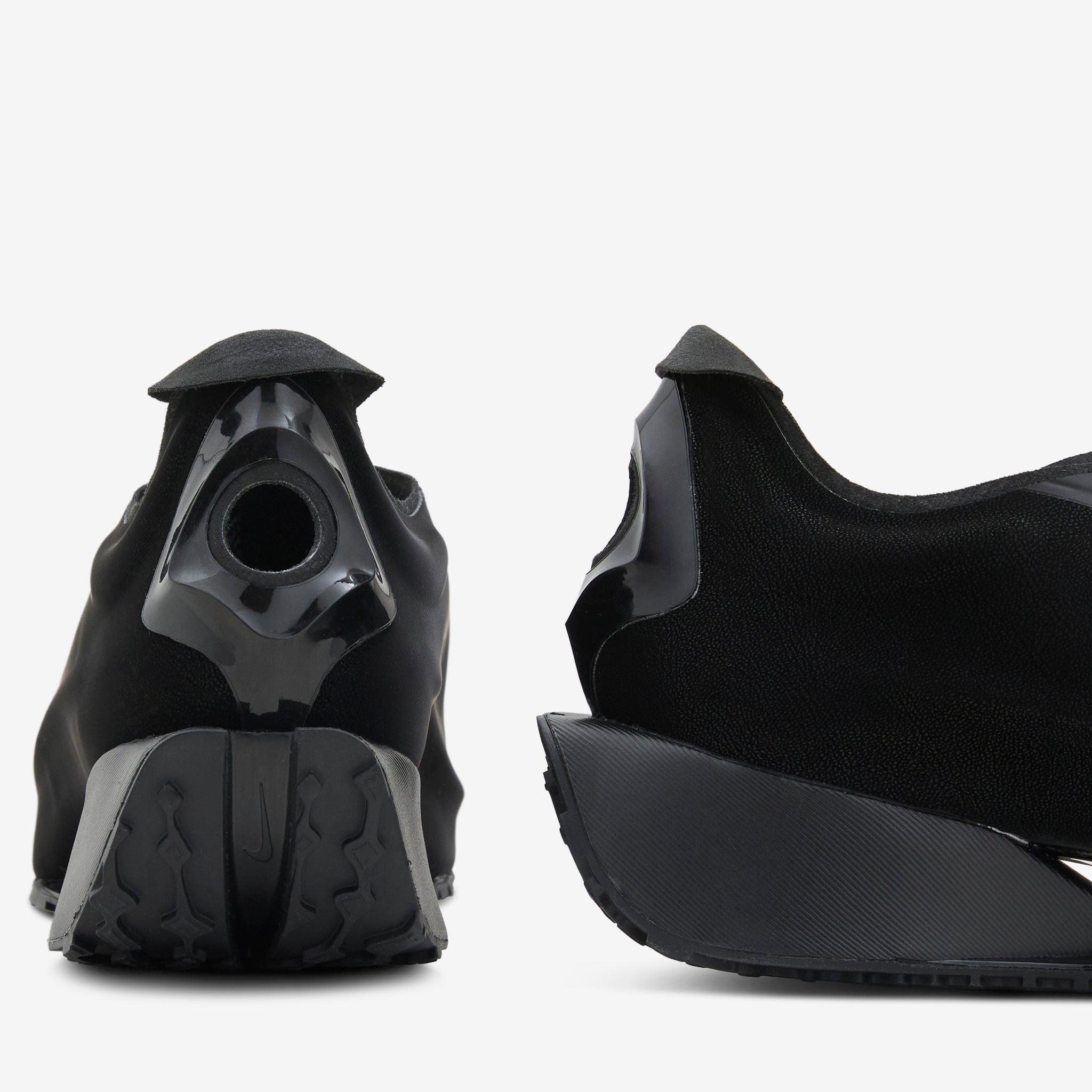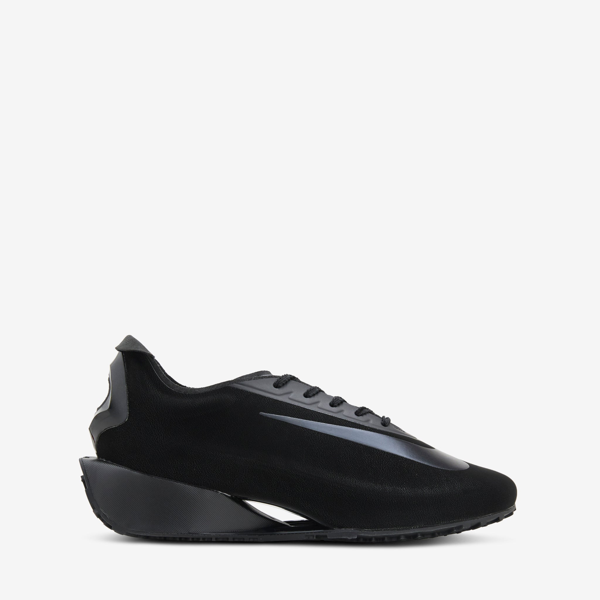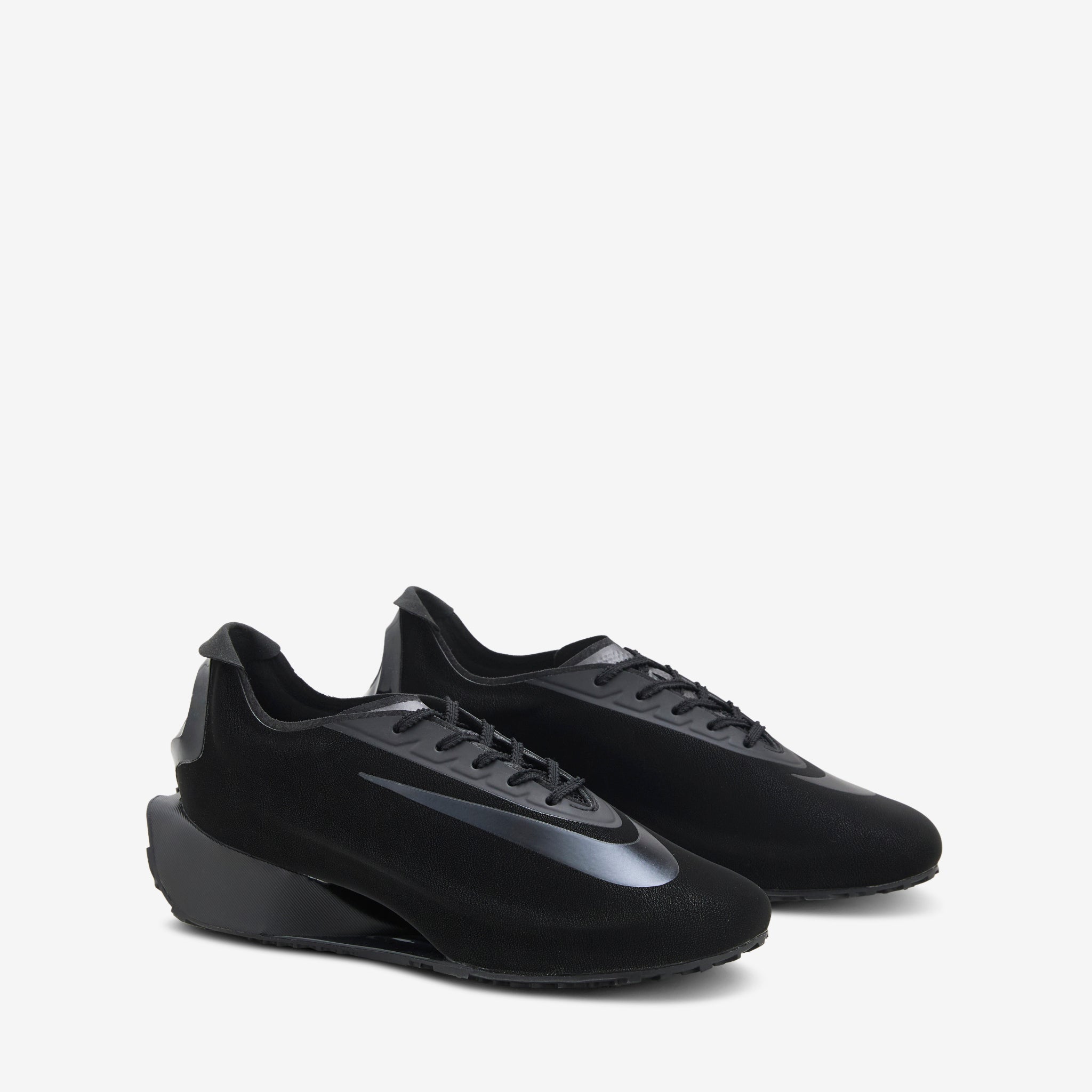 Women's First Sight Noir in Black, Black Metallic and Dark Grey from Nike. An all-new silhouette designed to push athletic style into new realms. Sleek one-piece upper features sculpted construction and a circular heel cutout that references Nike track spikes. Soft, thick angular foam midsole provides cushioning in every step. Finished with a branded, traction-focused rubber outsole.