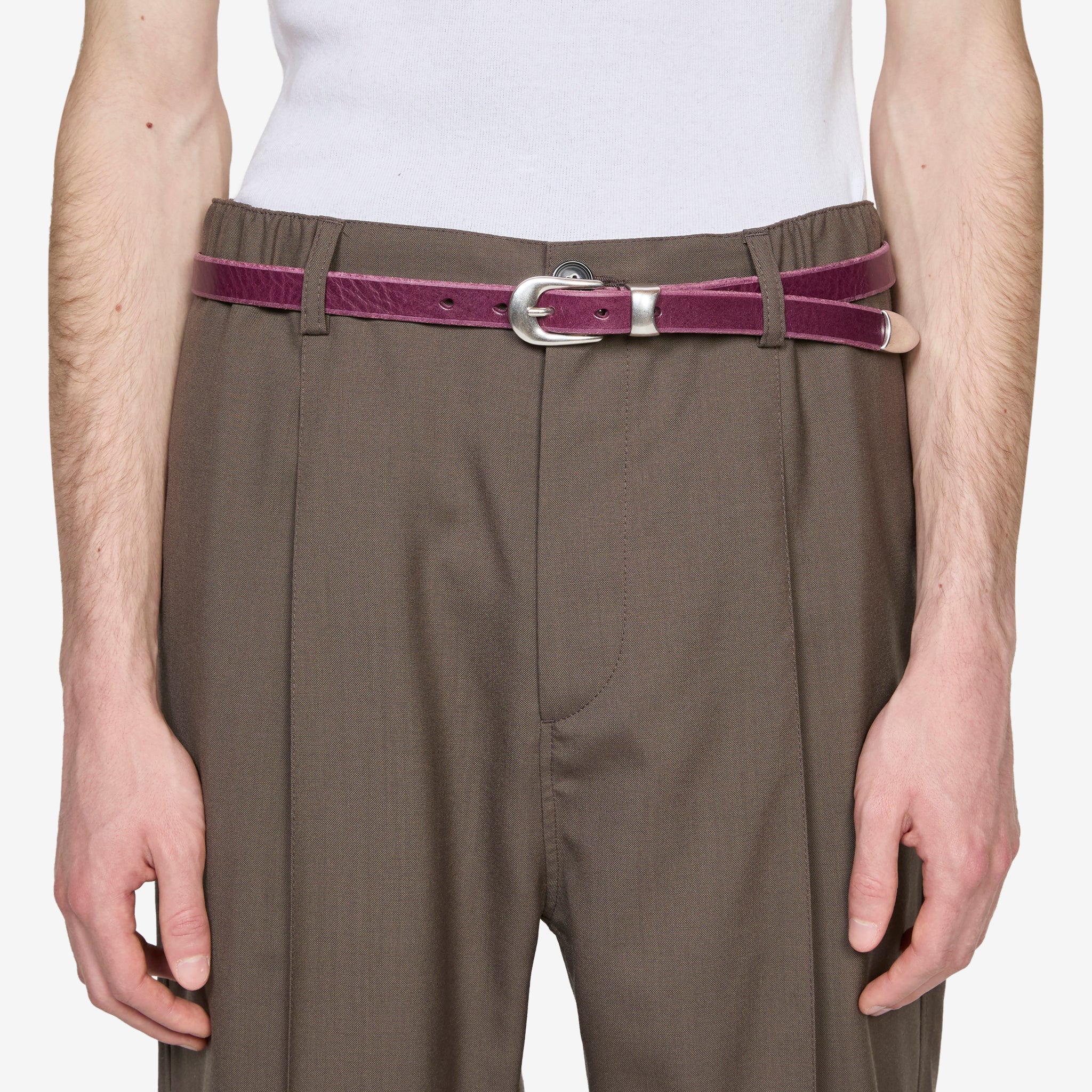 2cm Belt in Shadow Berry Leather from Our Legacy. Classic belt crafted from vegetable-tanned Italian leather with a metal pin buckle closure, keeper and tip and a dust bag cover.