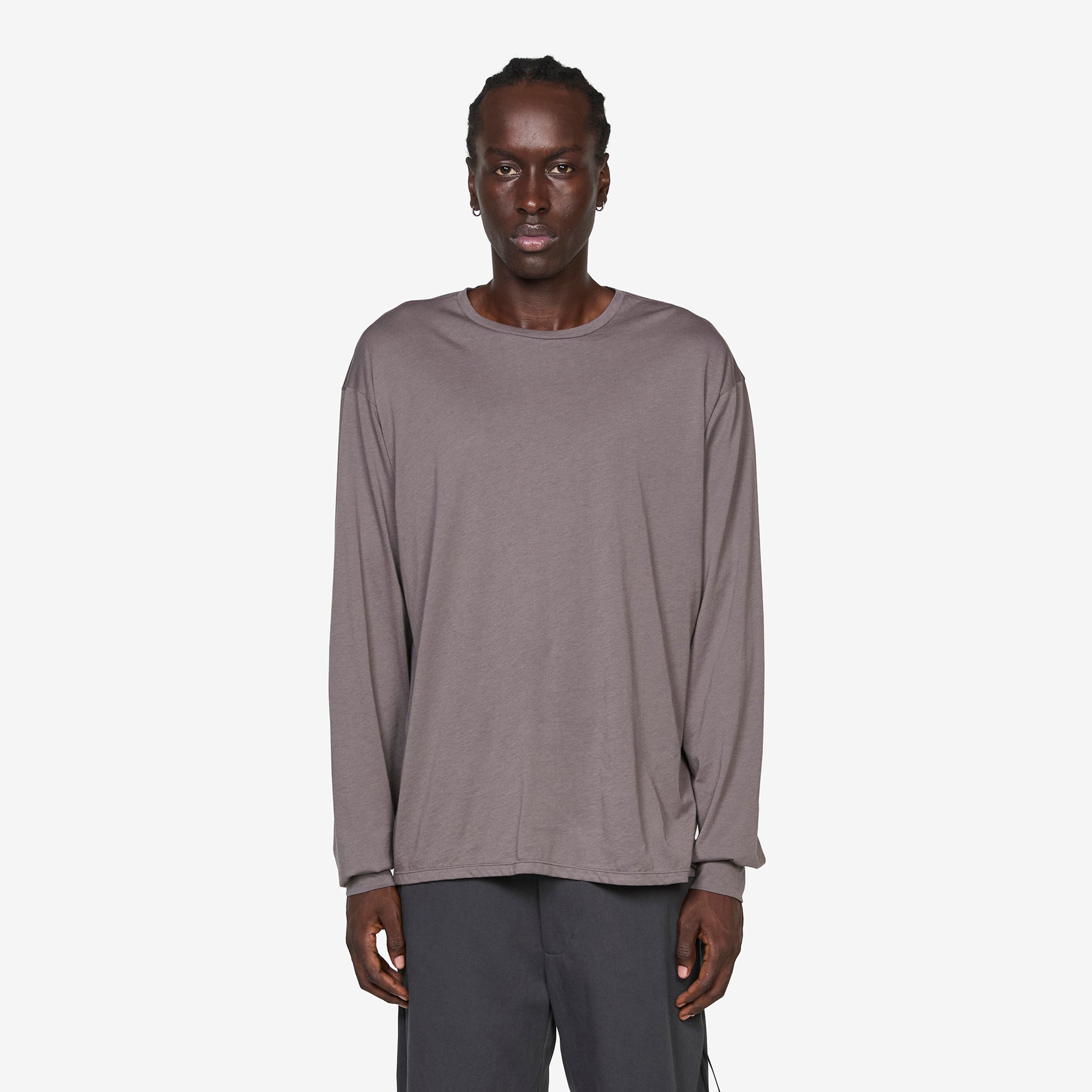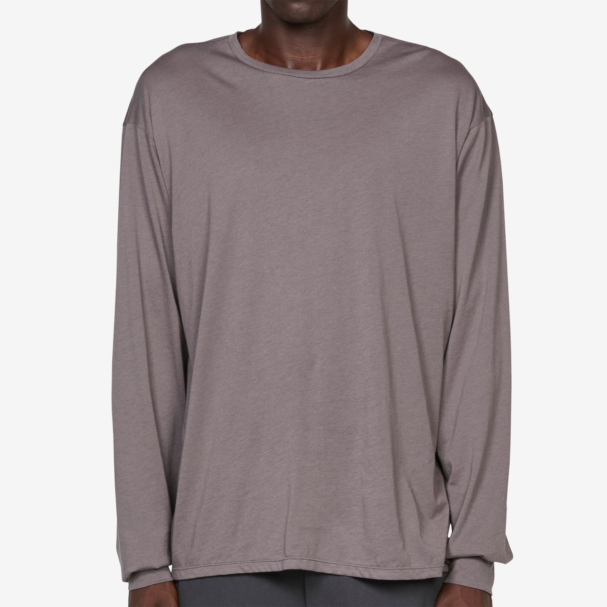 Archive Longsleeve T-Shirt in Charcoal from Post Archive Faction (PAF). Relaxed fit longsleeve t-shirt with a crew neckline, curved shoulder seems, cuffed sleeves and lightly ribbed trims. Crafted from a fine, lightweight 40s silk blend cotton jersey fabric.