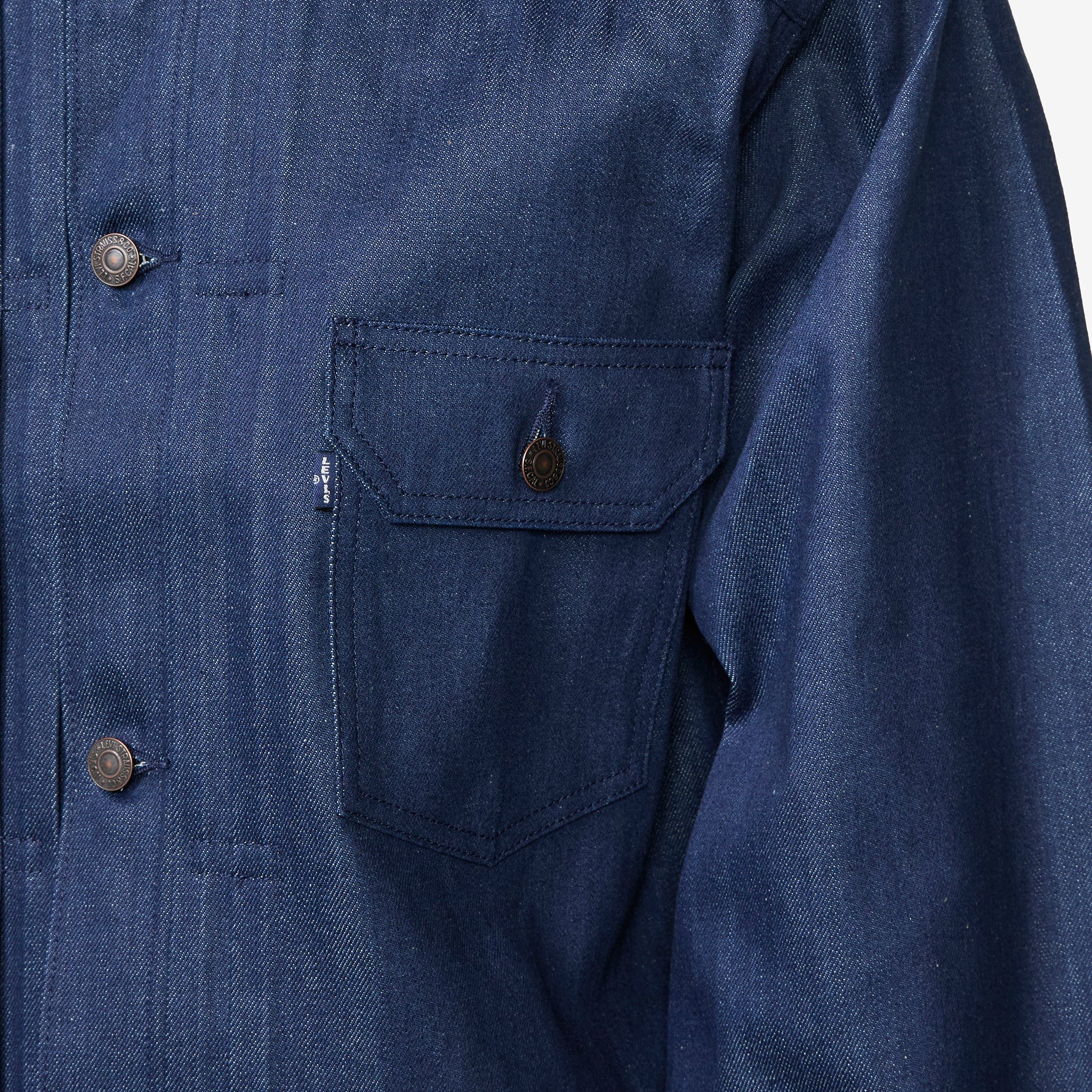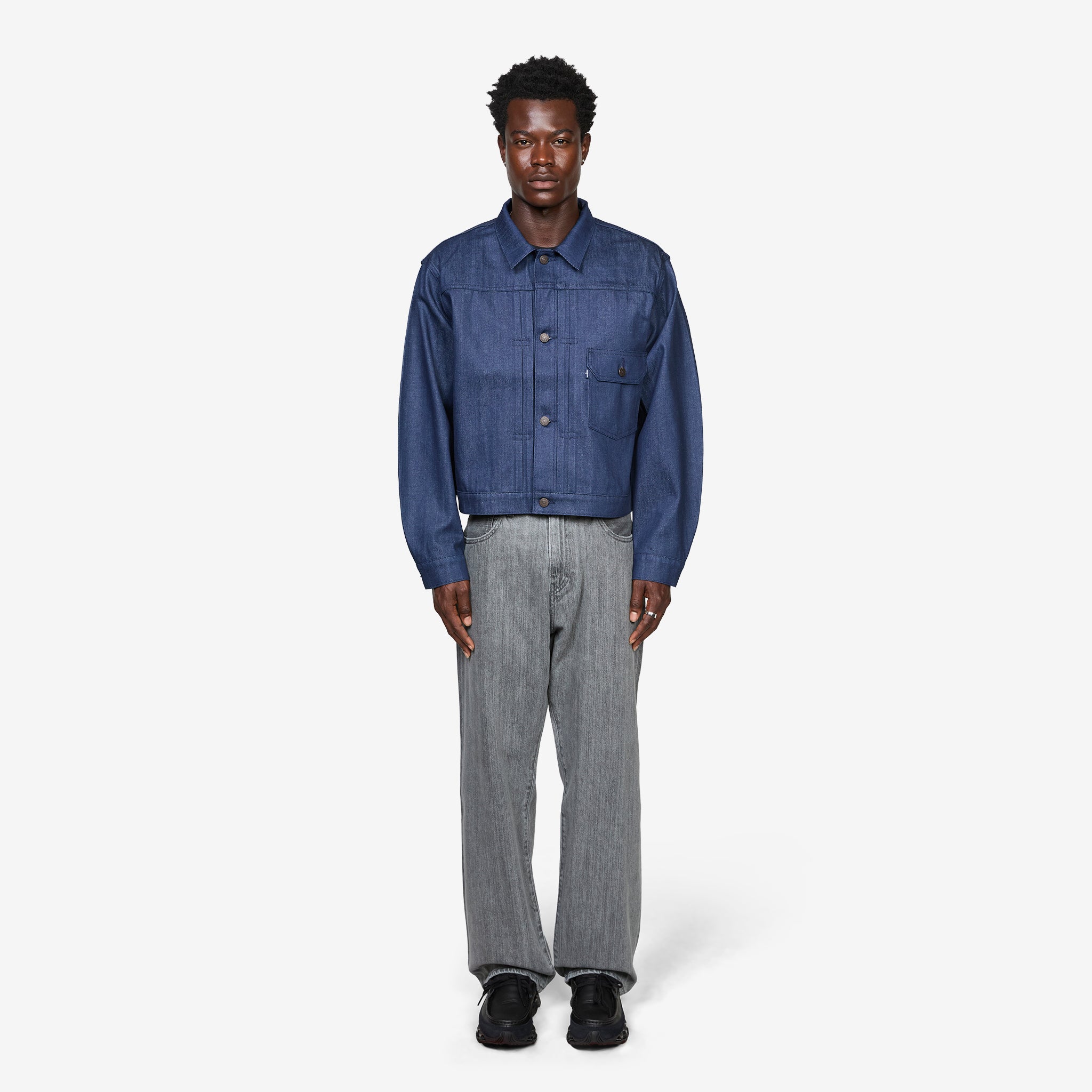 Blue Tab™ Type I Jacket in MIJ Deep Well Trucker from Levi's. Relaxed, boxy fit trucker jacket with a classic collar, metal button closure and signature double pleated details. Crafted from premium cotton denim with articulated sleeves for ease of movement. Finished with a flap-closure pocket at the torso and subtle Blue Tab™ branding.