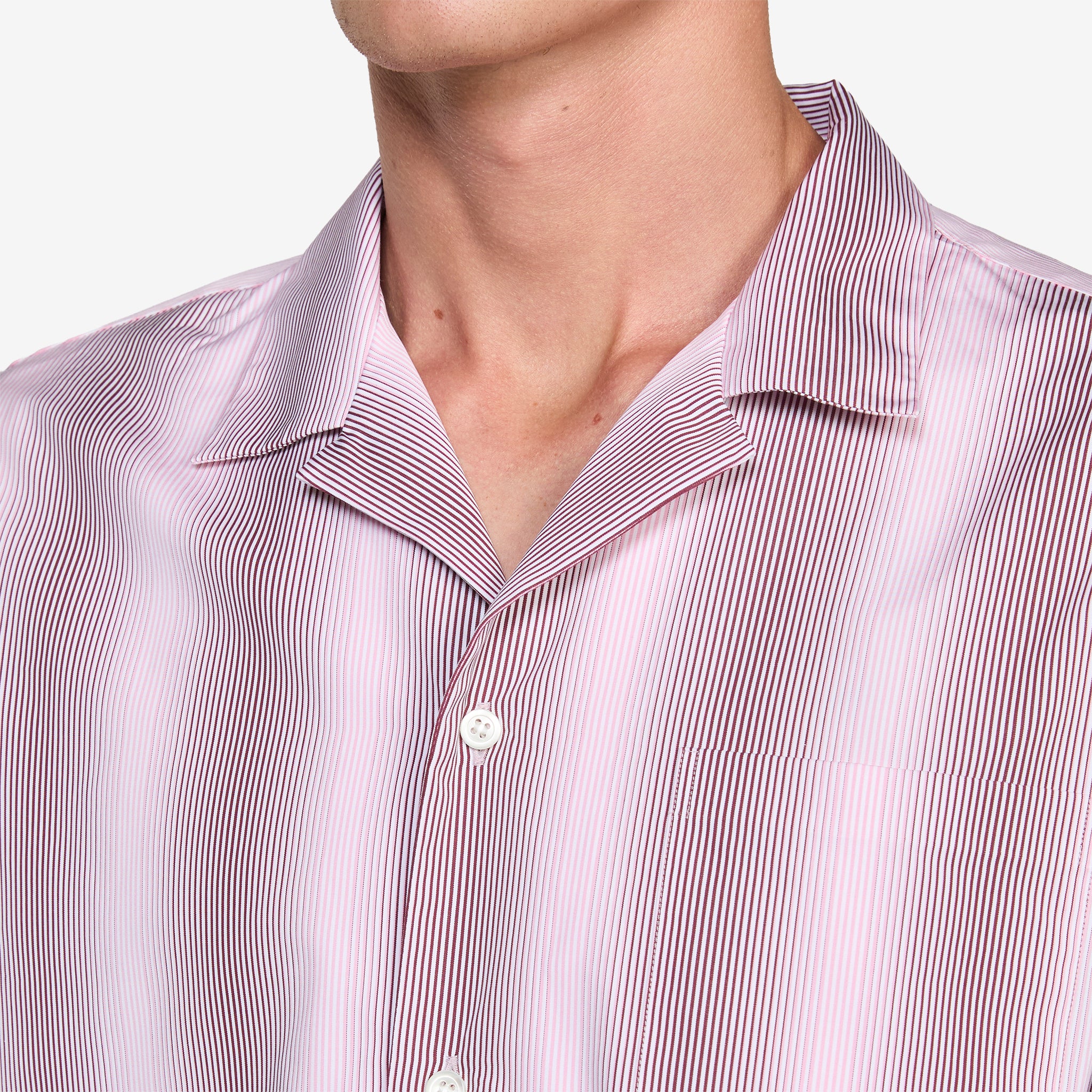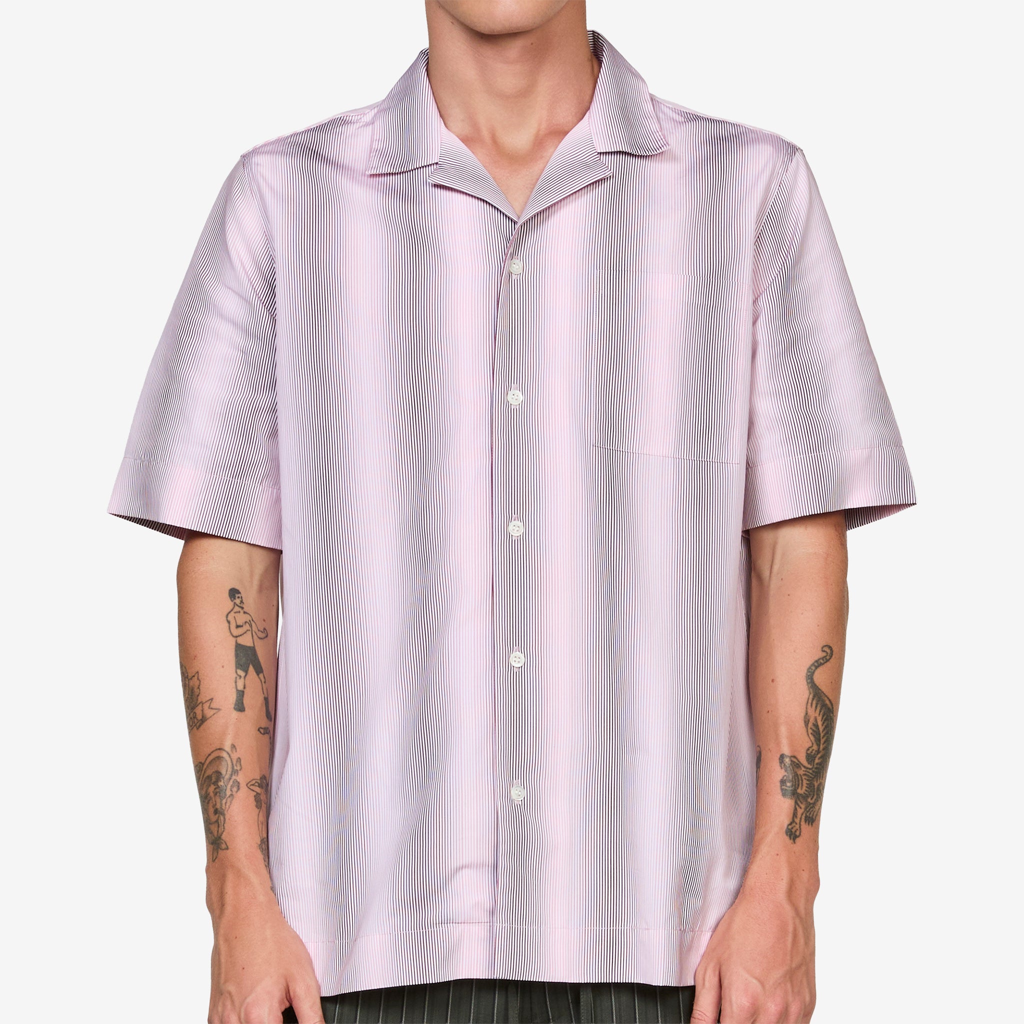 Boxy Shirt in Pink from Dries Van Noten. Regular fit shirt with a camp collar, full-button closure and patch pocket at the chest. Crafted in a boxy silhouette from a crisp cotton. Finished with an all-over gradient stripe pattern.