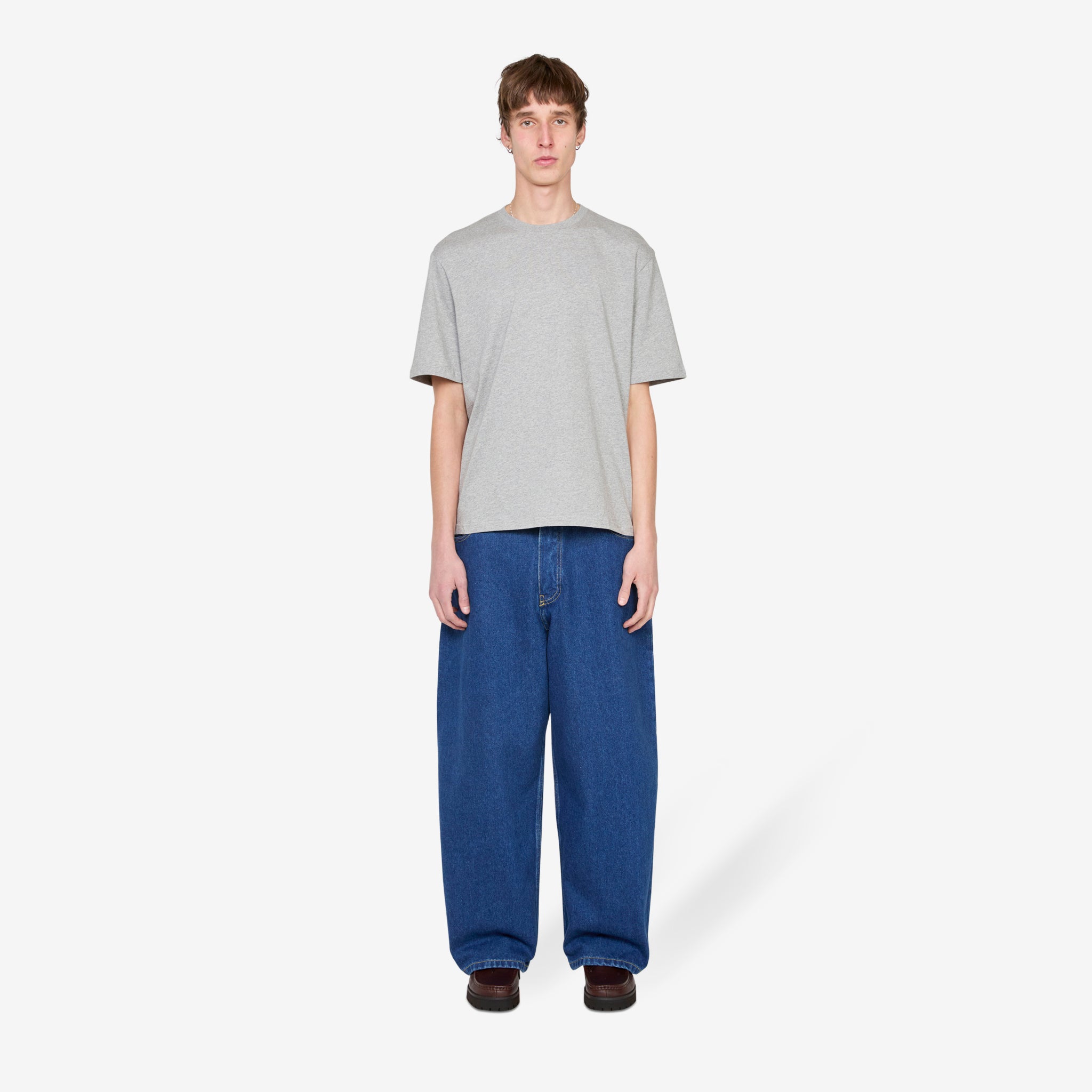 Bric T-Shirt in Grey Marl from Studio Nicholson. Regular fit t-shirt with a ribbed crew neckline. Crafted from fluid cotton jersey and finished with tonal screen-printed branding at the rear neck.
